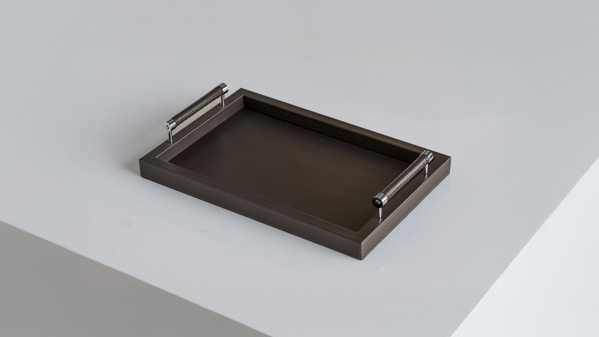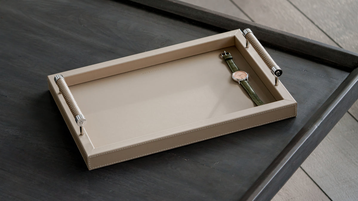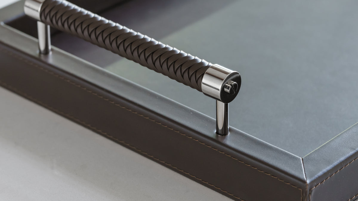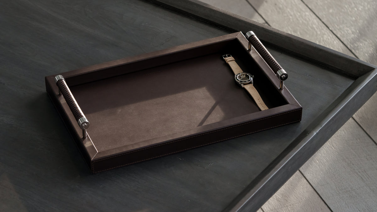 Our exhibition trays are designed to be the ultimate option for showcasing your collection. Unlike valet trays, exhibition trays are made with social occasions in mind, providing a safe and luxurious place for presenting and discussing collections. Handcrafted in Italy and made of the finest materials, these trays both encourage social collecting and serve as a safe, beautiful display of your work at home. Details such as woven leather handles and mirror polished steel supports make these a joy to view or touch.