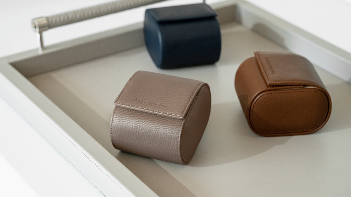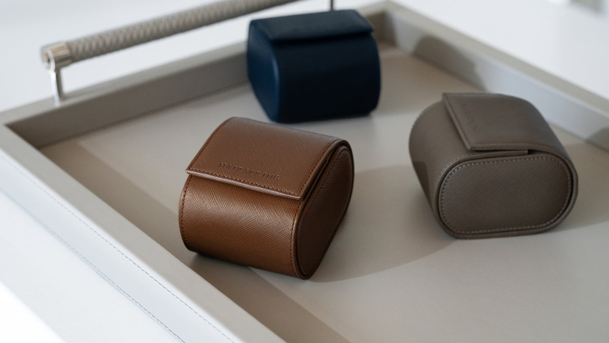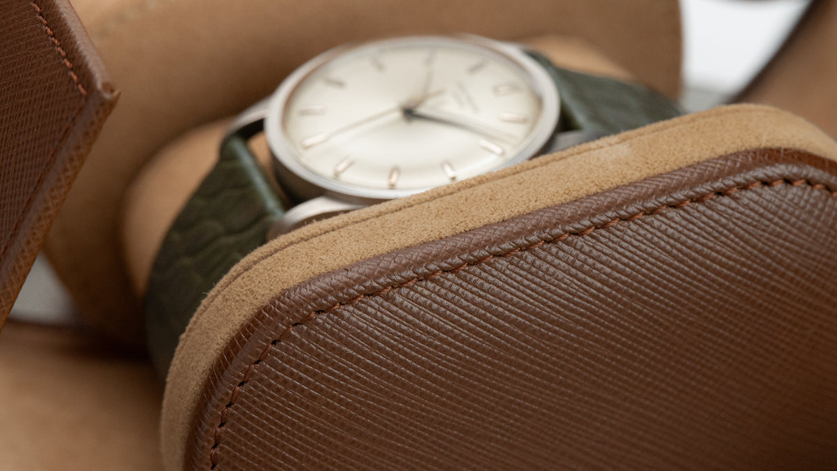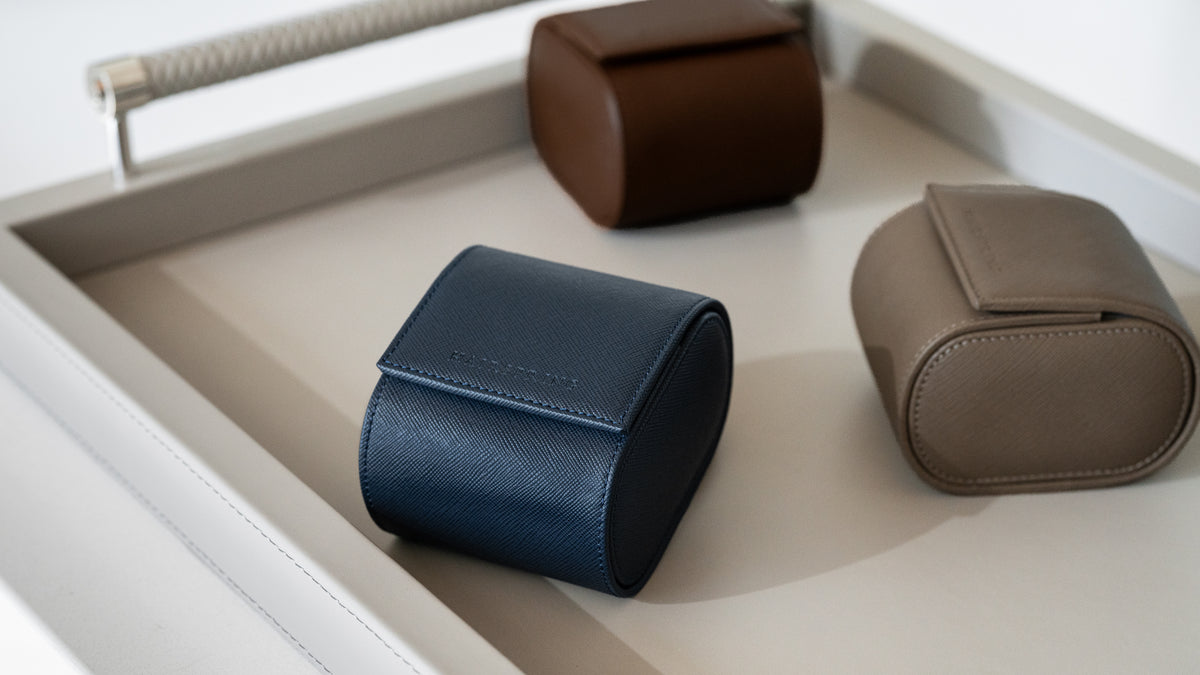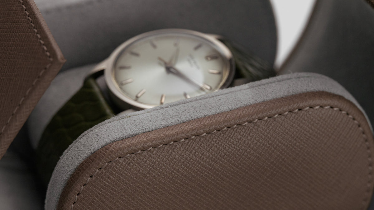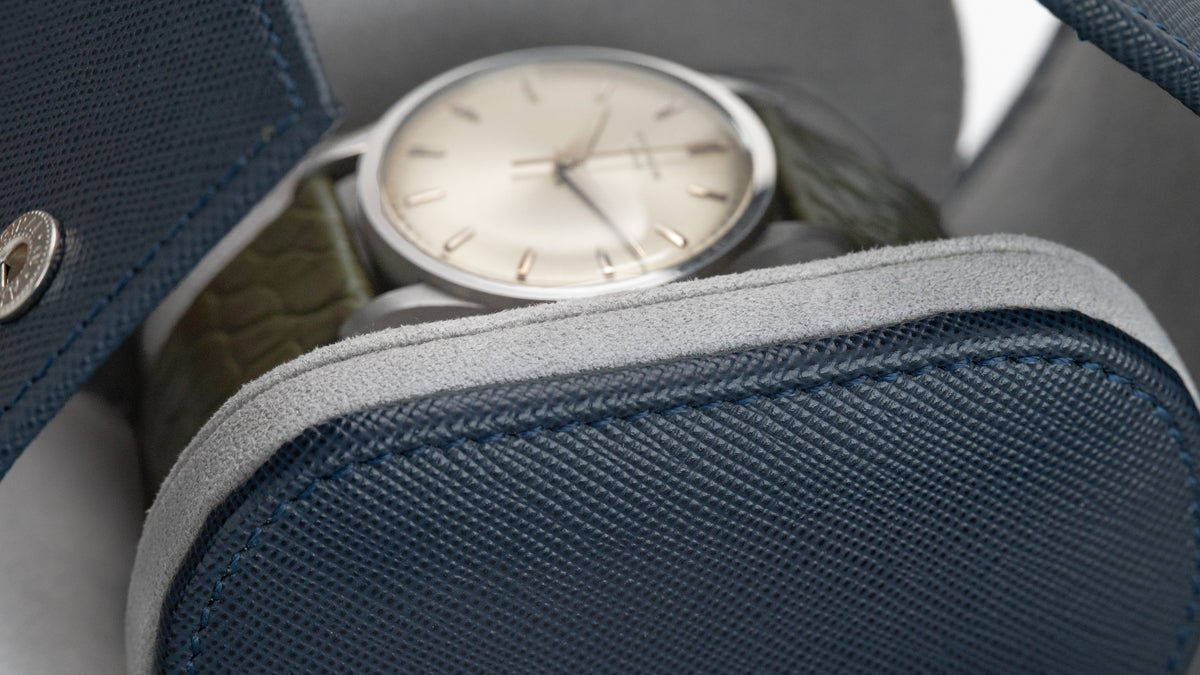 Crafted from premium full-grain calfskin, our single watch roll bears the signature Saffiano crosshatch pattern in very high resolution and deep texture. Saffiano leather, originally used in high fashion, is famed for its durability while providing an elegant look. Opening the double snapped front reveals a genuine Alcantara lining and removable pillows for easy access. The single watch roll is the perfect case when packing light for a weekend getaway where an additional watch is desired.