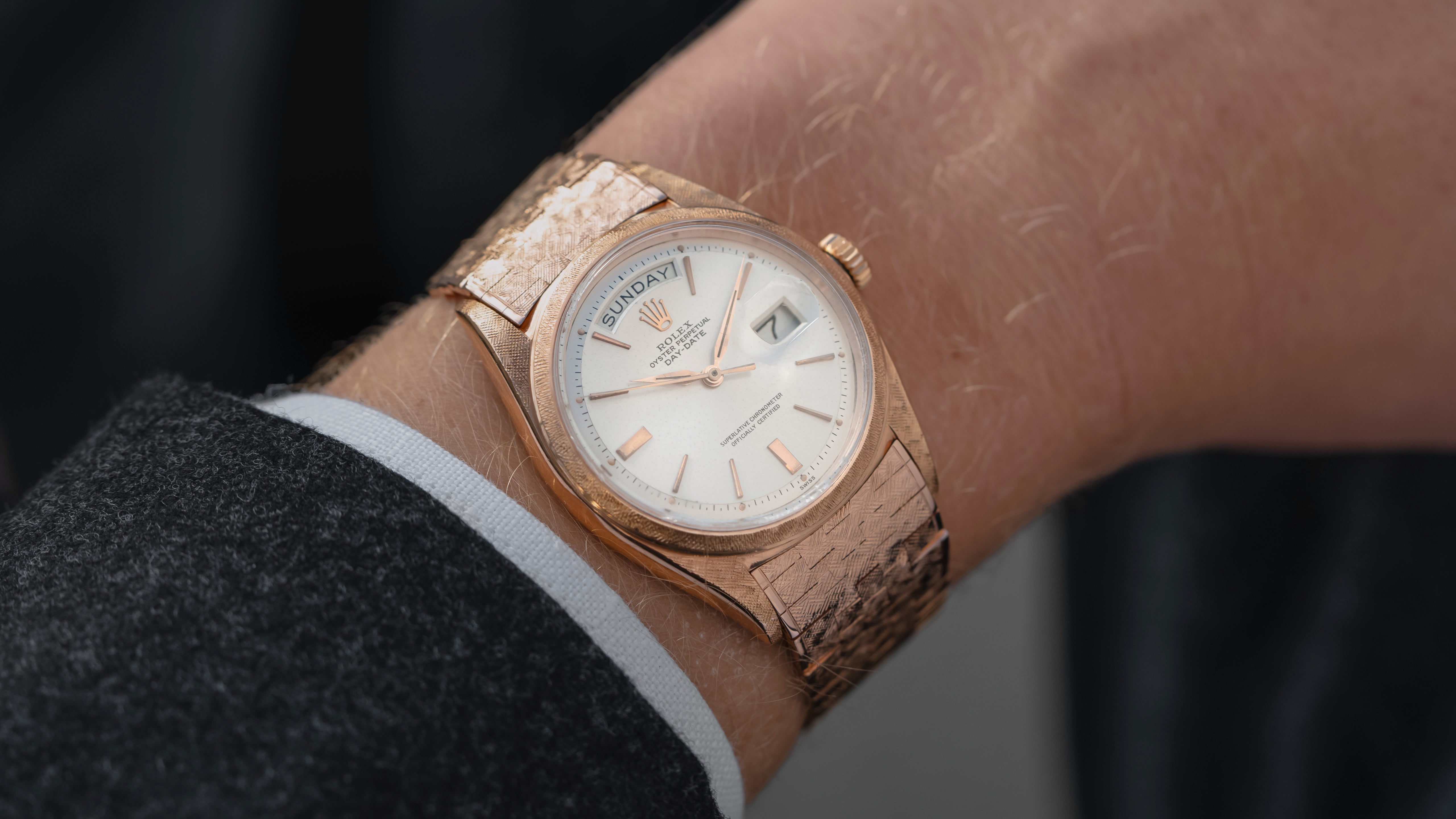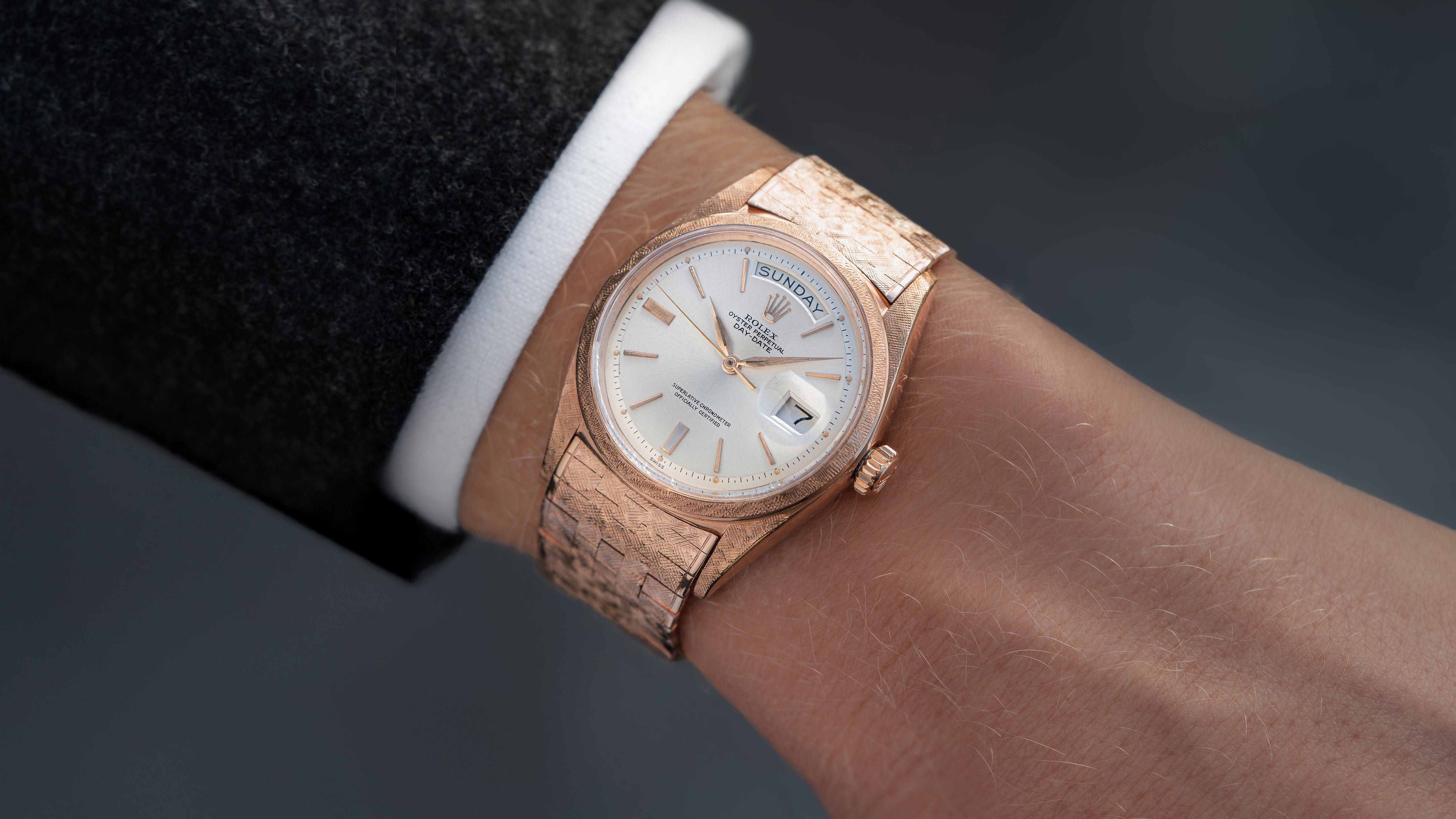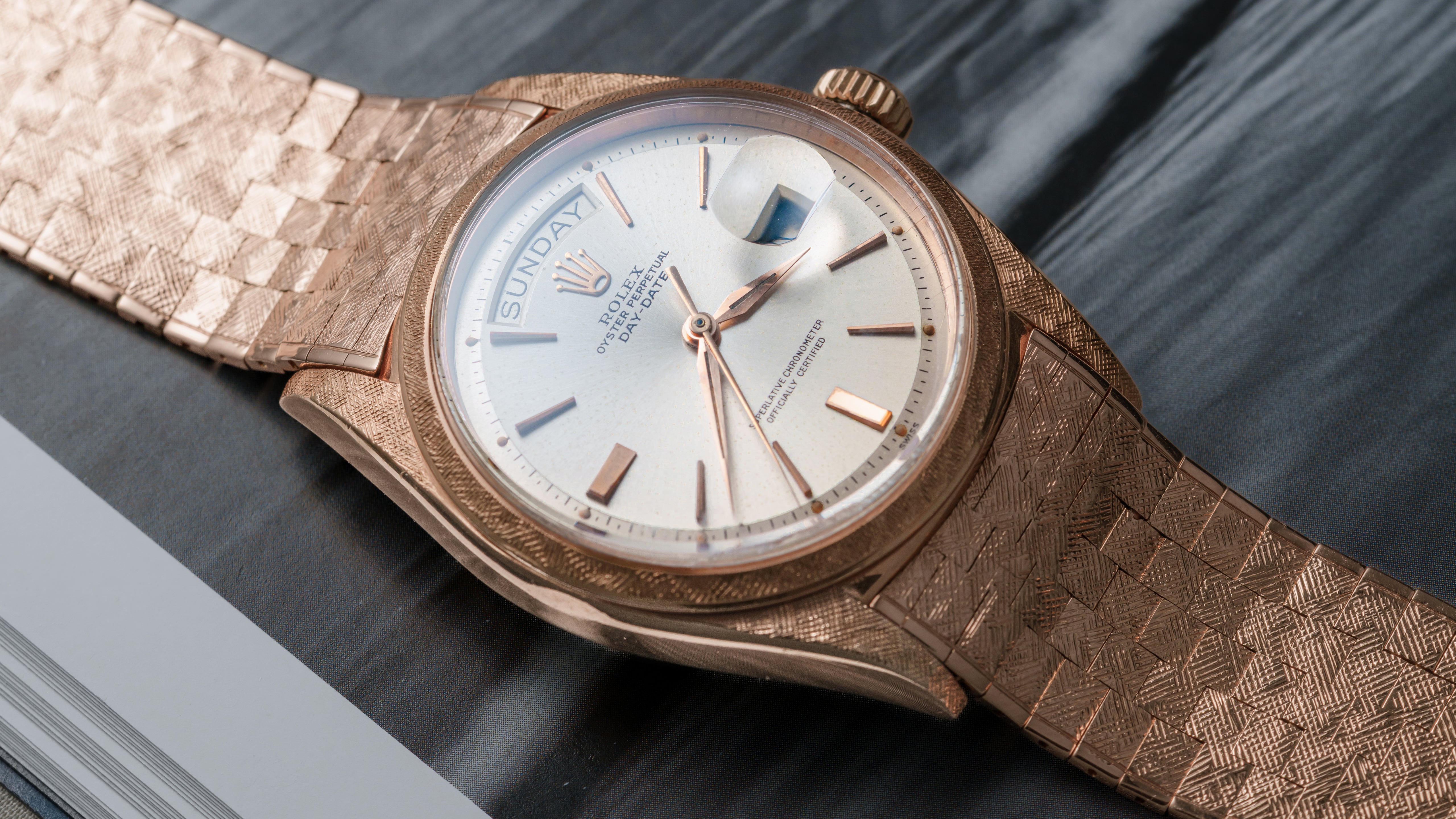 A ref. 1806 Day-Date in pink gold with rare factory ‘Florentine’ finish and matching original bracelet. The finishing, a hand-engraved crosshatched pattern was applied by Rolex to select dress watches as a more casual option. However, it has now become highly-desirable due to its rarity and unique aesthetic. This silver ‘Soleil’ dial features a ‘Swiss’ only signature, doorstop indices, and alpha hands, all indicating early production within the 18XX series where the Day-Date became synonymous with status.