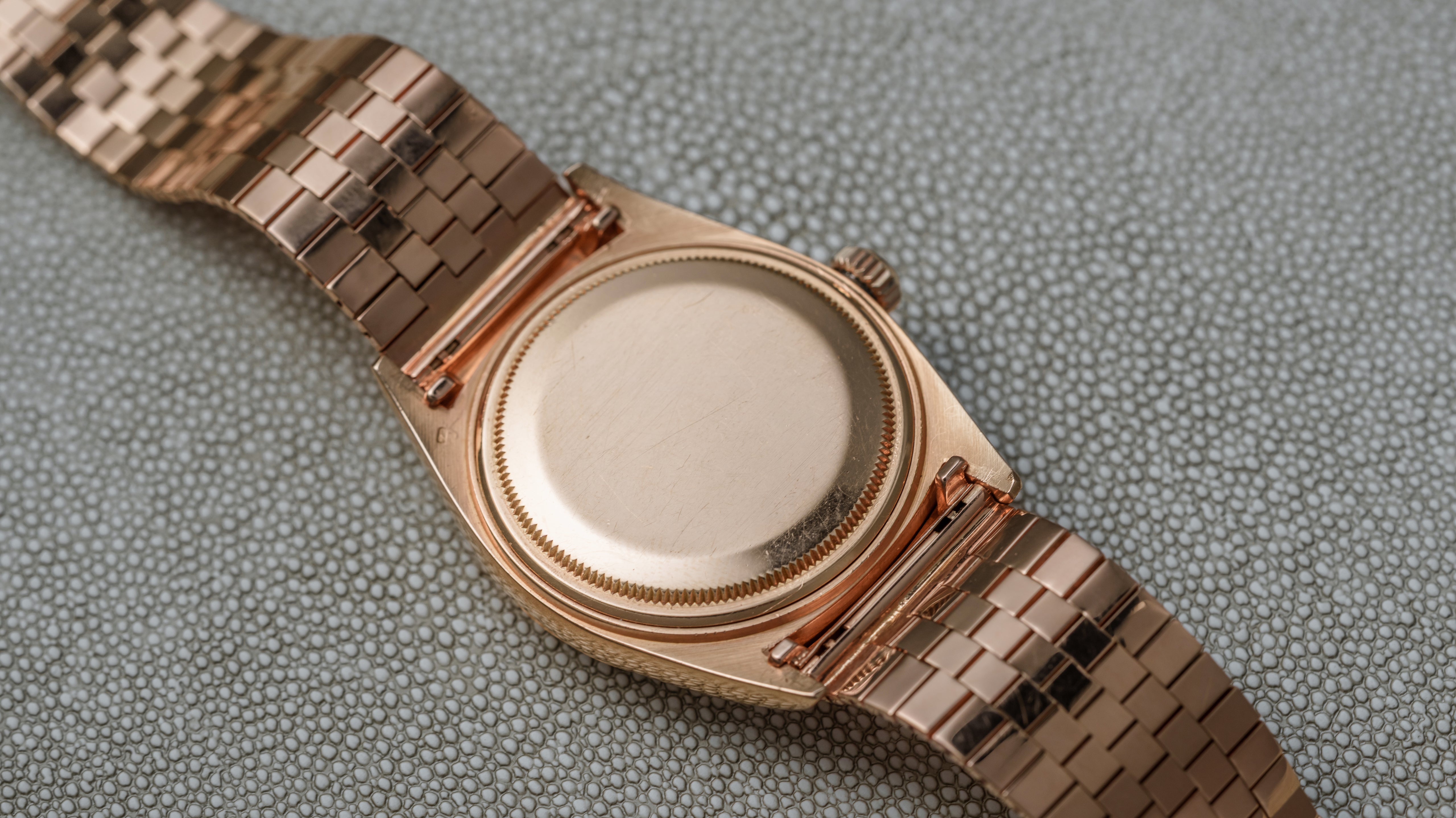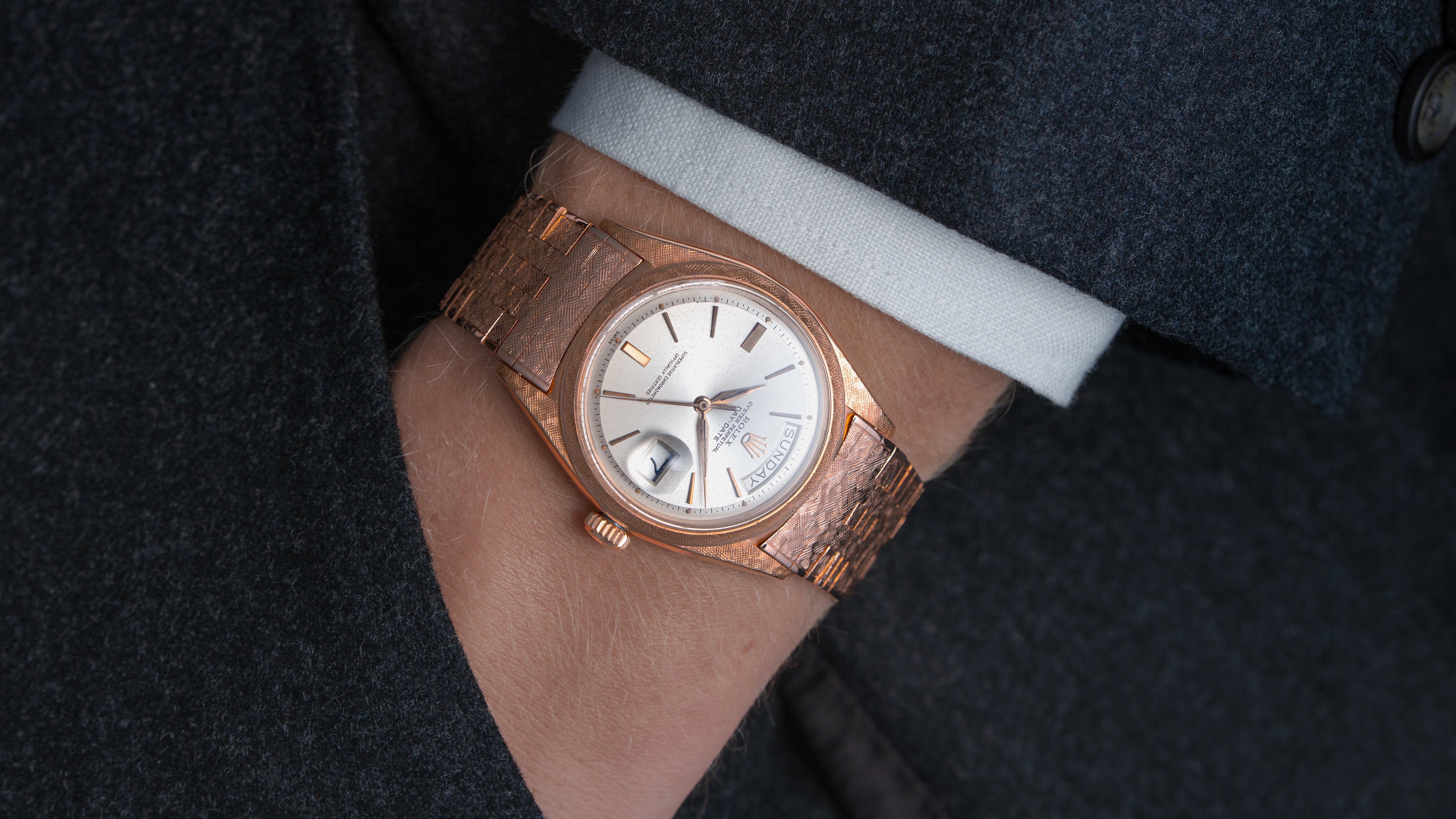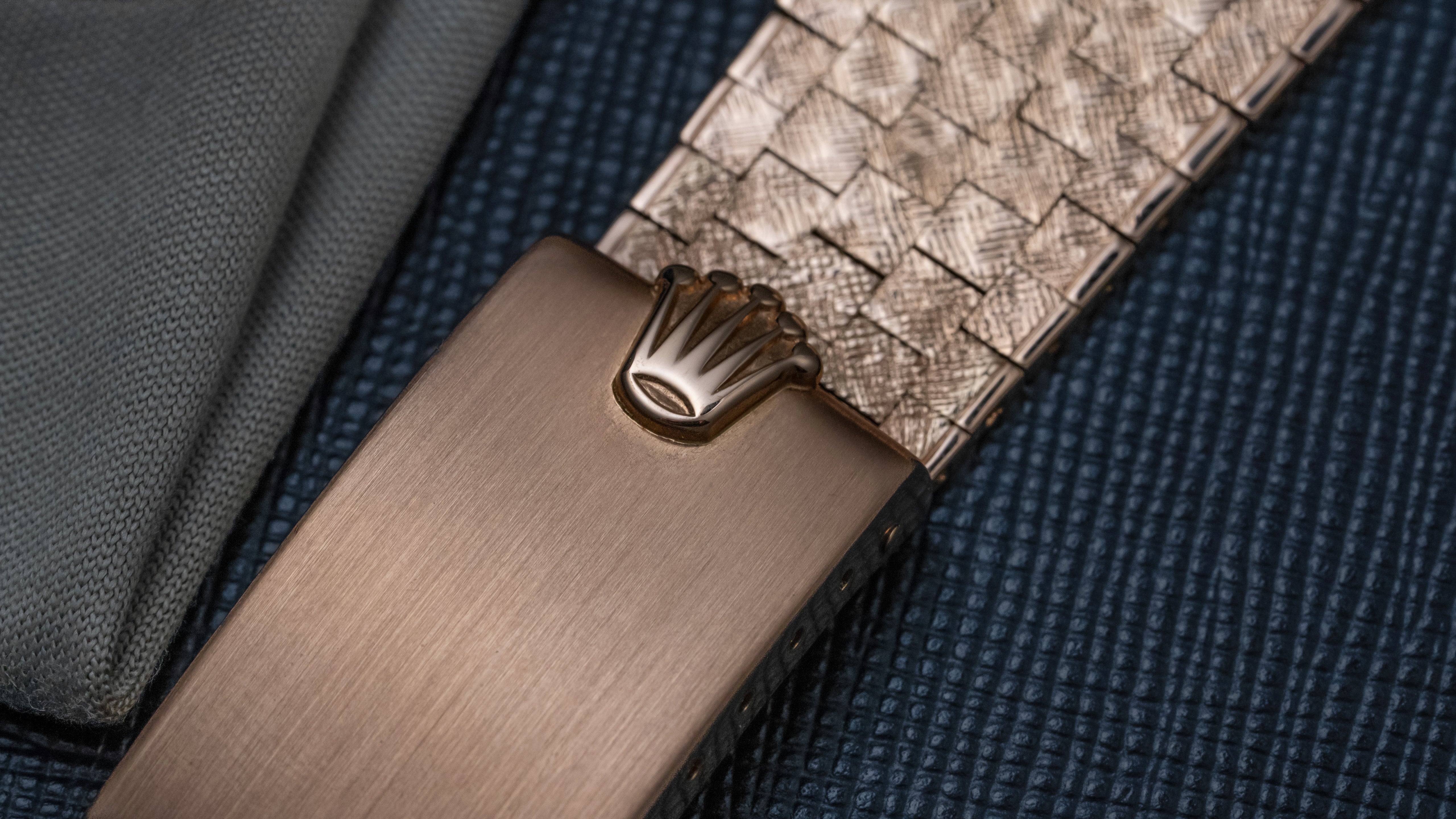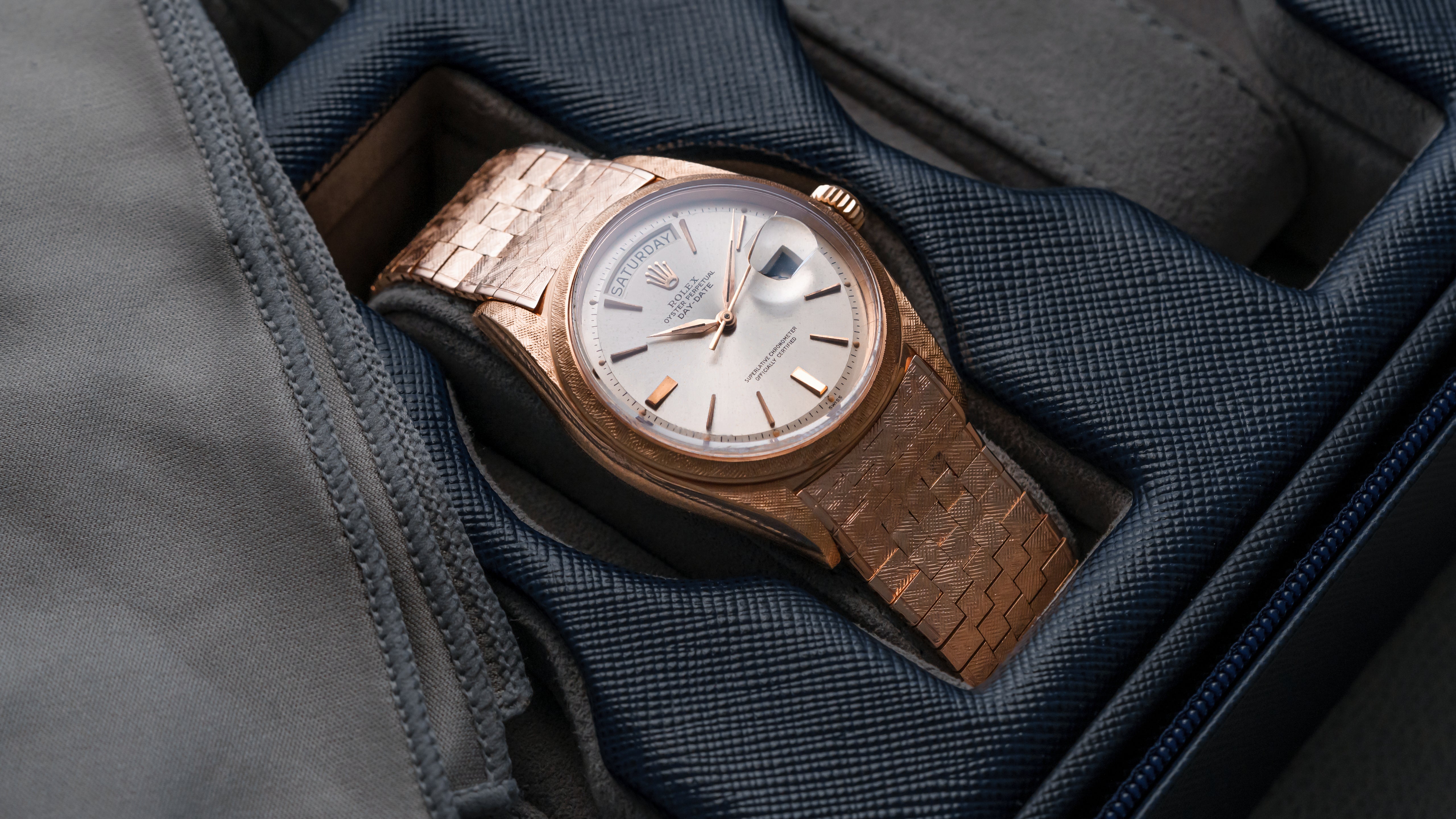 A ref. 1806 Day-Date in pink gold with rare factory ‘Florentine’ finish and matching original bracelet. The finishing, a hand-engraved crosshatched pattern was applied by Rolex to select dress watches as a more casual option. However, it has now become highly-desirable due to its rarity and unique aesthetic. This silver ‘Soleil’ dial features a ‘Swiss’ only signature, doorstop indices, and alpha hands, all indicating early production within the 18XX series where the Day-Date became synonymous with status.