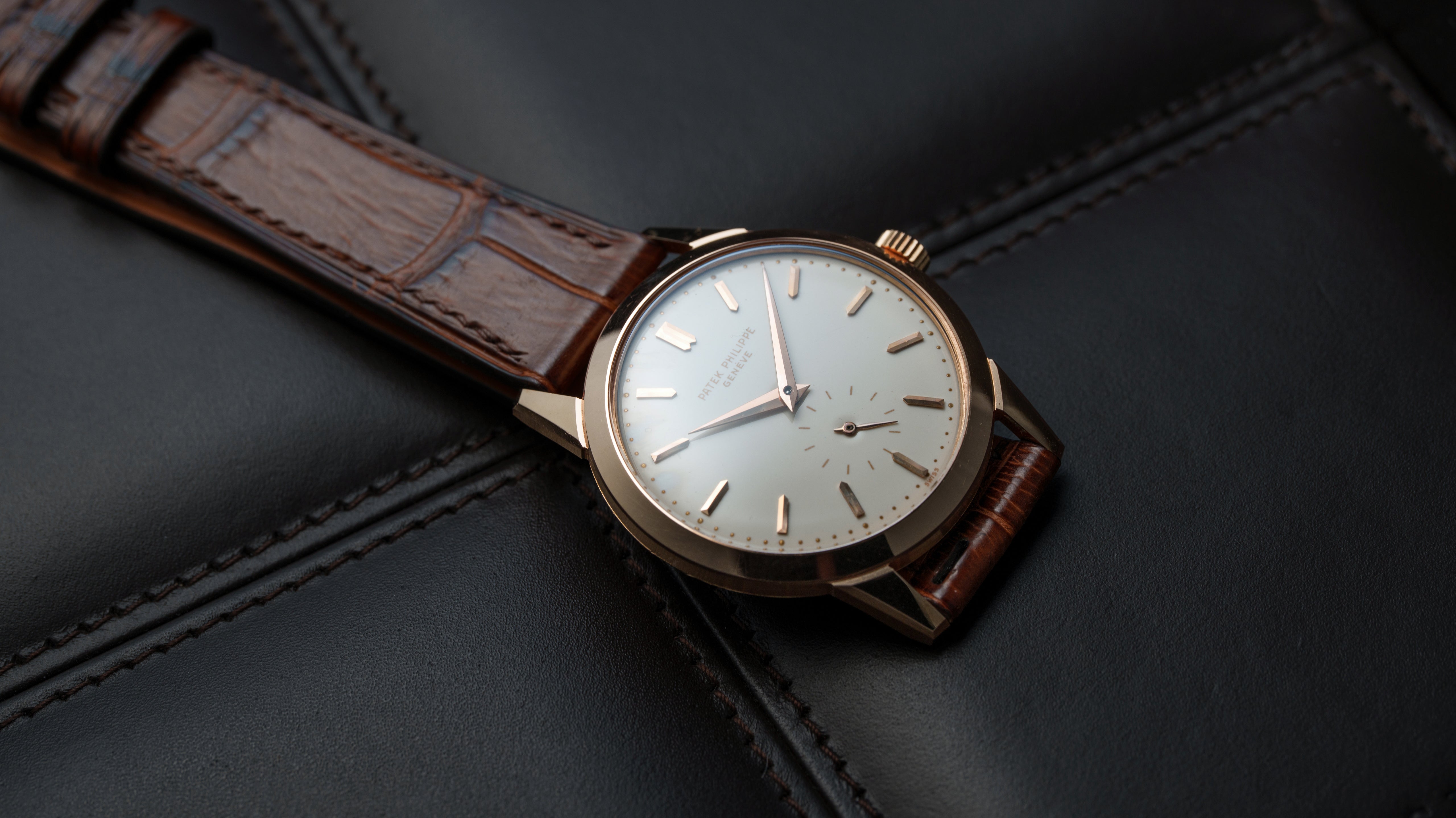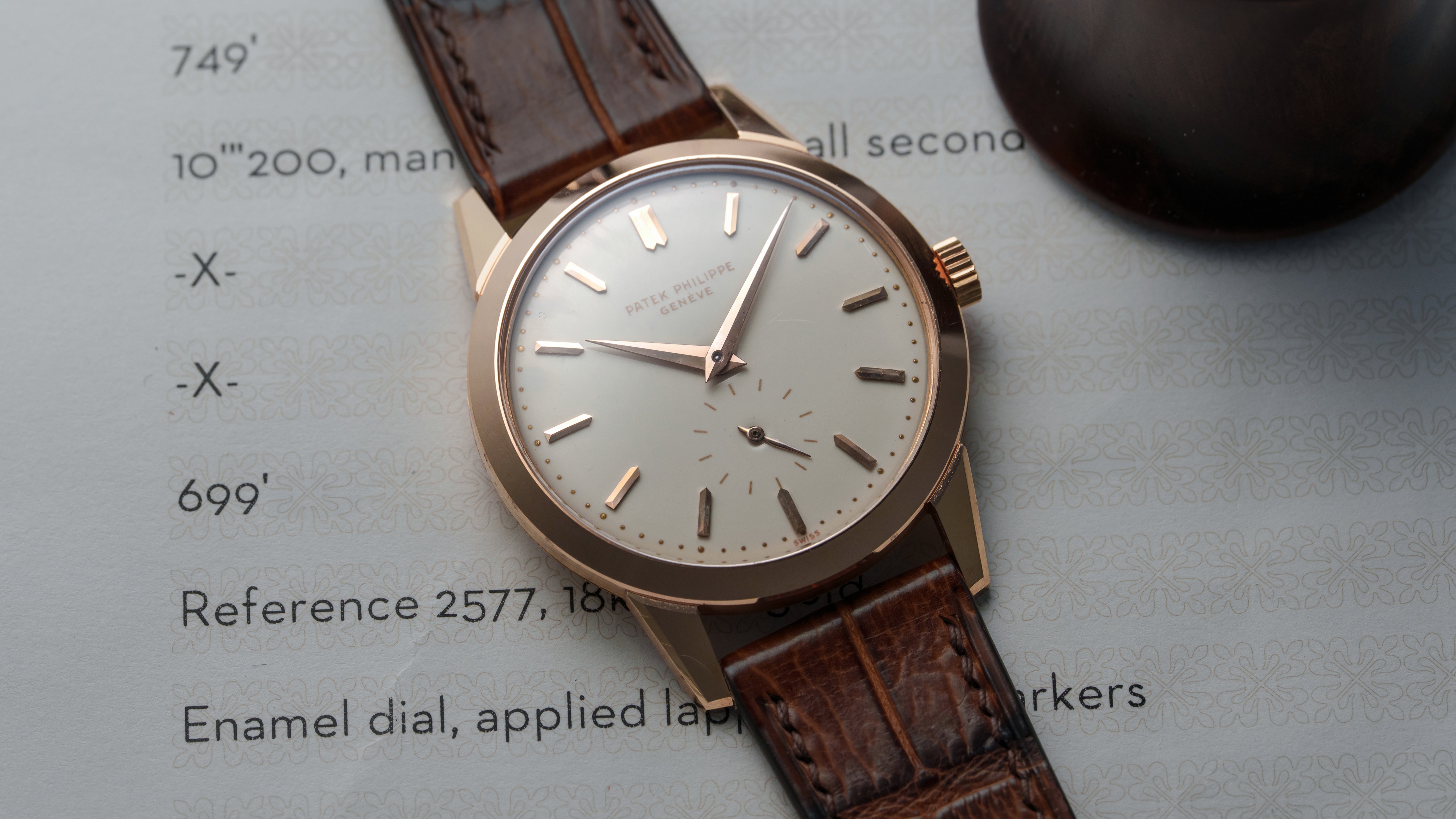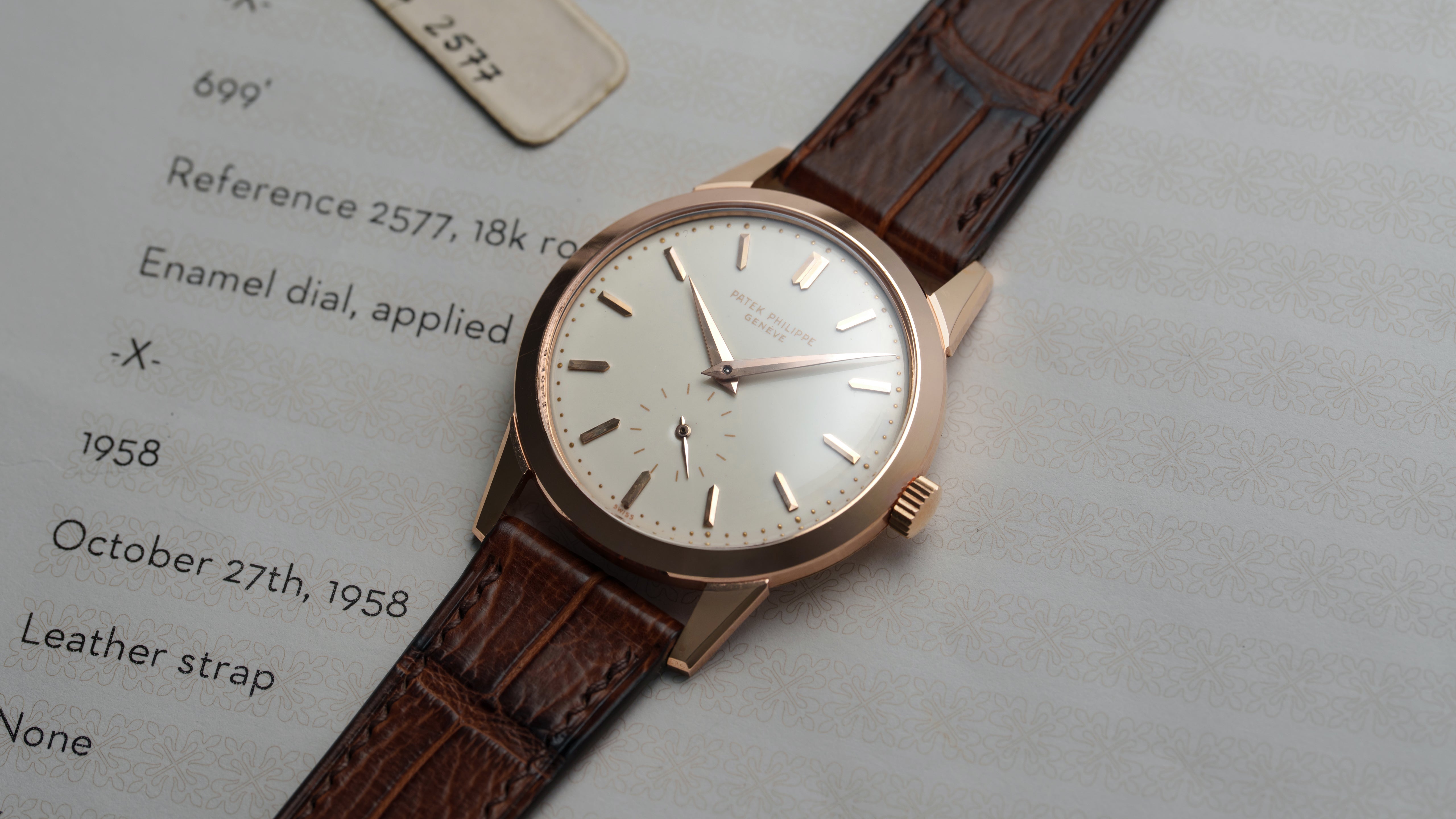 A ref. 2577 in pink gold, 1 of 4 examples known and the best-preserved by some margin. The 2577 is an elusive and esoteric reference, with just twelve examples known in total. In addition to the 2526 and its successor the 3428, it is the third Calatrava to feature a grand feu enamel dial. With two thick layers and a silver base, the tone of this dial is a warm cream. Unlike the 2526, the 2577 is a manual calibre 10-200, which allows for a case just 7.65mm thin without crystal. That case is entirely unique to the 2577, with faceted lugs and a snap back. The 2577 is one of the most special and little-seen Calatravas made amongst the enamel dial references.