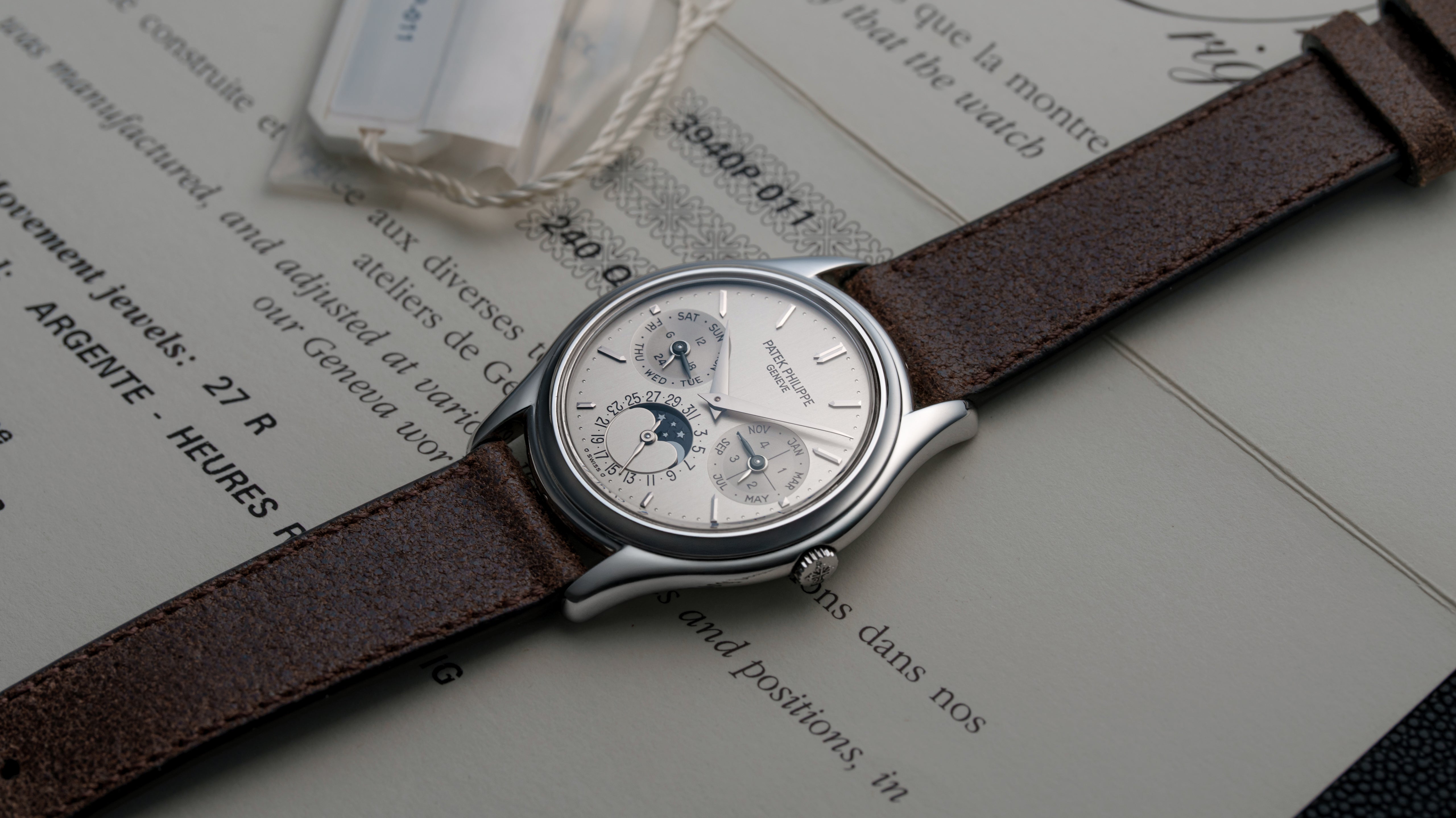 A ref. 3940P from the Third Series with a silver moon and incredible case condition, preserved in its full set. The first Patek Philippe Perpetual Calendar made at scale, the 3940 is serious complication made simple at 36mm. Its revolutionary micro-rotor calibre 240Q is a masterpiece of micro-engineering, just 3.75mm thin. Of all 3940 production, platinum is the rarest metal. Only platinum examples preserved the solid caseback-only tradition through production.