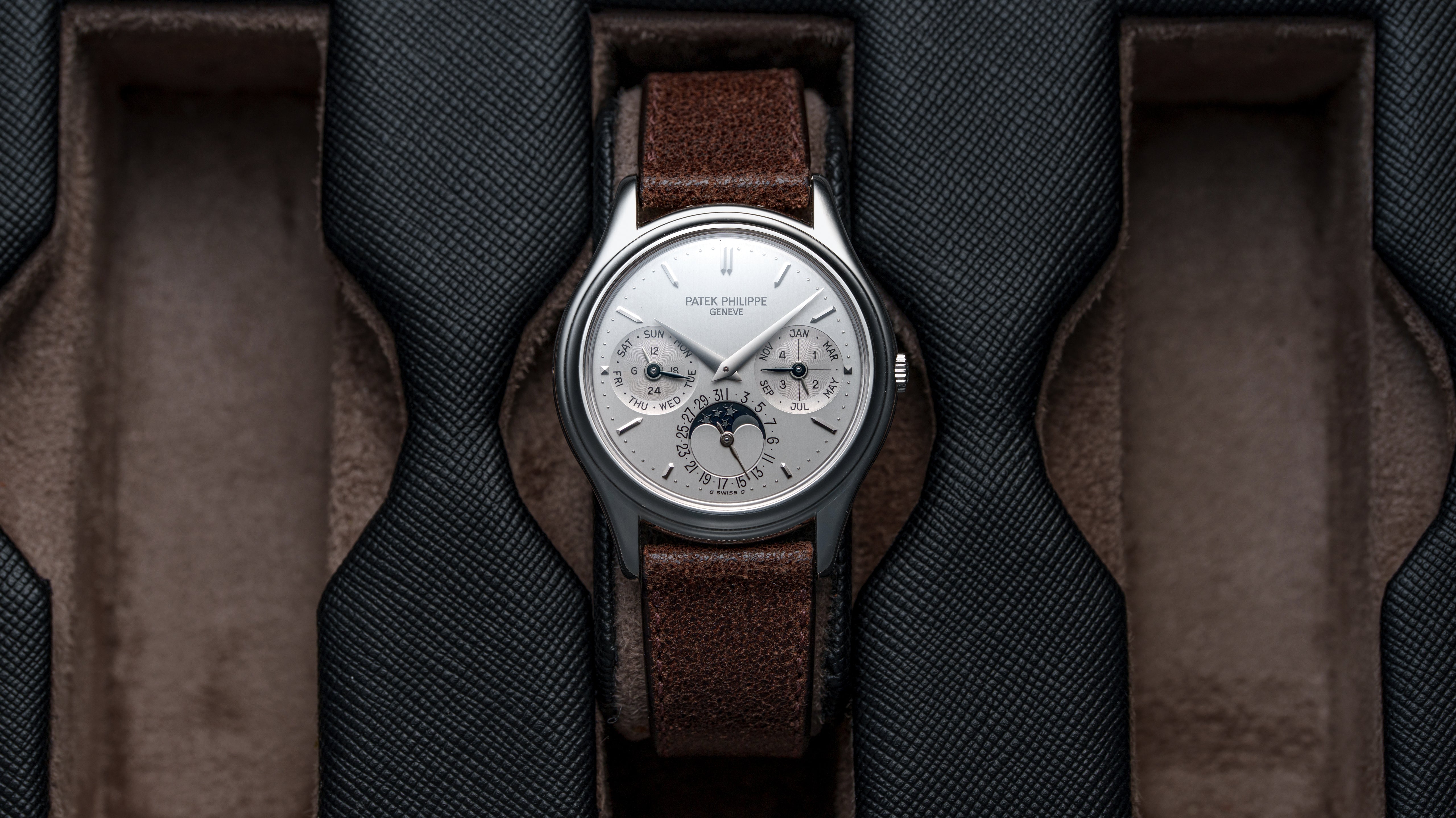 This 3940P-011 presents in exceptional overall condition. Its case is miraculously preserved, with perfect hallmarks and only very light signs of wear. The dial, comparably, is excellent with no signs of damage and only very light patina starting to develop in the 24-hour counter. It comes with its original set and all included materials, down to the hang tag. It will be sold with its original strap and platinum deployant clasp.