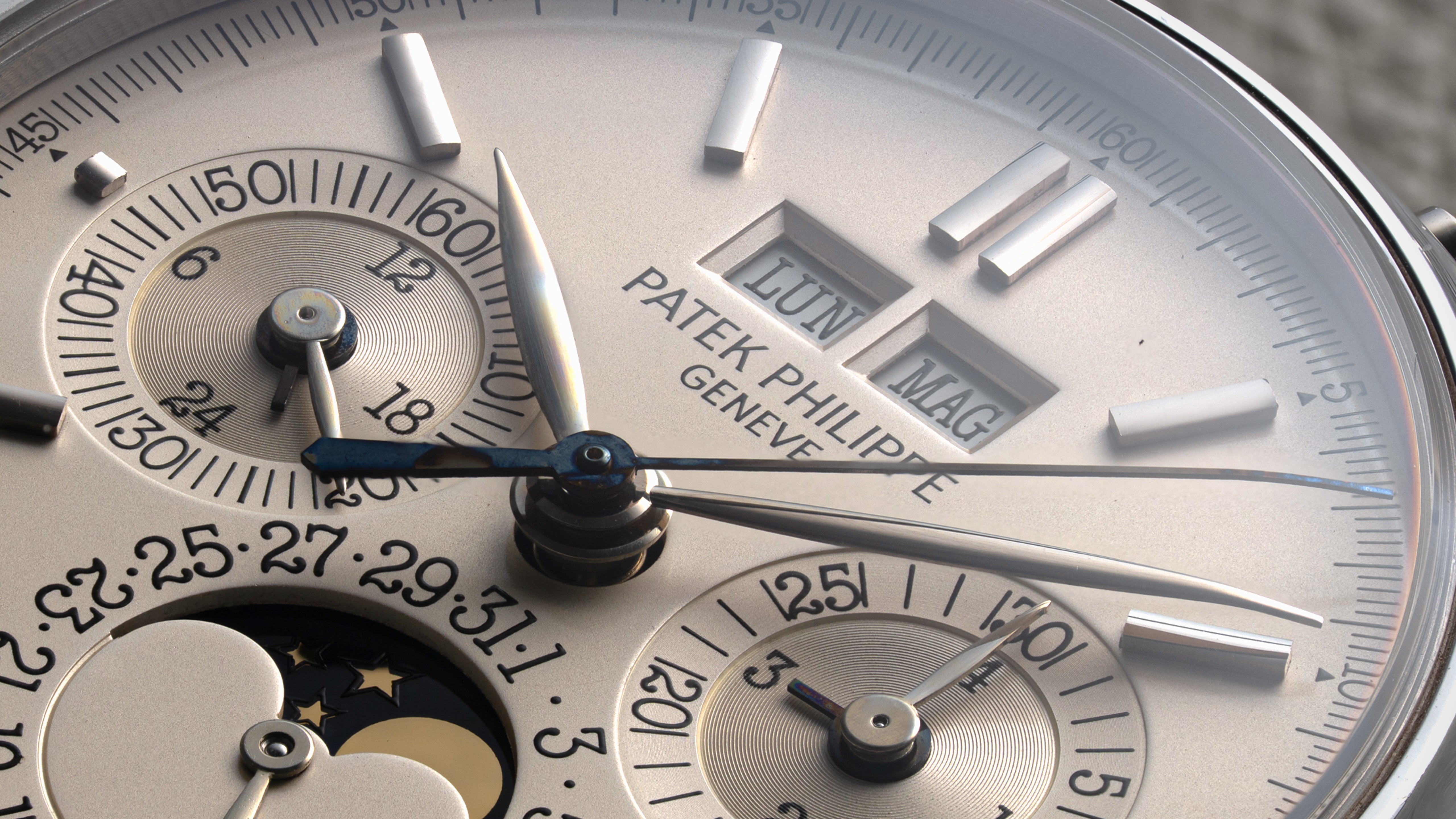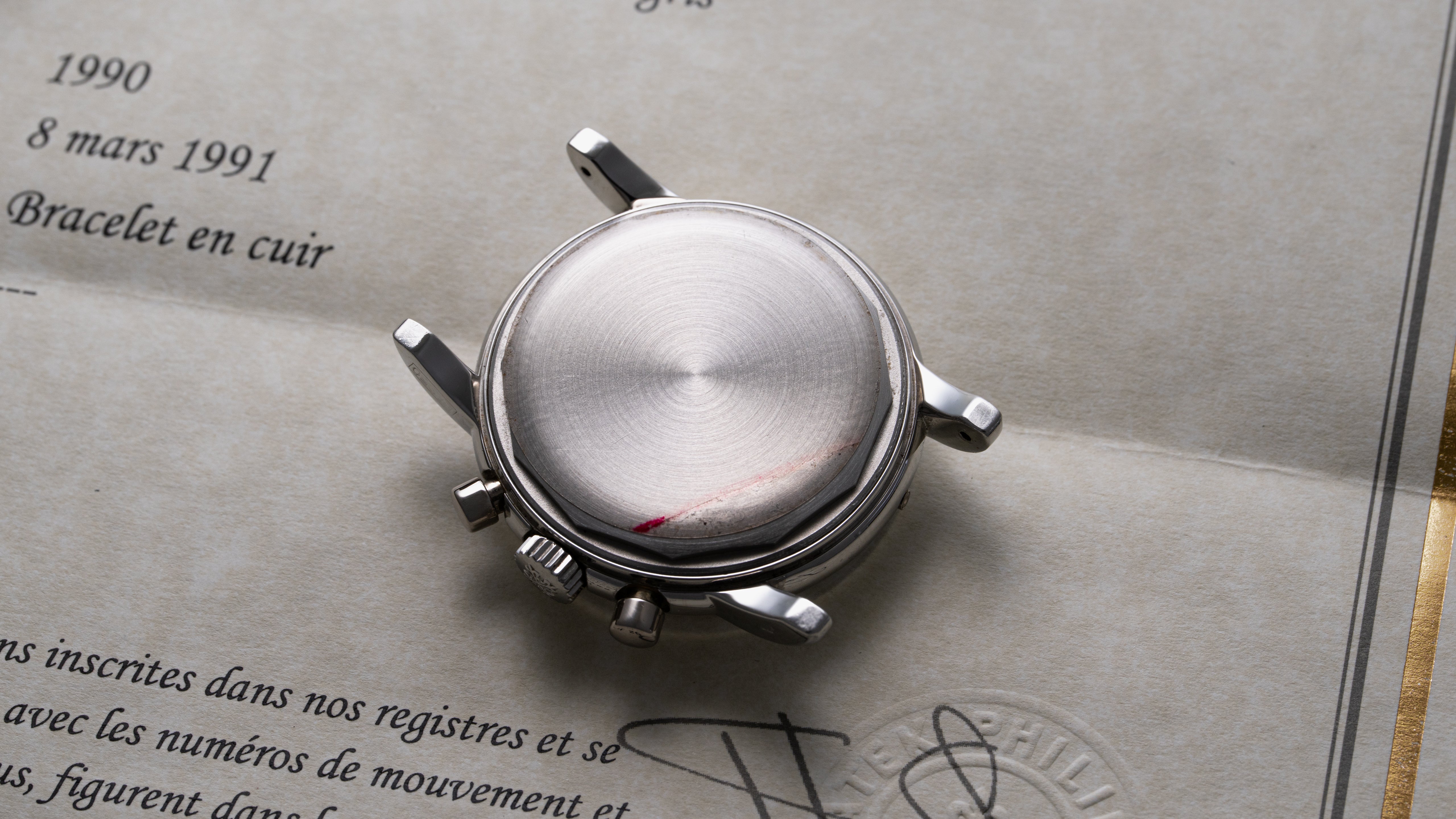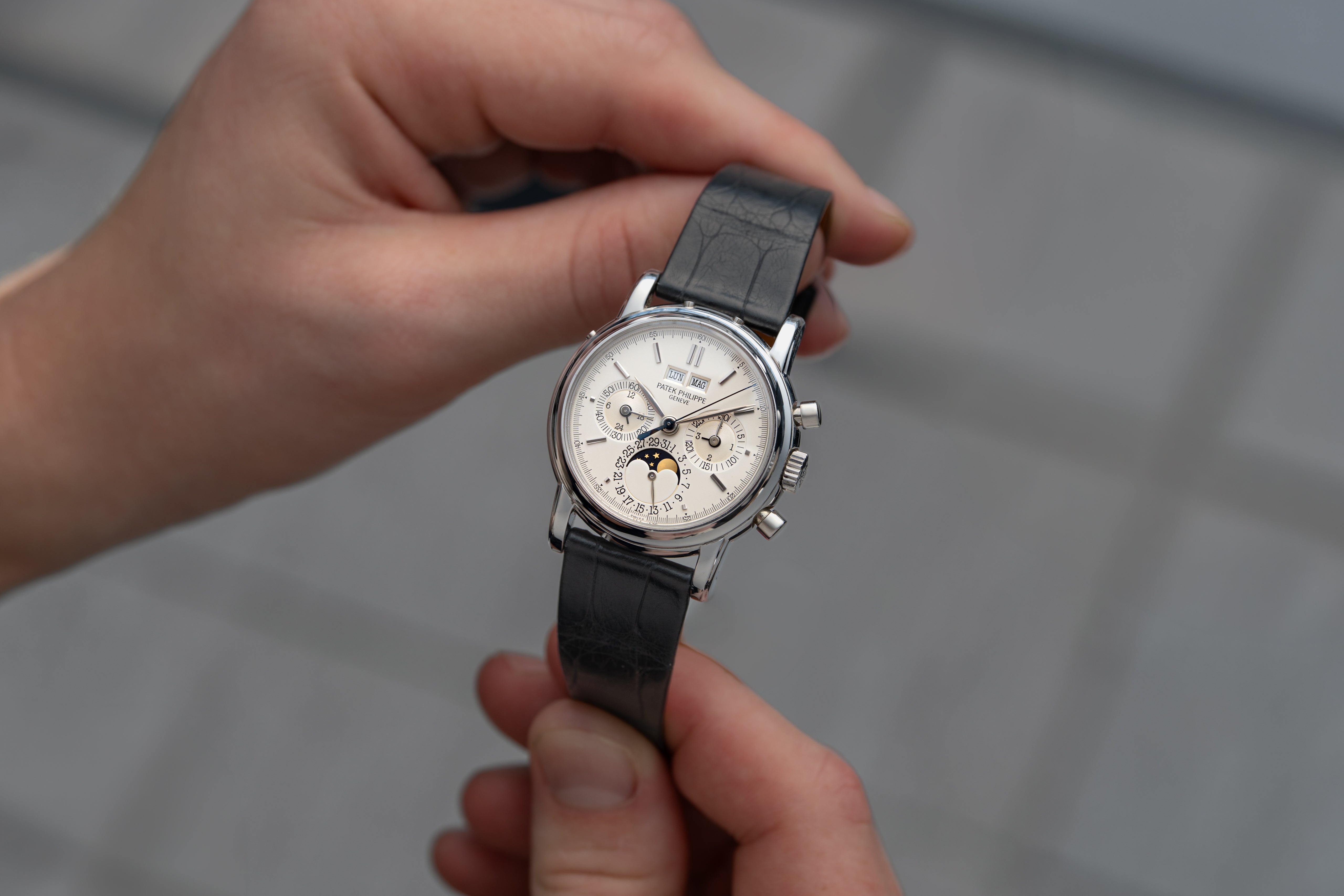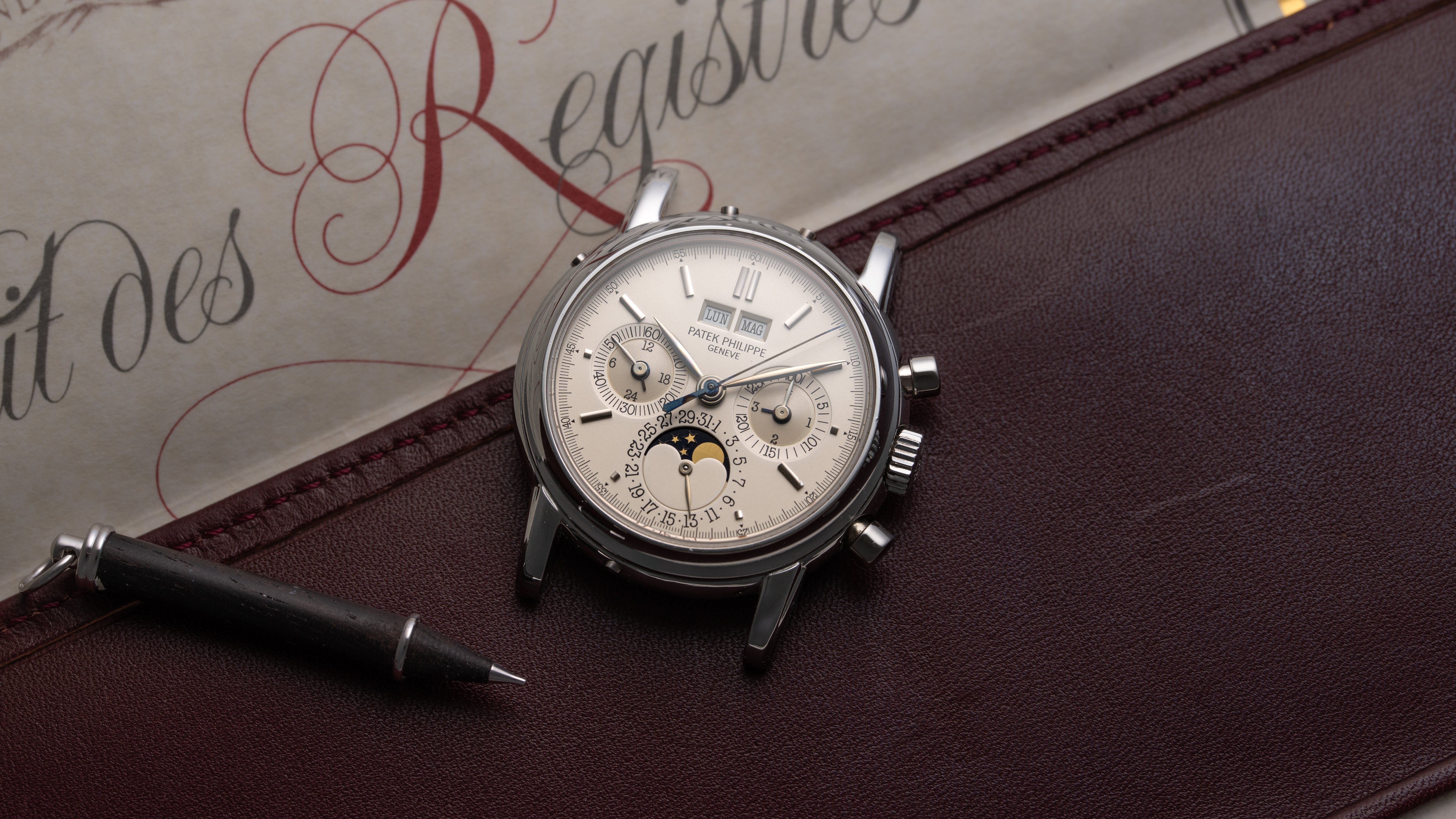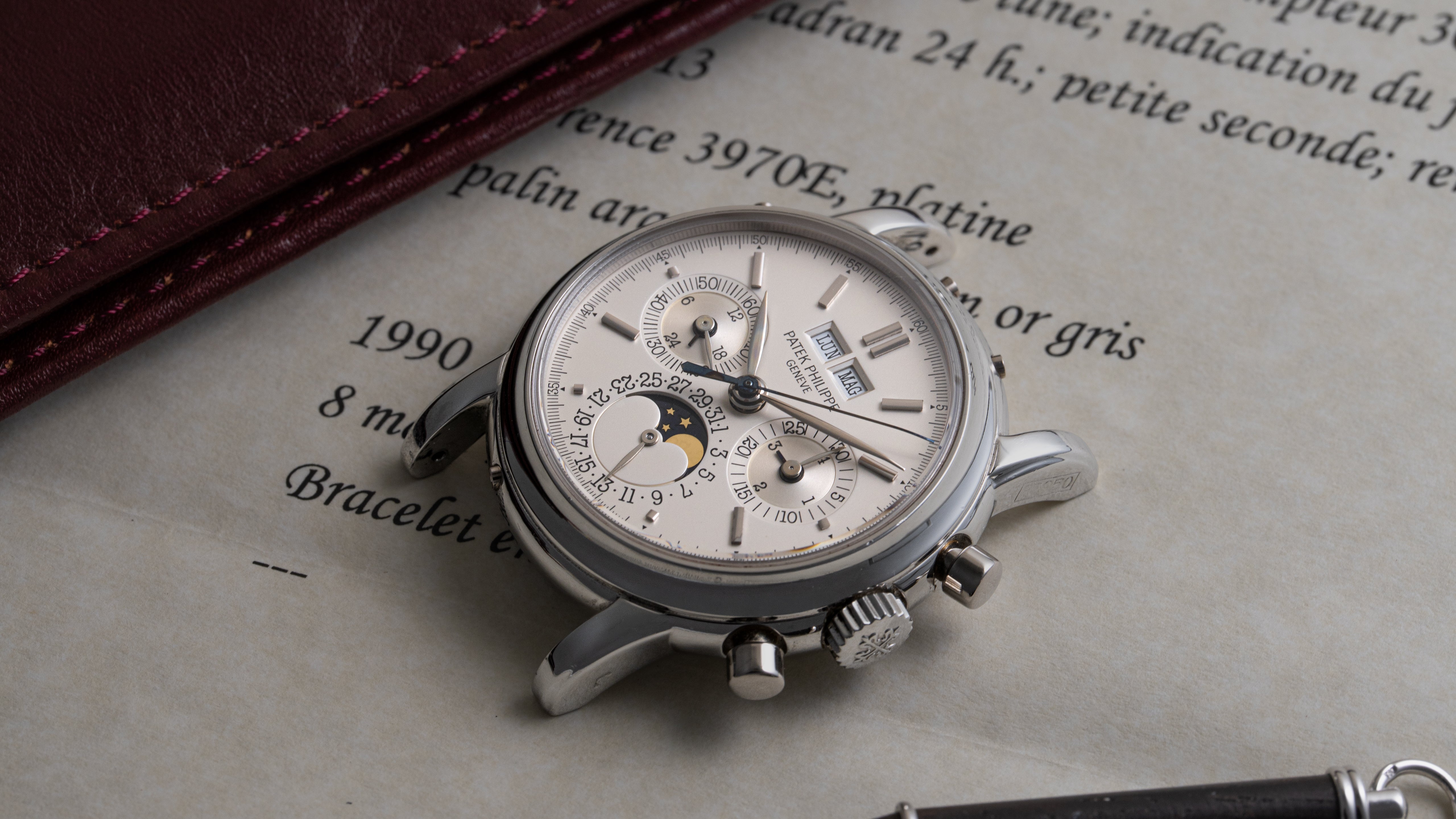 A Second Series 3970 in platinum, the singular known example combining an Italian calendar with the desirable Big Hallmark. Just 11 Second Series examples were produced in platinum, the rarest standard production metal, only two in Italian. The rarity of this configuration is matched by that of its condition, its case and dial unrestored and exceptional. The 3970 succeeded the 2499 in 1986, the most significant contribution of Philippe Stern’s tenure over the brand. It features a 36mm Ateliers Réunis case, Lemania ébauche calibre CH 27-70 Q, feuille hands of Early Series, ‘American Typewriter’ font, and warmer Argenté dial of Early Series. It is the Perpetual Calendar Chronograph that did more with less; despite a smaller size and greater degree of information displayed than the 2499 that preceded it, the 3970 succeeded in making immense complication not just easily understood, but beautiful.