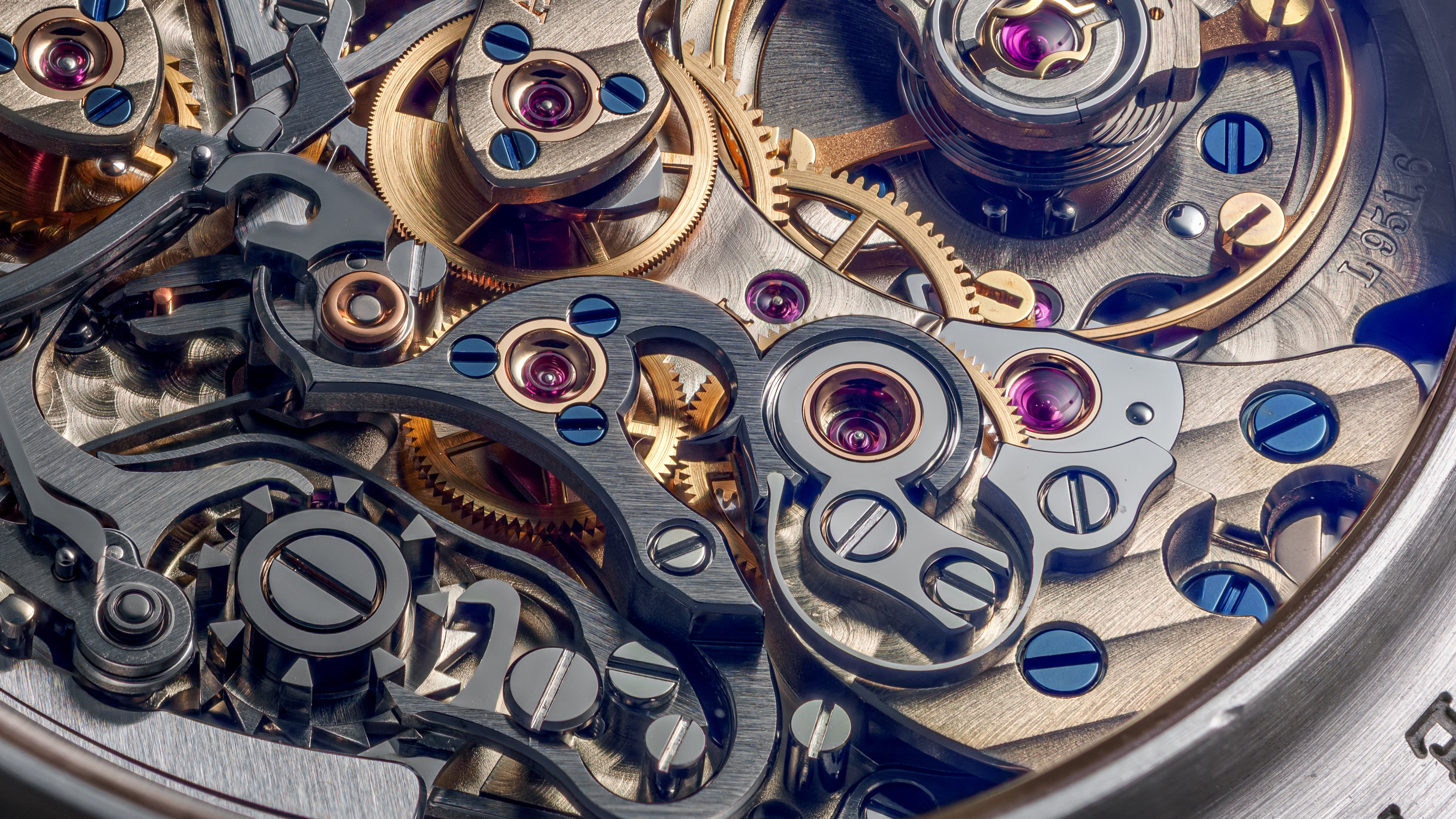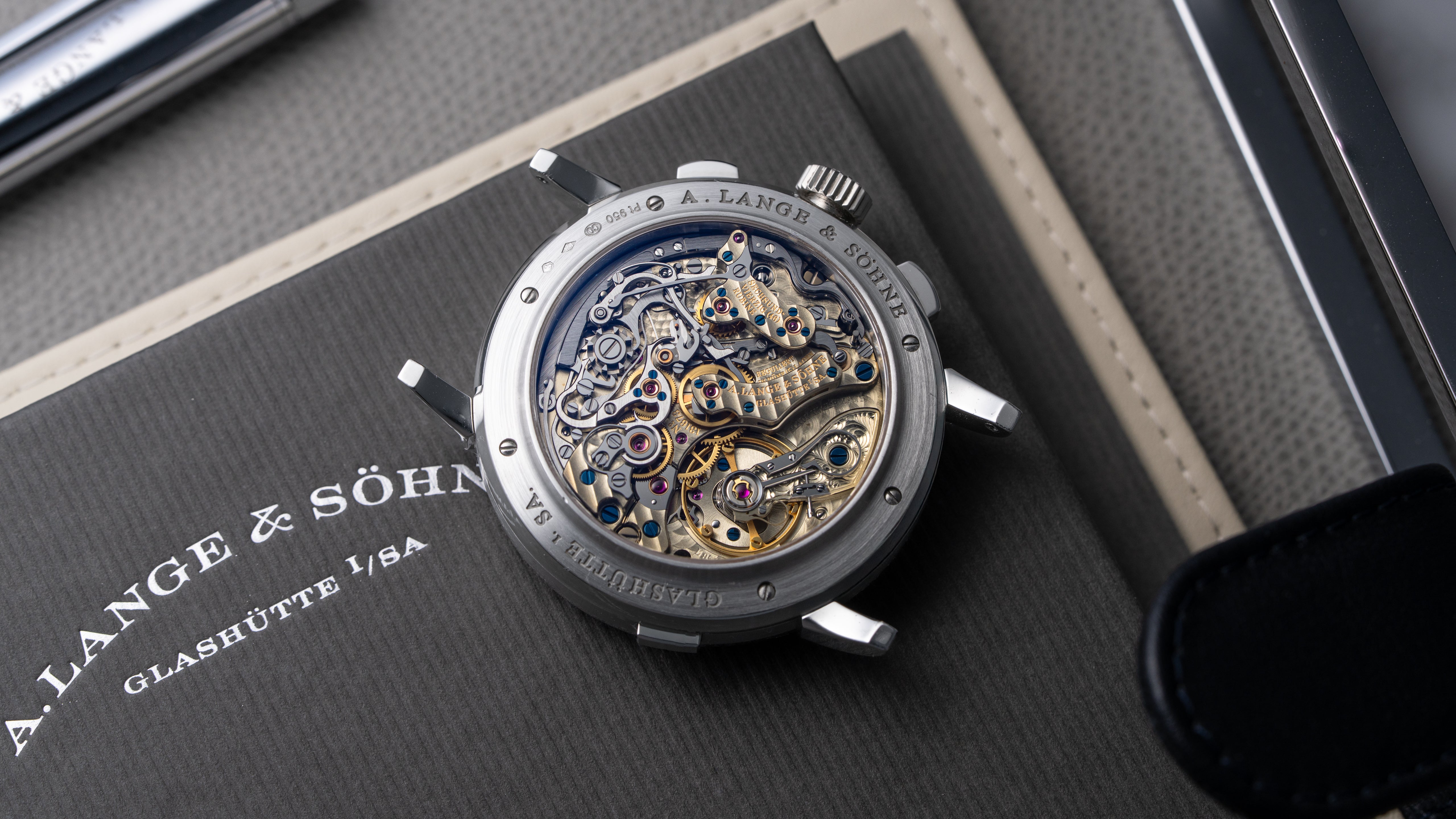 The First Generation Datograph, ref. 403.035, Lange’s first chronograph. Debuting the L951.1 calibre at 1999 at Basel Fair, it solidified A Lange & Söhne as a serious contender in complicated watchmaking. Its dial, designed by Günter Blümlein and Reinhard Meis, featured a Germanic approach to beauty, mathematically defined symmetry. The sub-registers were lowered from their traditional location to form an isosceles triangle with the large date window at 12. A second inverted triangle formed between Roman numerals at 10, 2, and 6 provided balance. The layout prompted a novel movement design by Annegret Fleishcher (her first ever chronograph) in order to meet the unique prescribed layout. Fleischer stated later that the movement was intentionally designed to be visually beautiful as well as functional, an approach seemingly at odds with traditional Teutonic design. Depth and flourishes of curvature were introduced into the calibre's architecture to provide this visual depth, prompting the calibre’s nickname during its 5 year development timeline, ‘the Cathedral.’