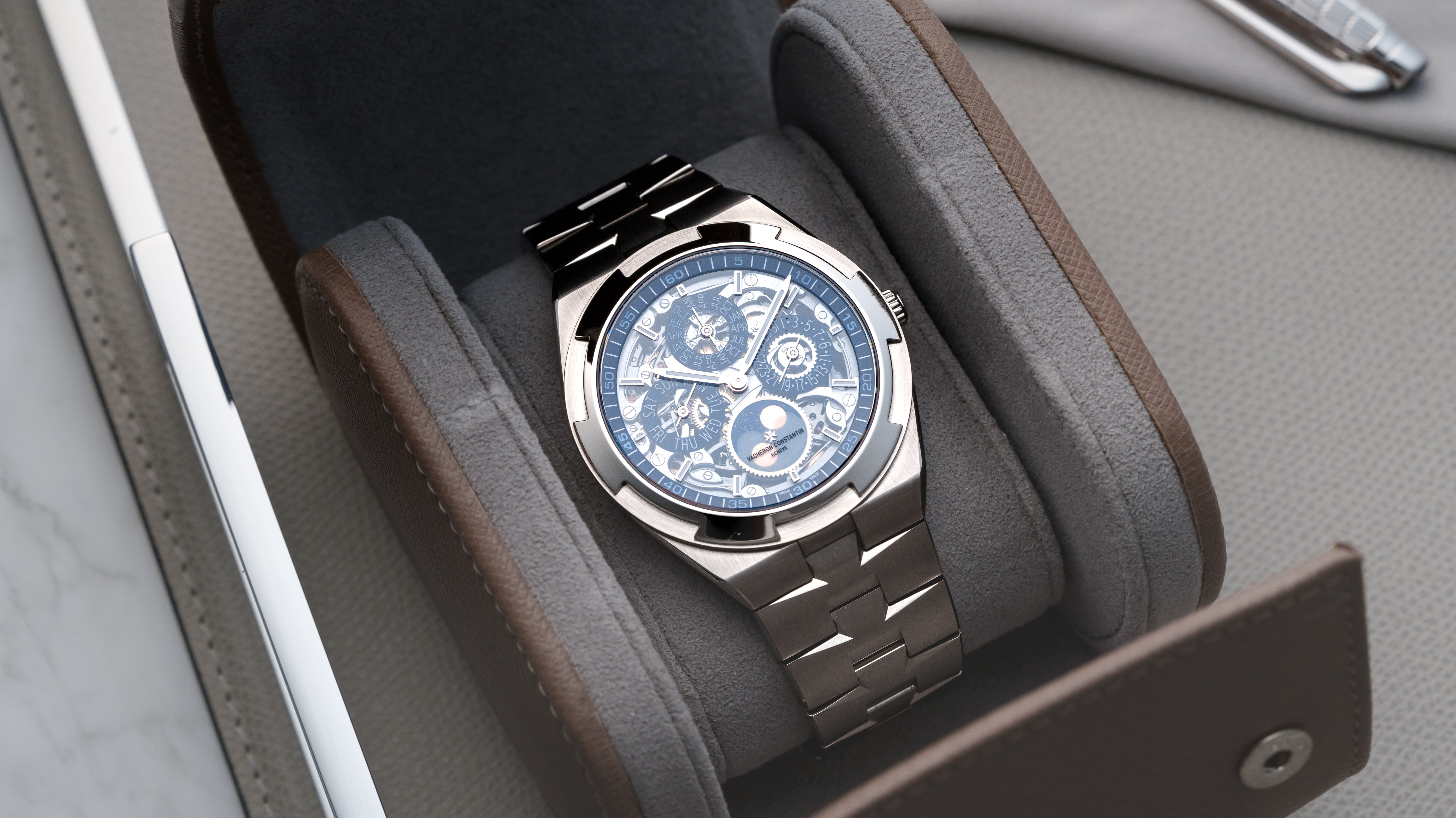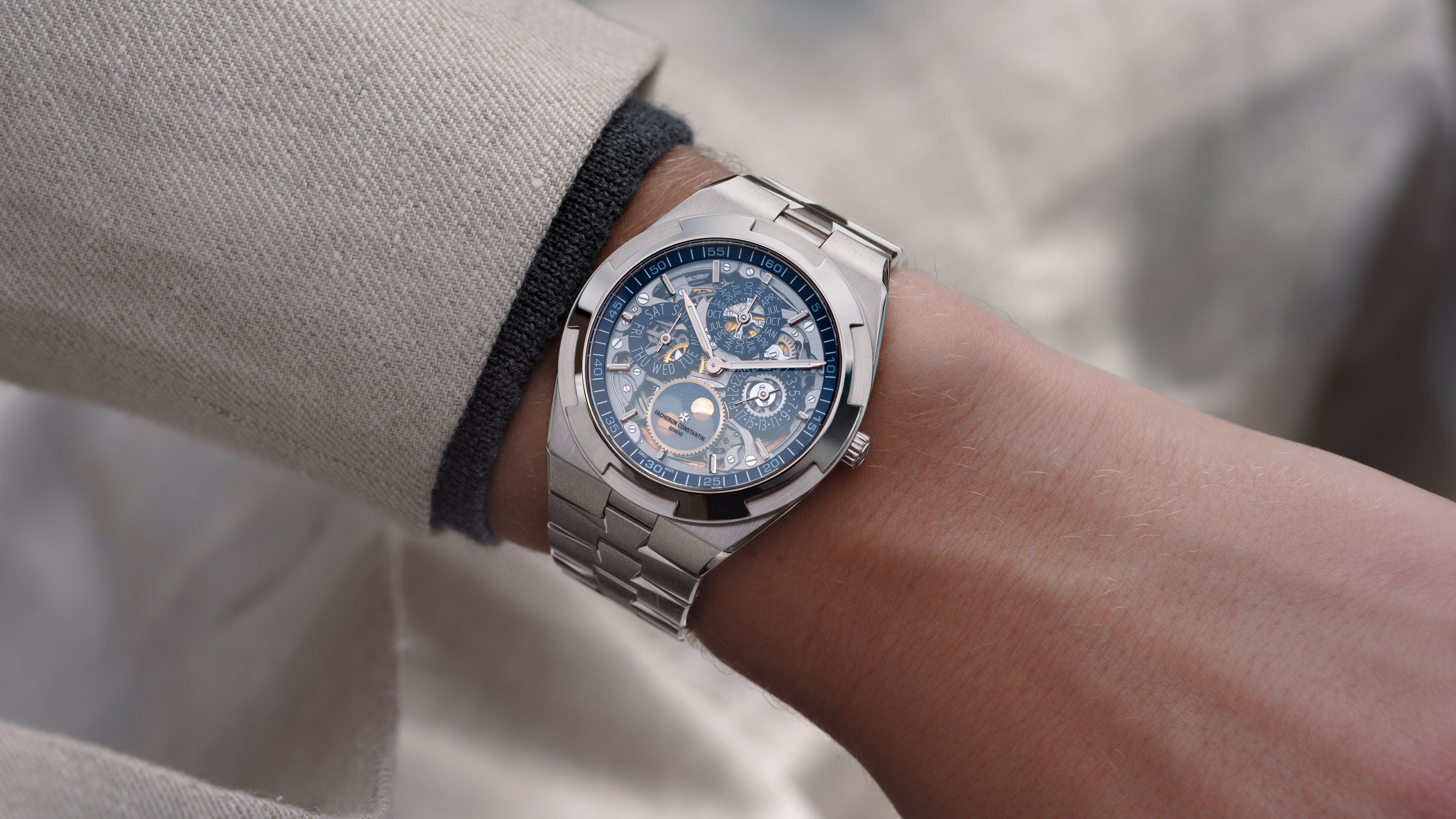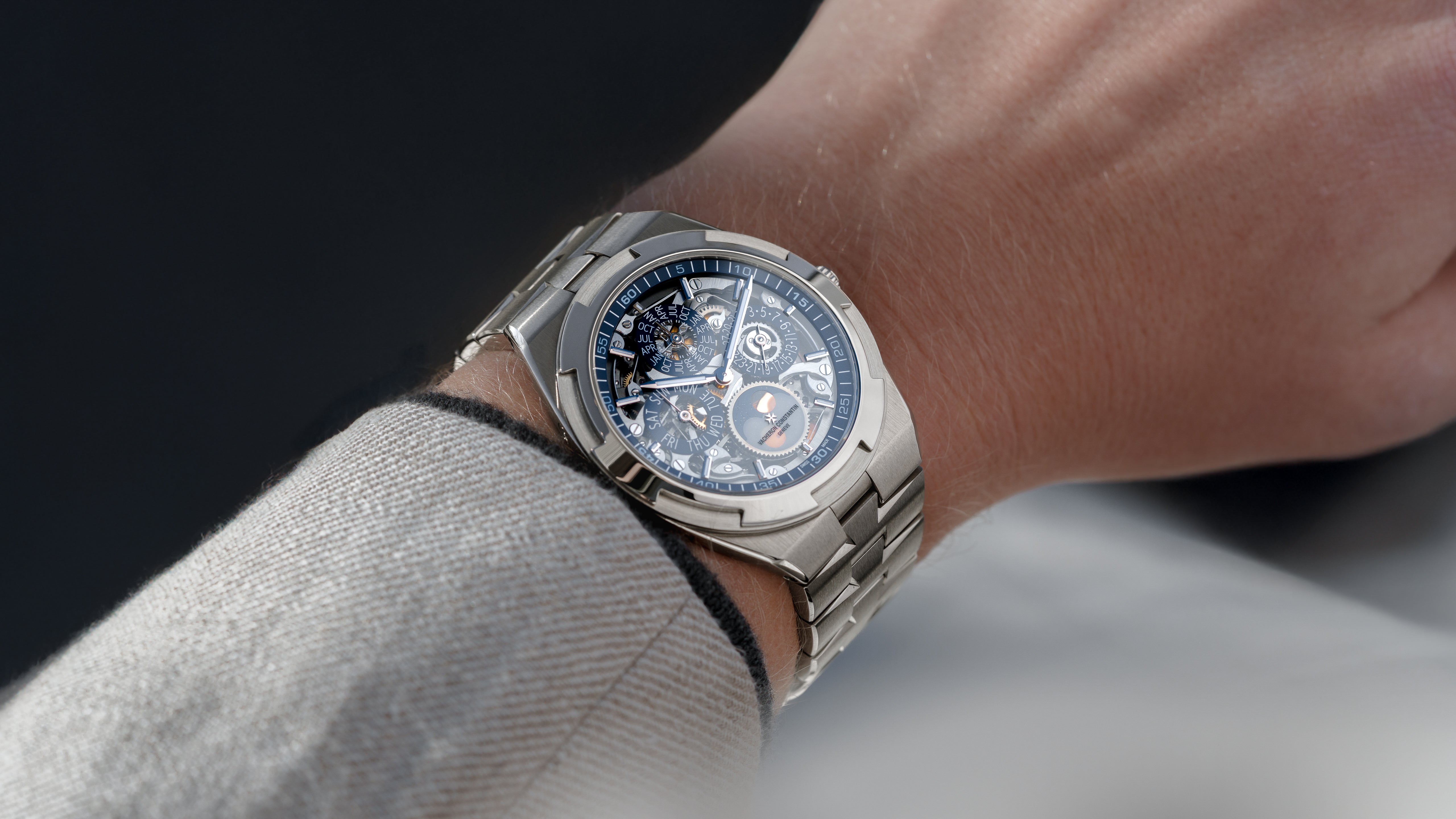 A ref. 4300V/120G-B946 Overseas Perpetual Calendar Skeleton, the culmination of VC’s integrated-bracelet sports watch and ultra-thin perpetual calendar history. The Overseas line, born of the legendary 222, has debuted numerous complications over its three generations, but was only first offered as a perpetual calendar in 2020. Vacheron built upon their storied 1980s ref. 43031 Perpetual Calendar, forming a bridge between two highly successful threads of their history by evolving the same 1120 QP movement. Here, extensive skeletonization opens up that 1120 QP for a glimpse of Vacheron Constantin’s utmost technical and finishing ability, deserving of the Geneva Seal it proudly wears, within the sporting Overseas case.