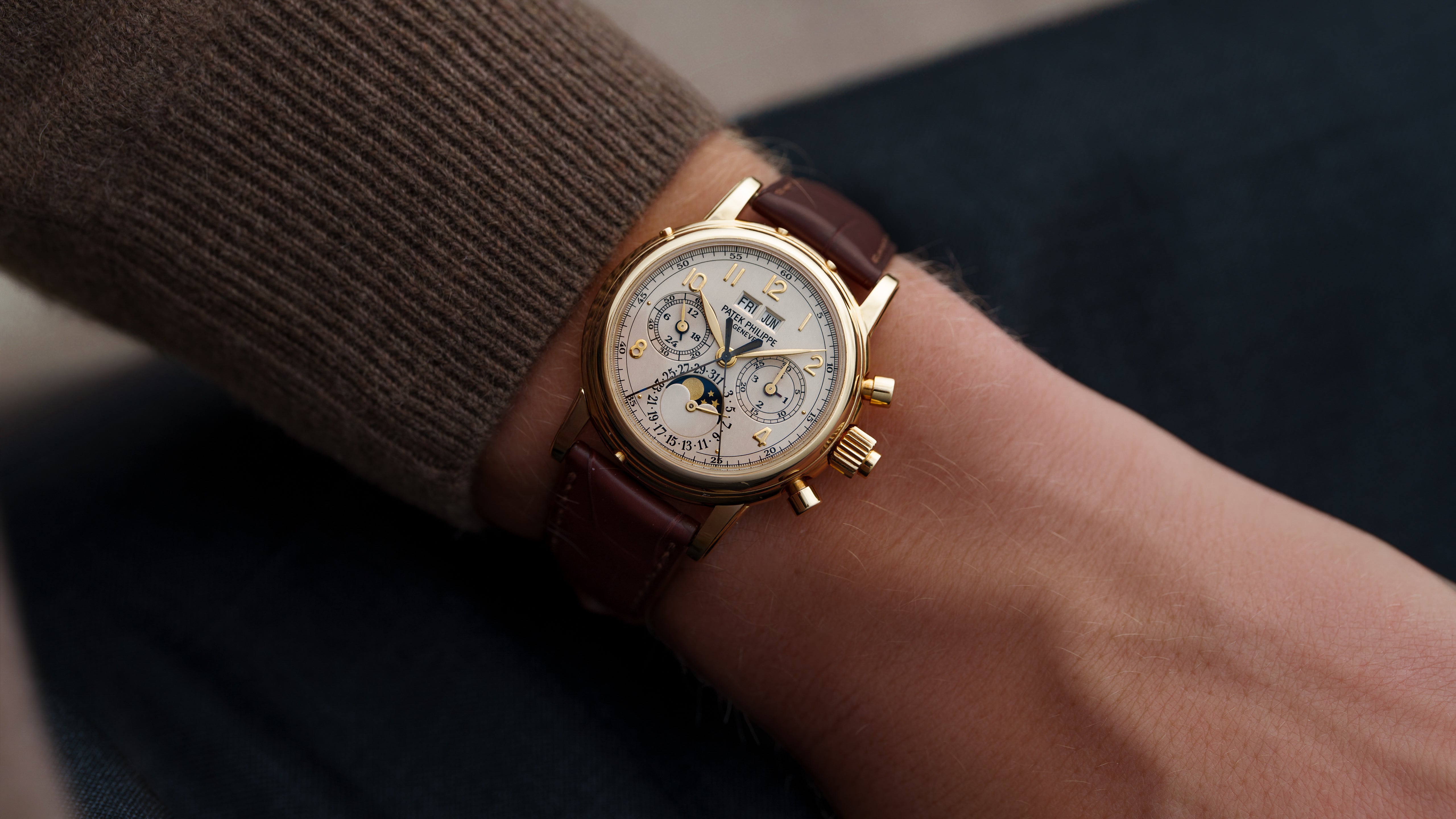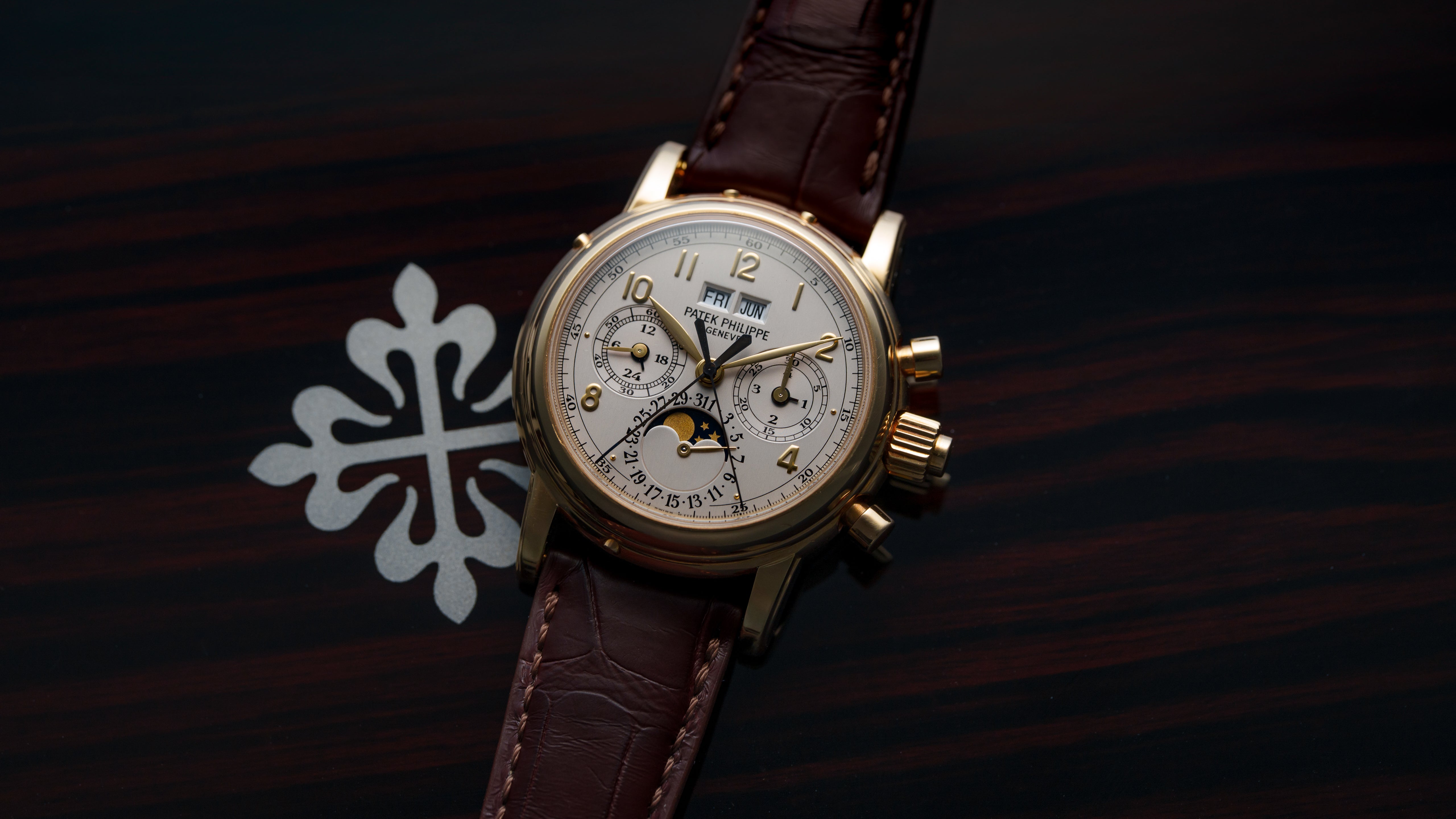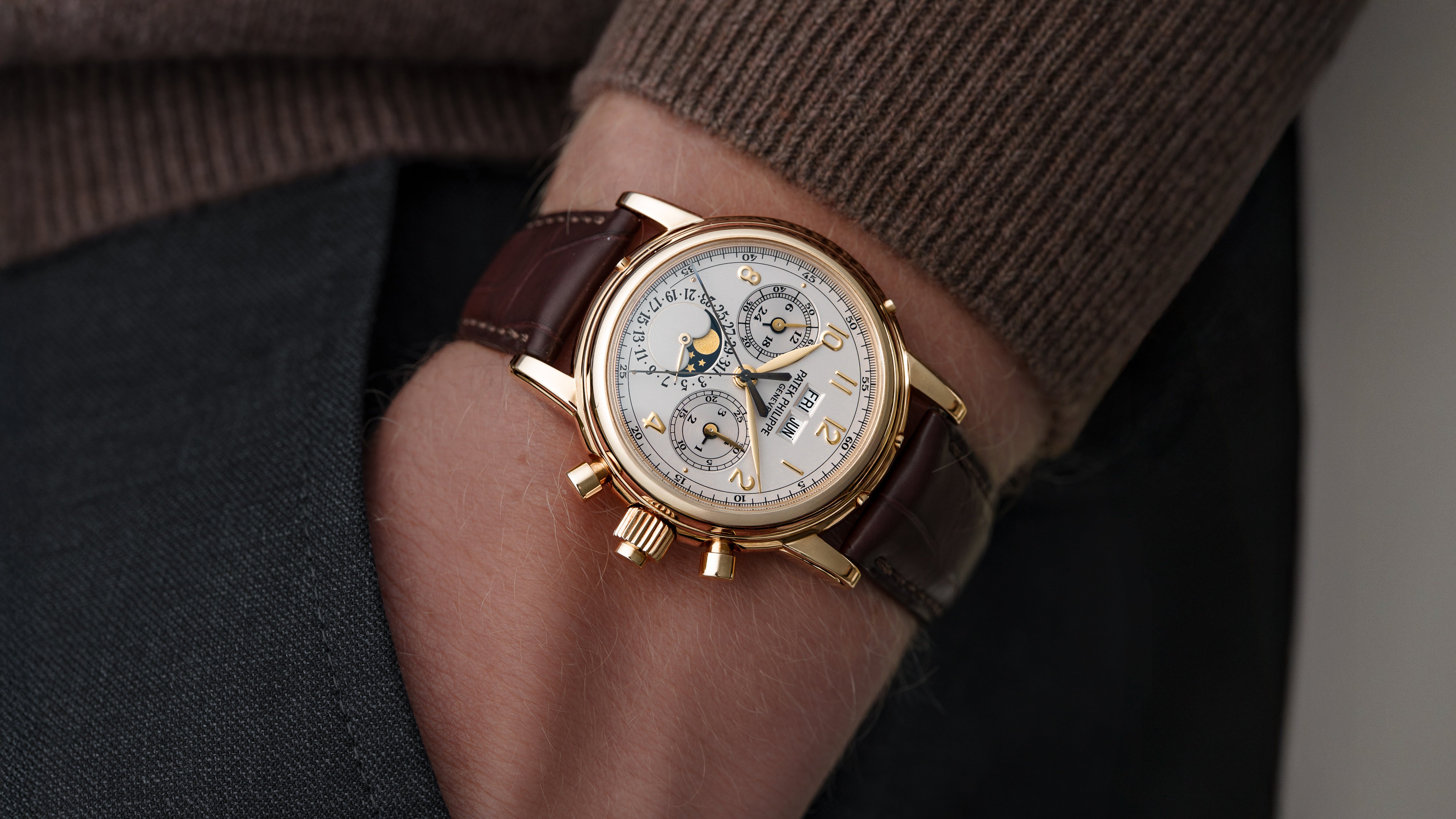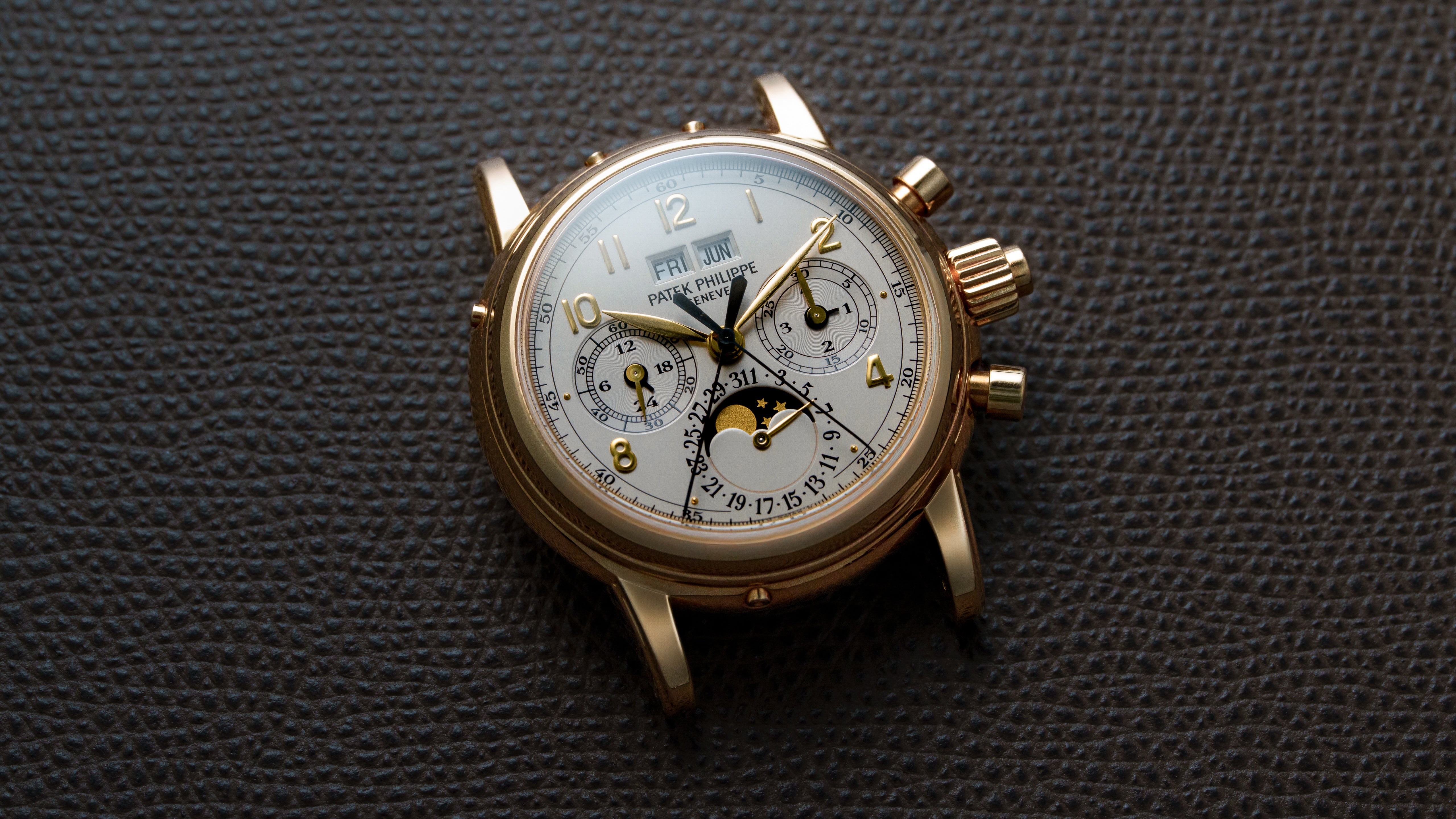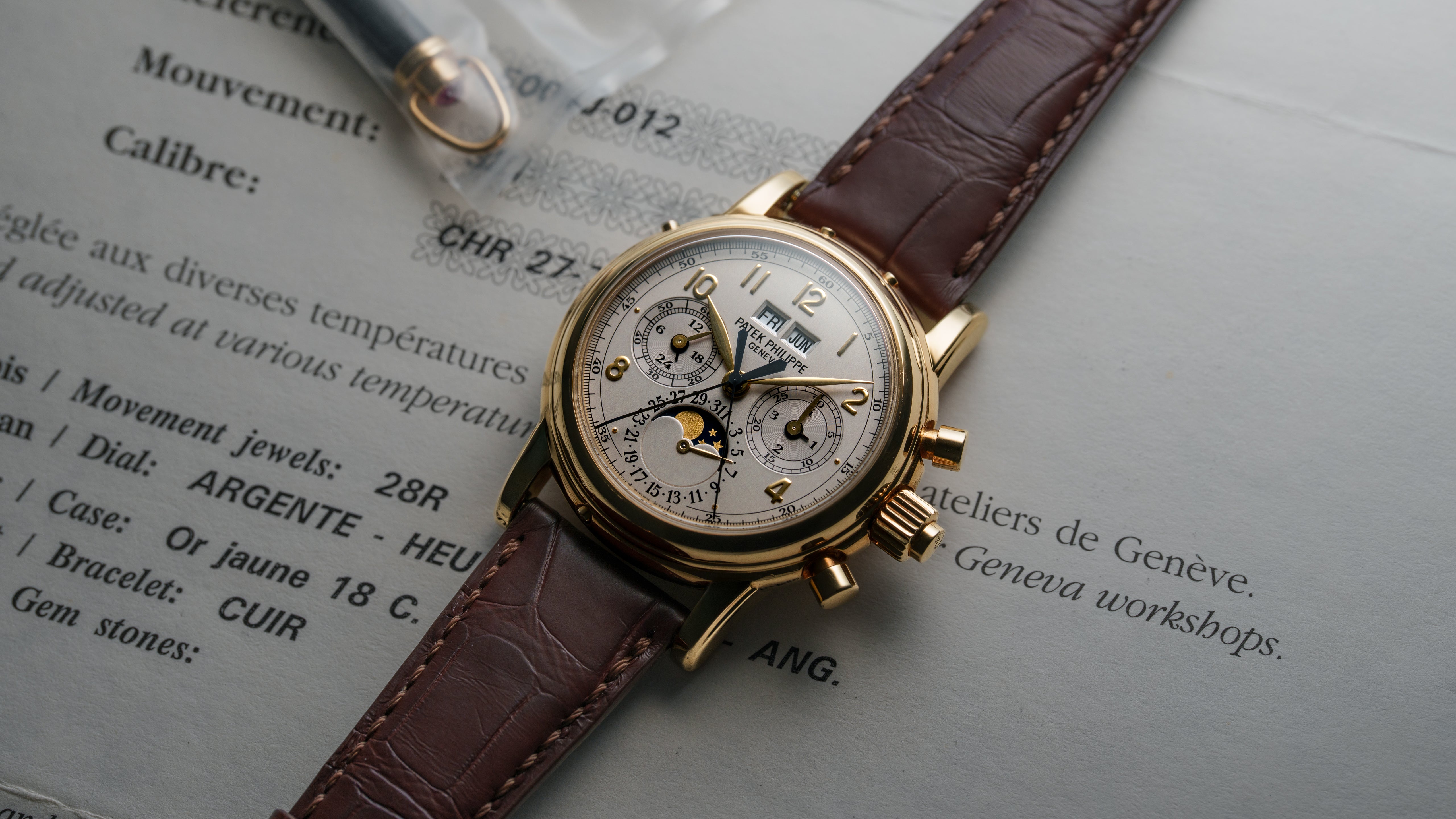 A ref. 5004J, the first production Perpetual Calendar Split Seconds Chronograph, an ultimate conclusion to the development of complicated Lemania architecture. Out of an estimated 1000 examples made across all metals, roughly 300 are thought to be in yellow gold. Reportedly hailed by Philippe Stern as the 'spiritual successor to the 2499', the 5004 is easily amongst the most important and desirable Patek Philippe models ever made. The 5004 embodies a technically refined ability to dare that only Patek Philippe at their very best were capable of.