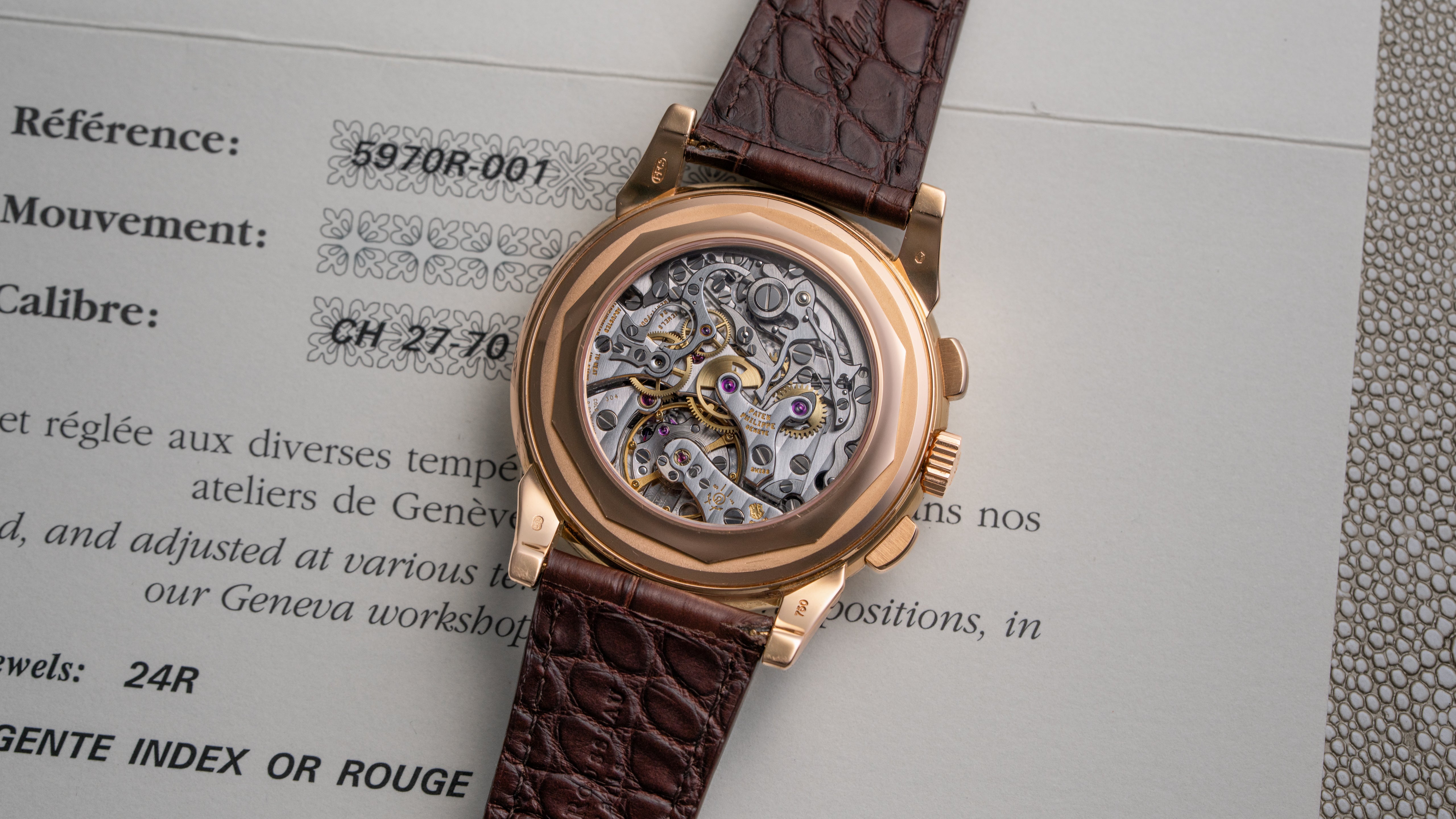 A ref. 5970R Perpetual Calendar Chronograph, in Pink Gold. The last of the Lemania ébauche, this example comes from early in production with Geneva Seal. The 5970R was Thierry Stern's attempt to bring the storied PCC bloodline into the 21st century. It features a larger 40mm case with beautifully sculpted and finished lugs, restrained tachymeter dial, and beautifully finished classical Lemania architecture. Produced for only 6 years, the 5970 stands at the cusp of Patek's modernization. It offers ties to traditional watchmaking pedigree with a brand philosophy we may not ever see again.