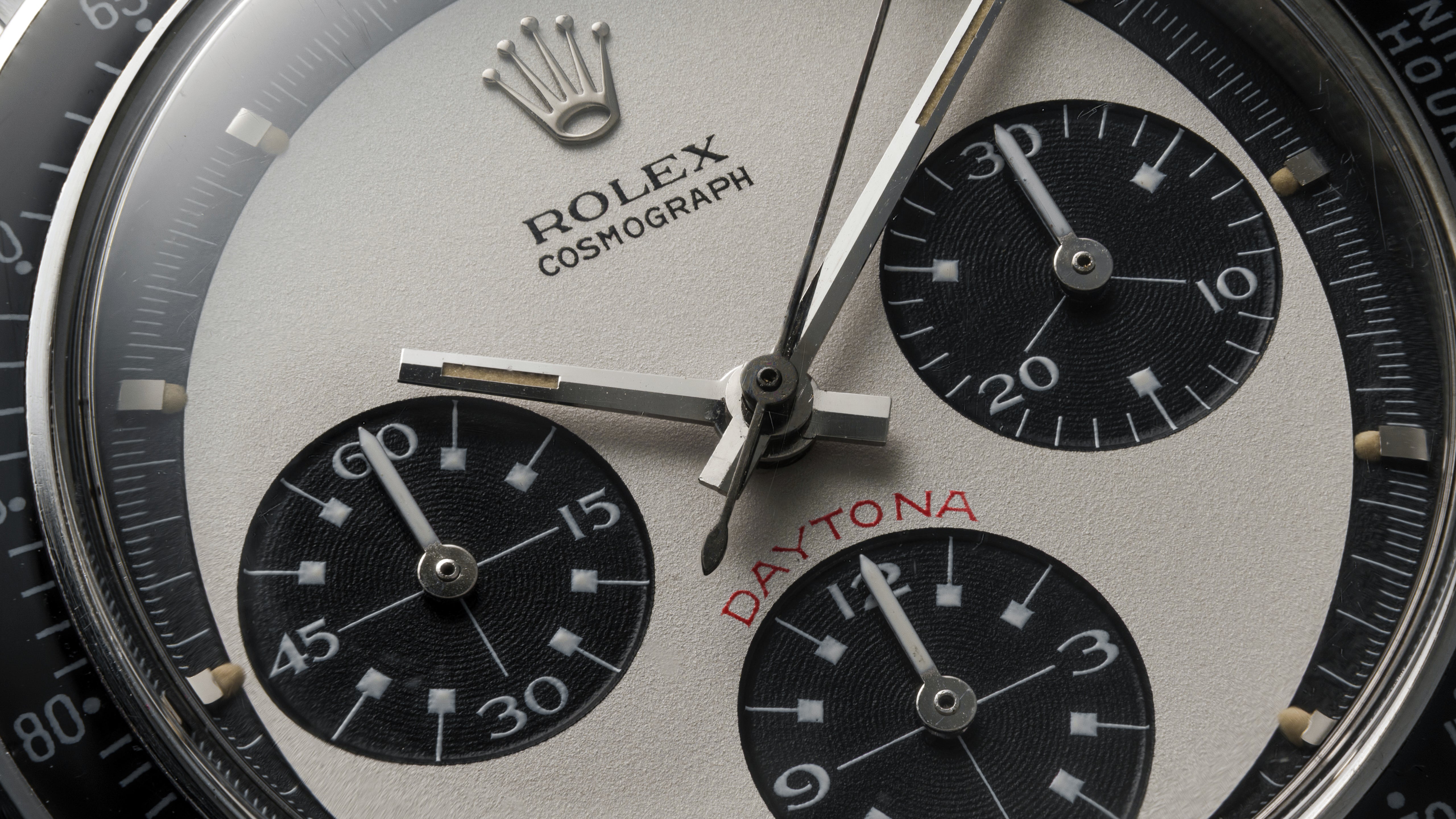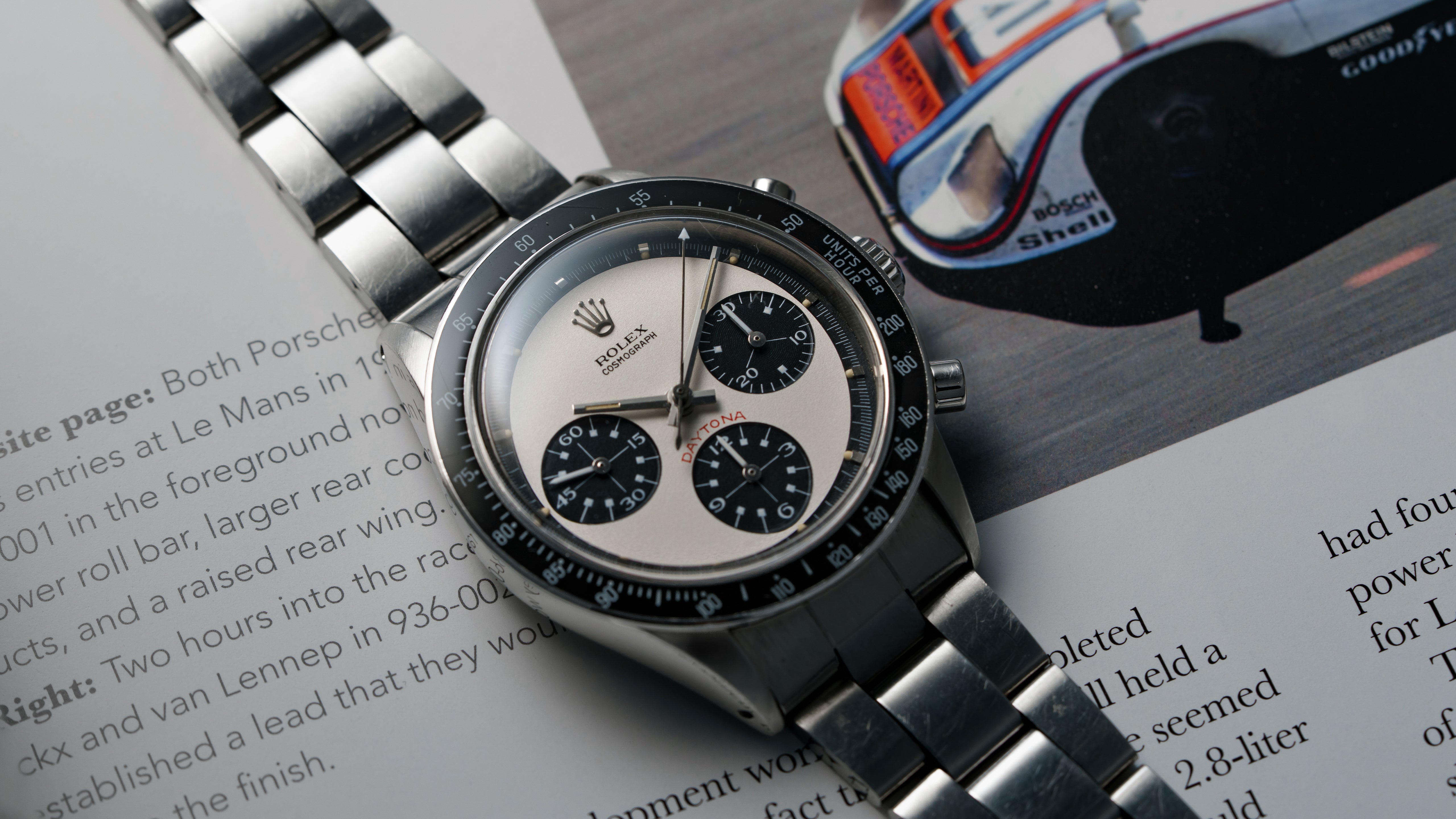 A ref. 6264 Cosmograph Daytona with a beautiful Singer-made Paul Newman exotic dial. Produced just over a year, the 6264 is one of transitional Daytona references which ended pump pusher production yet introduced the higher-beat calibre 727. It is estimated that somewhere from 100-170 examples of Paul Newman 6264 were made in steel, of which far fewer survive. This is a landmark example, preserved beautifully in all aspects. Its dial has aged to a light white-cream in the grené dial main and honey in tritium, while the case is sharp and full. The 6264 is amongst the least seen Paul Newmans in any state, but particularly like this.
