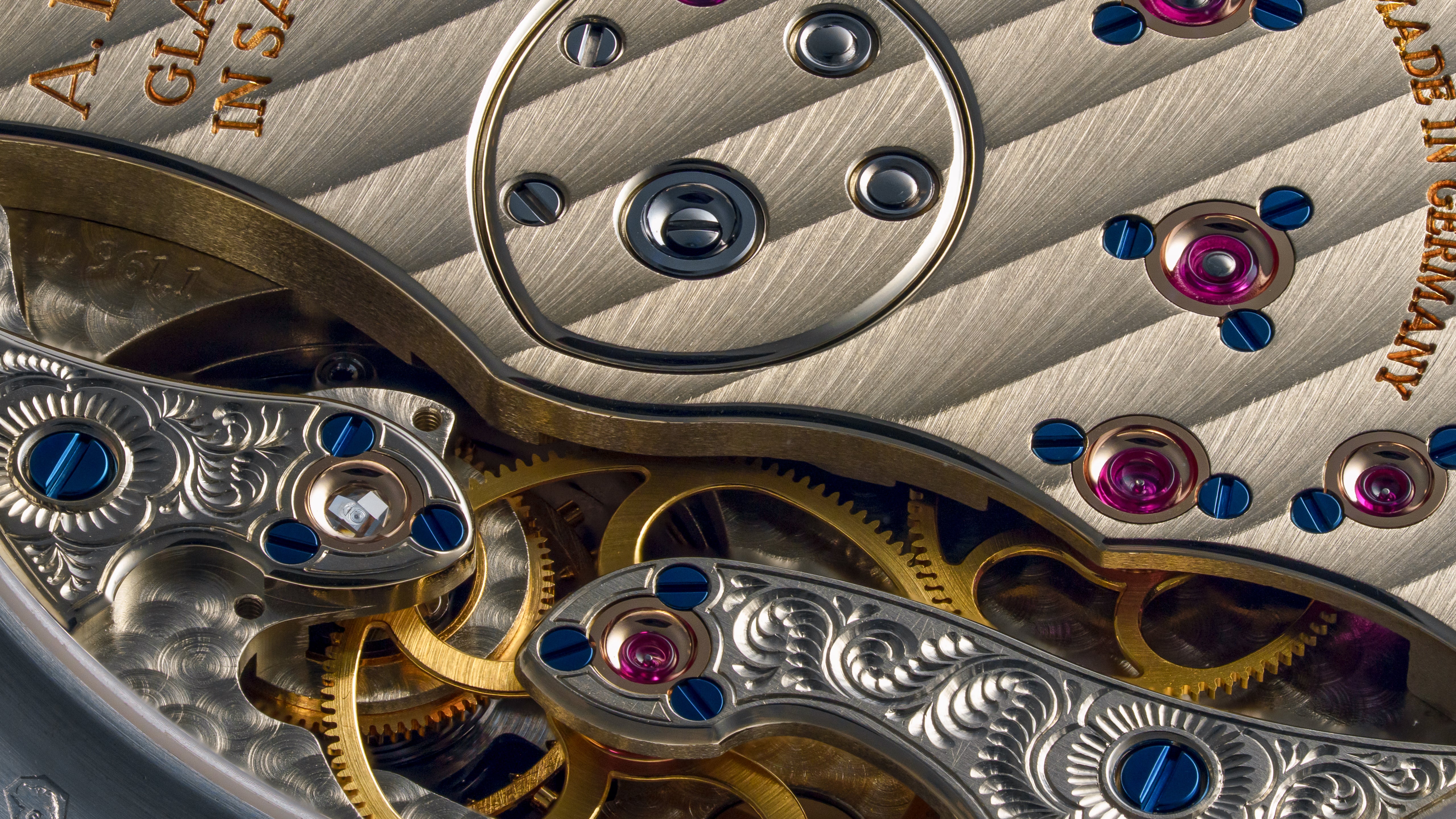 Calibre L961.1 was engineered entirely at Glashütte with 378 components. The shape of the Tourbillon carriage nods directly to the Jahrhunderttourbillon, made for the Paris exhibition in 1900. The cage itself comprises 72 individual parts, held by two brilliant-diamond pivots in chatons. The tourbillon rotates counter-clockwise, a nod to the pocket watch tourbillon, once per minute. Remarkably, setting the time hacks both the tourbillon and seconds. The floral engraving motif has been opened to both tourbillon and third wheel bridges. Its calibre still contains the keyless works island from early Lange 1 movement design.