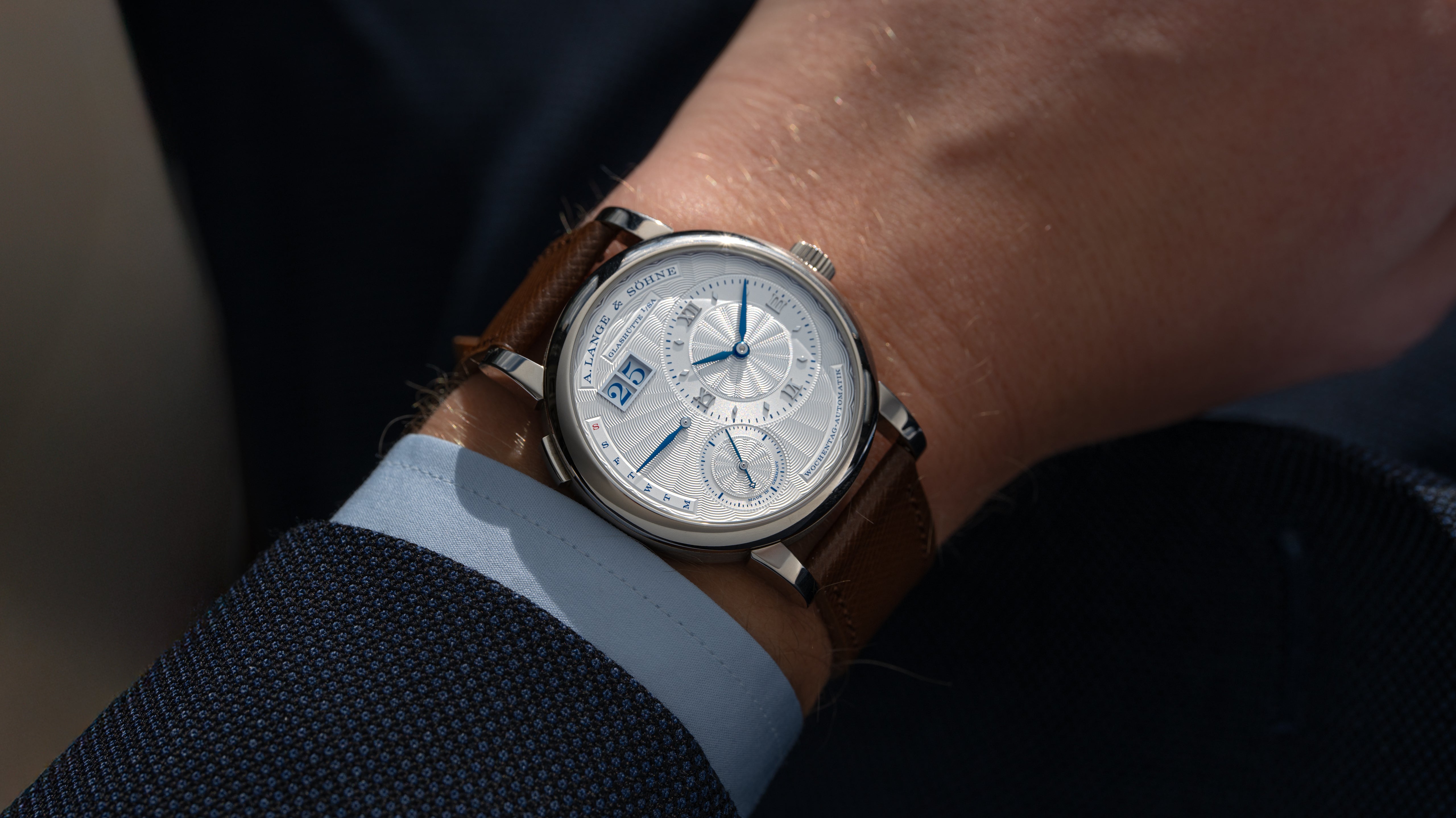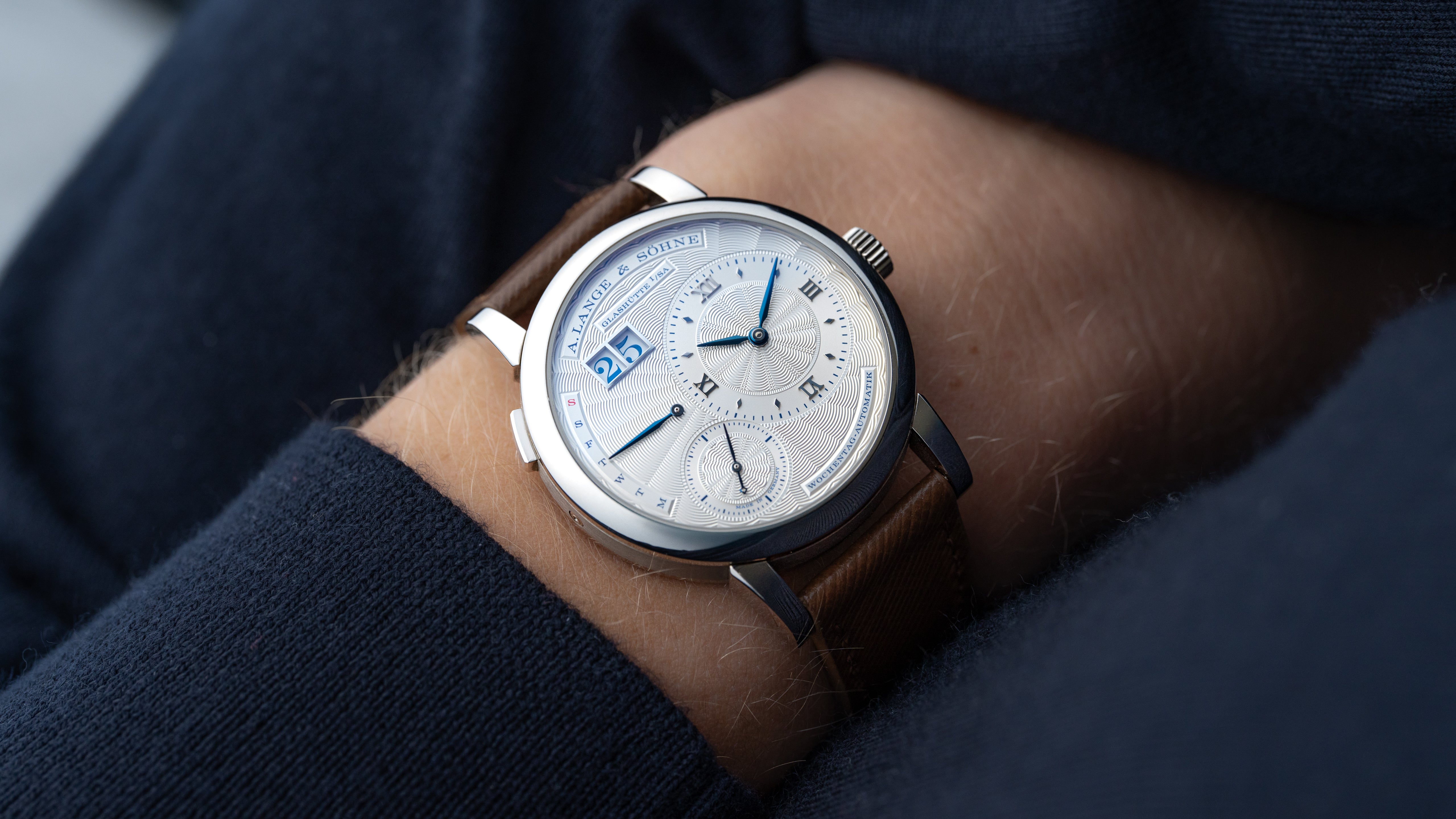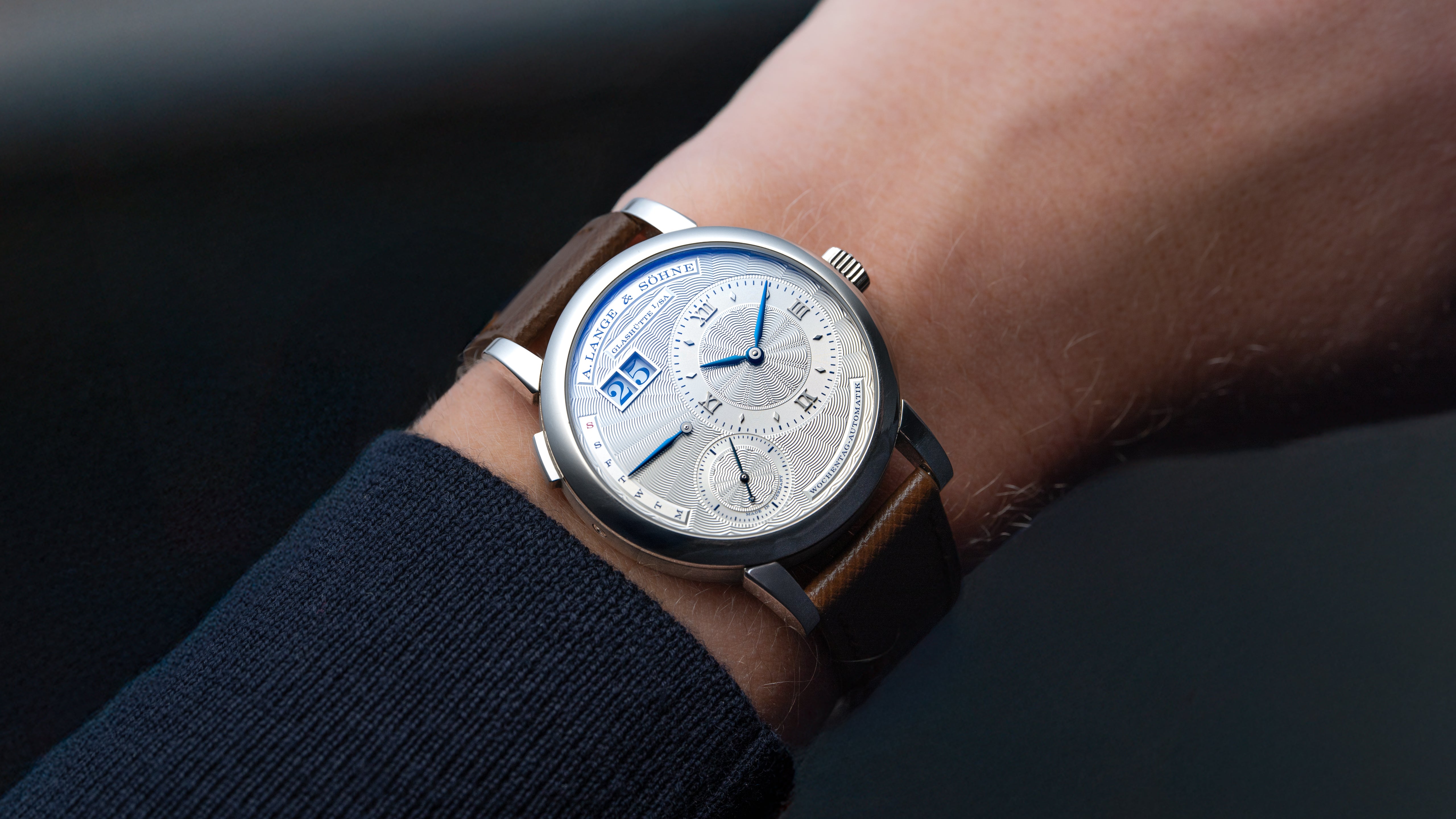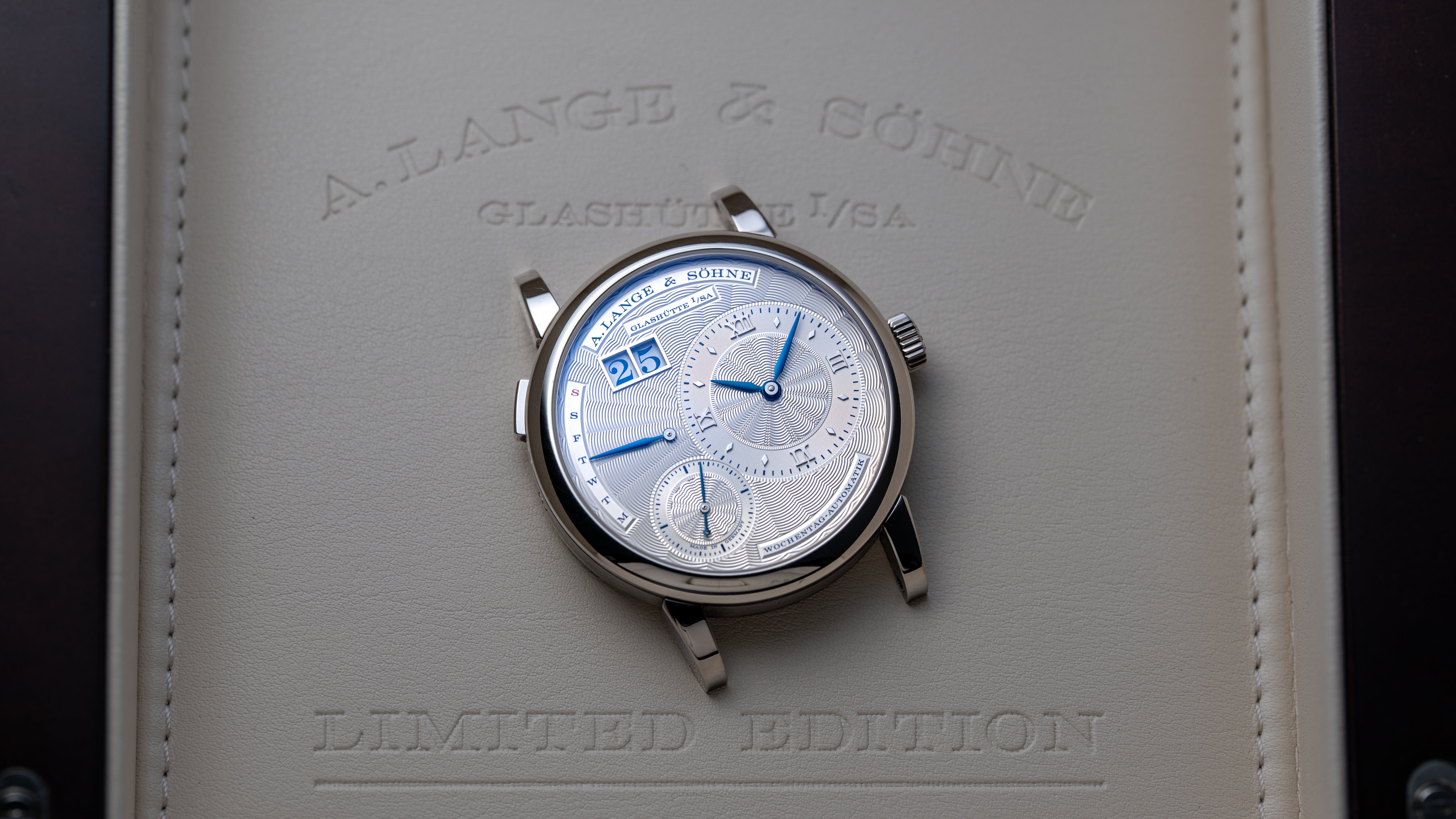 A ref. 320.040 Lange 1 Daymatic Tokyo Boutique edition, one of just 20 examples produced. It was released in 2018 to celebrate the 10th anniversary of Japan’s first Lange boutique, located in the Ginza shopping district of Tokyo. The Tokyo Boutique, or ‘Ginza’ edition, features a unique combination of the Teutonic Lange 1 dial design with the flourish of expert guilloché. Its solid gold argente finish dial is hand turned, blue text pairs beautifully with blued steel hands. The calibre L021.1, shared with the rest of the Daymatic line, is the first full-rotor automatic movement from the brand. It is an exceptionally beautiful and rare Daymatic with both cultural and historical significance: a unique aesthetic from the typically austere manufacturer.