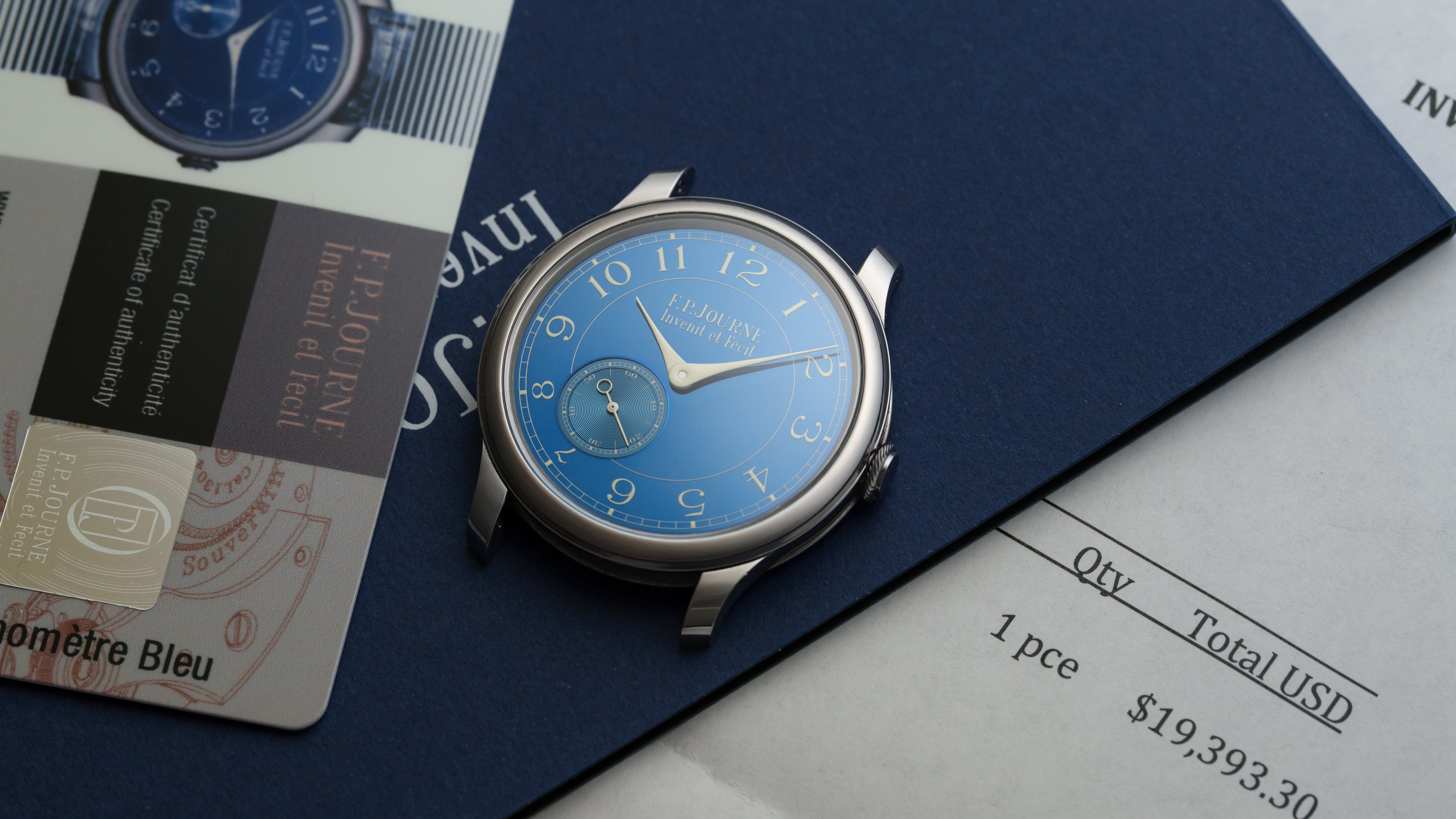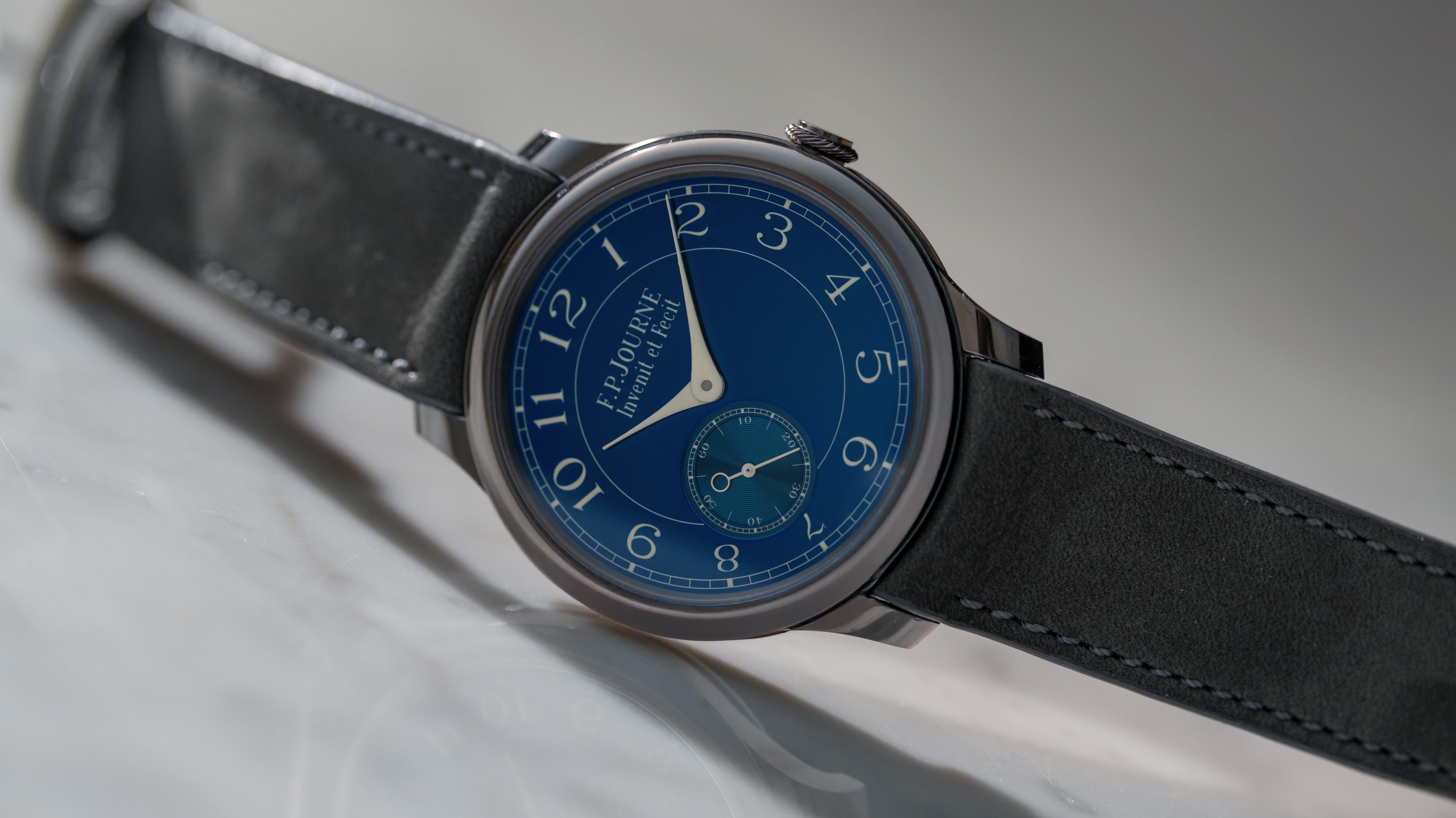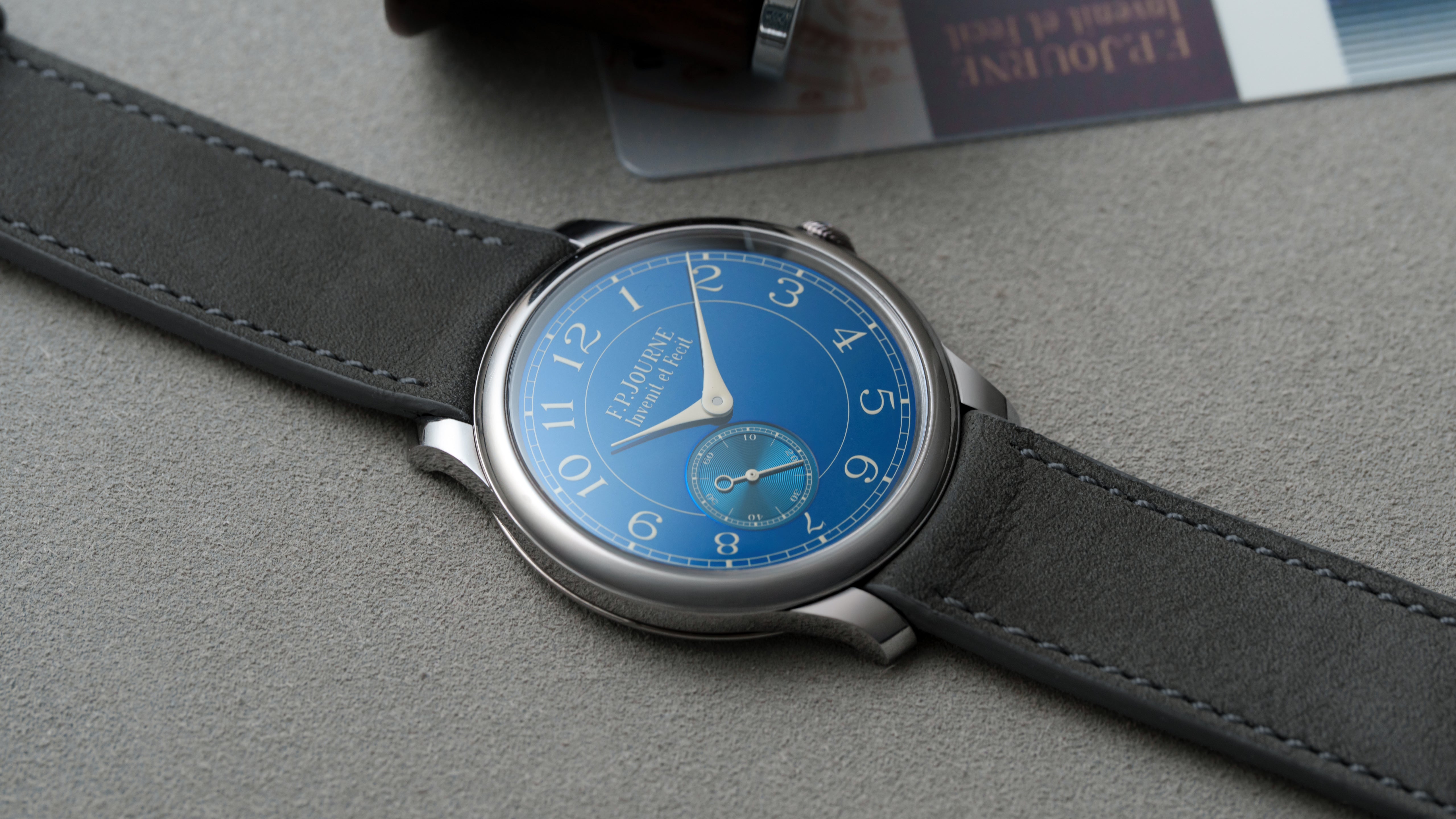 A Chronomètre Bleu, François-Paul’s most restrained three-hand model. The Chronomètre Bleu features a 39mm tantalum case, blue dial crafted from multiple layers of hand-polished lacquer, and calibre 1304 with dual mainspring barrels and floating balance. The Chronomètre Bleu is one of very few independent watchmaker's efforts which can truly be said to have become a modern classic already.