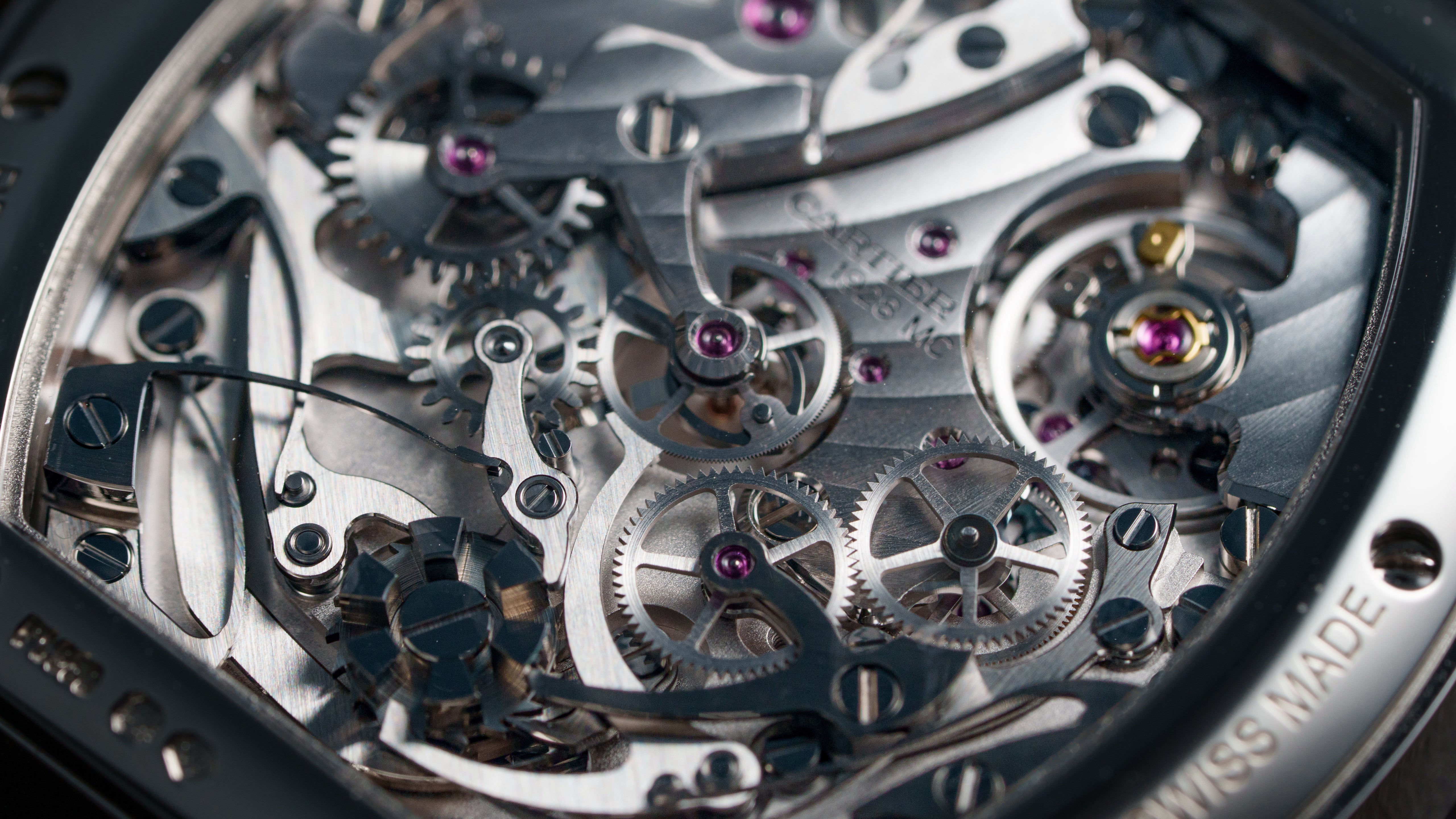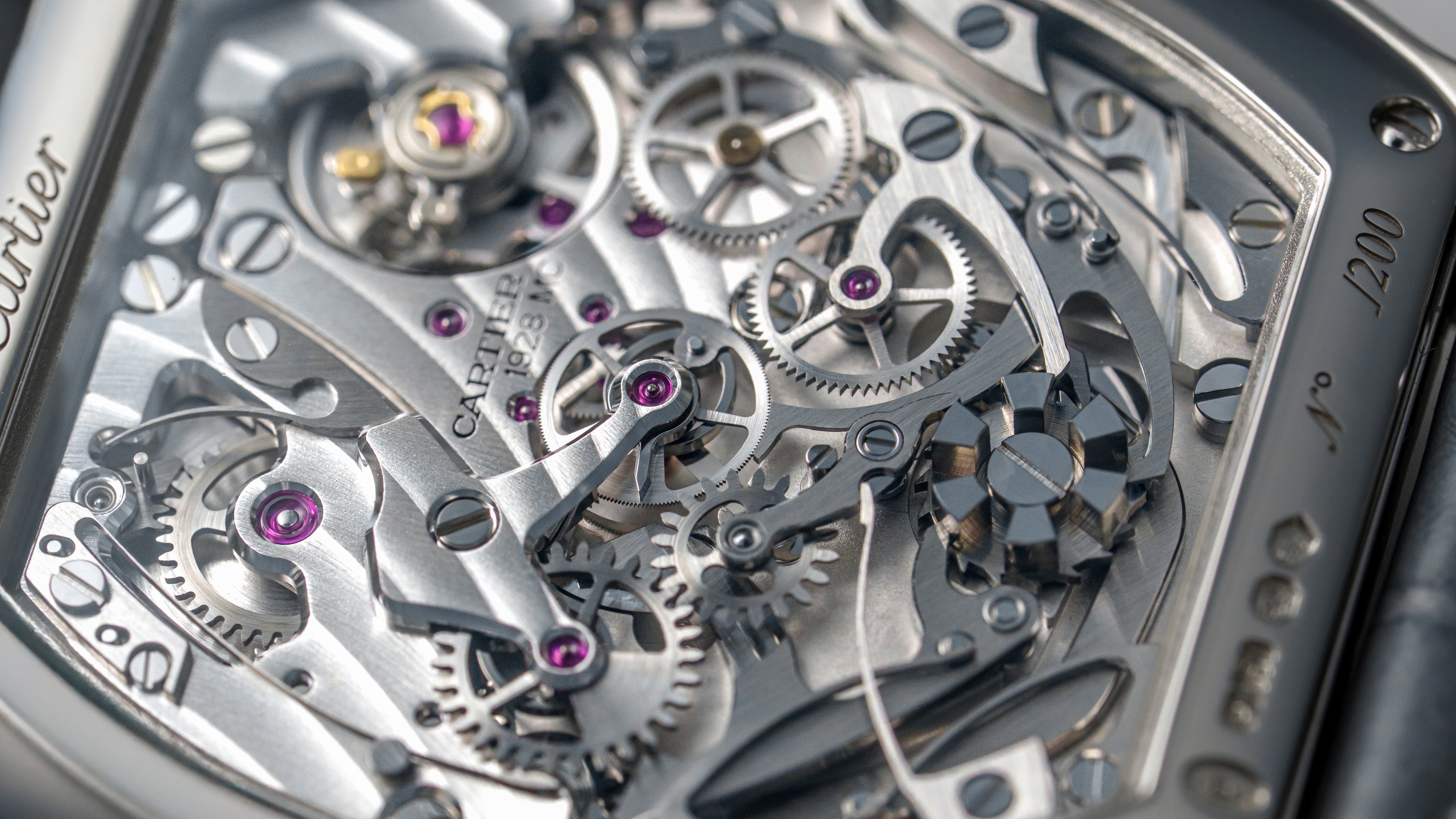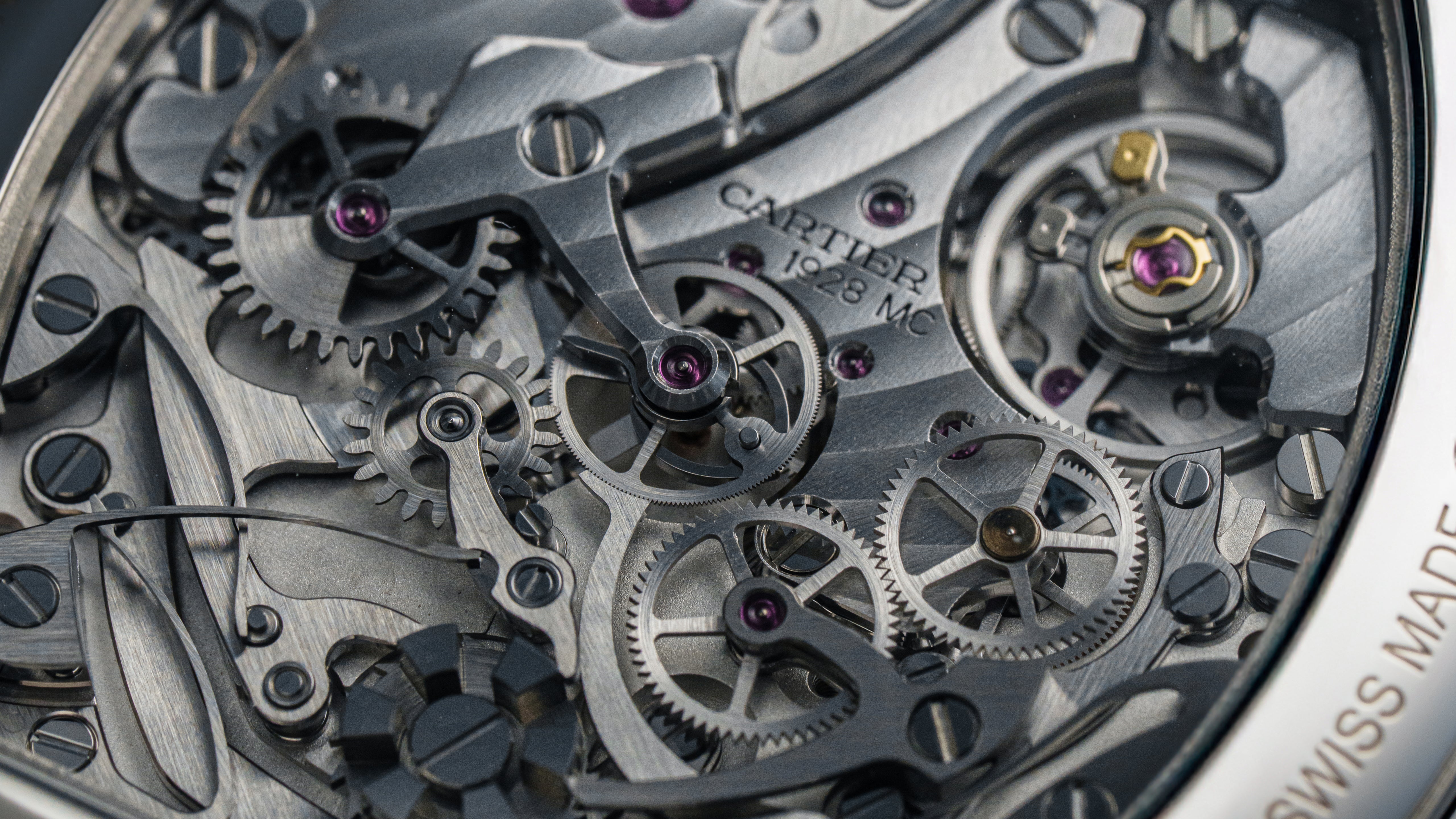 Cartier were able to keep this case beautifully proportioned by introducing, their own vertically developed chronograph calibre. Calibre 1928 is now shaped to this case, developed in partnership with Le Cercle des Horlogers. A column-wheel with horizontal clutch for aesthetic considerations, the primary focus was maintaining a 4.3mm thinness. Yet, the calibre features curved Côtes de Genève, traditional beveling, brushed levers, black polished screw heads, and an attractive architecture.