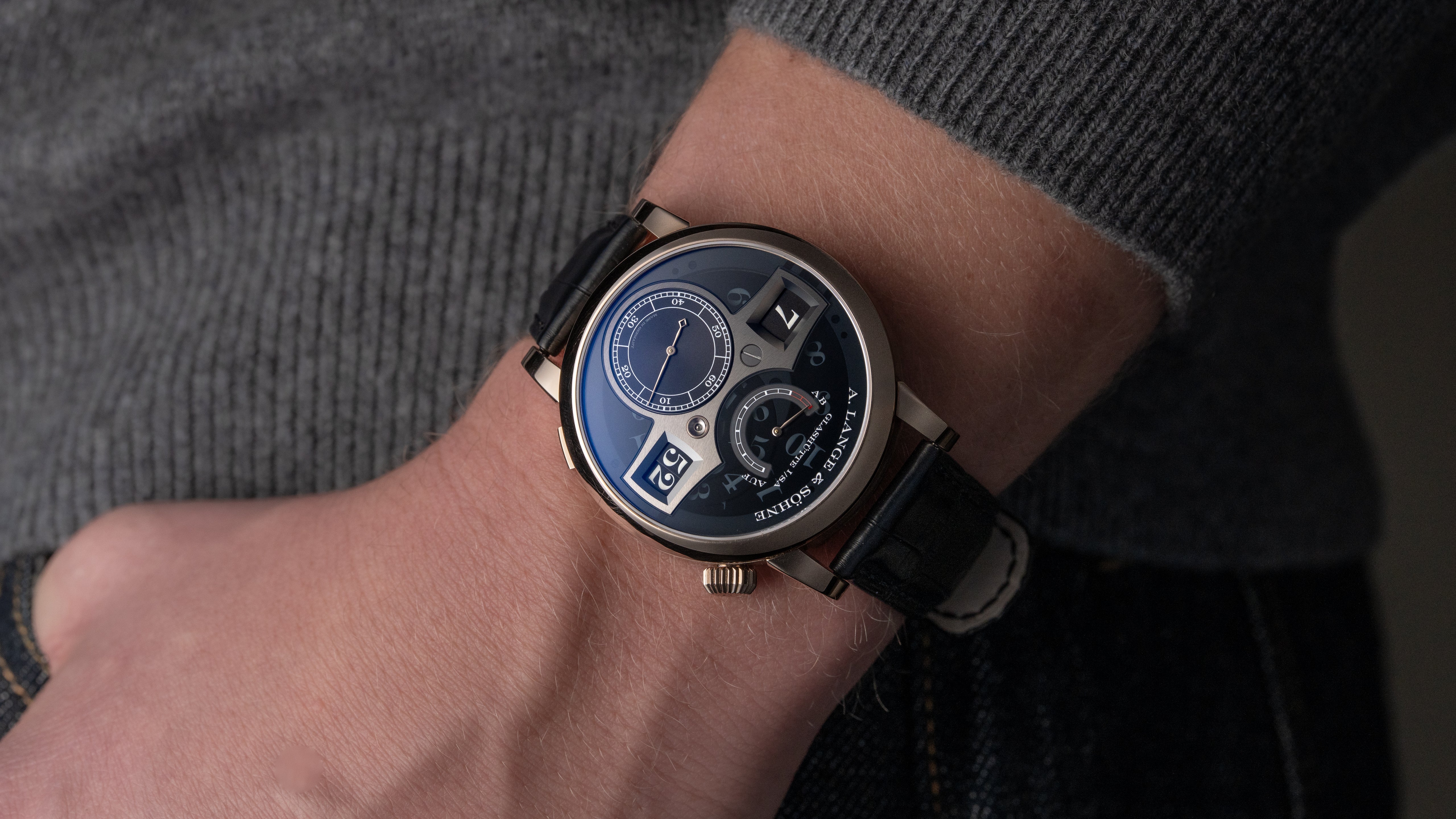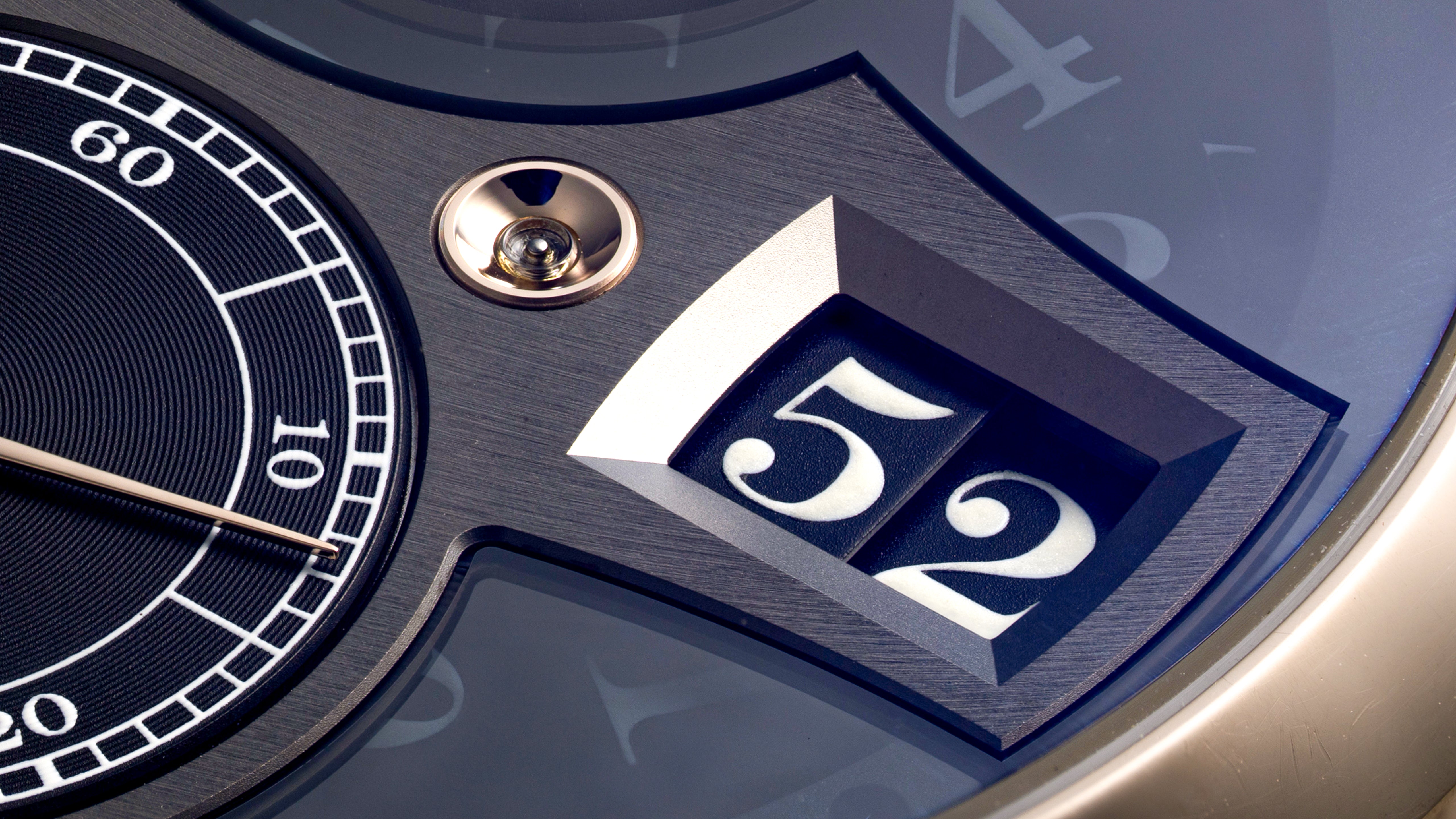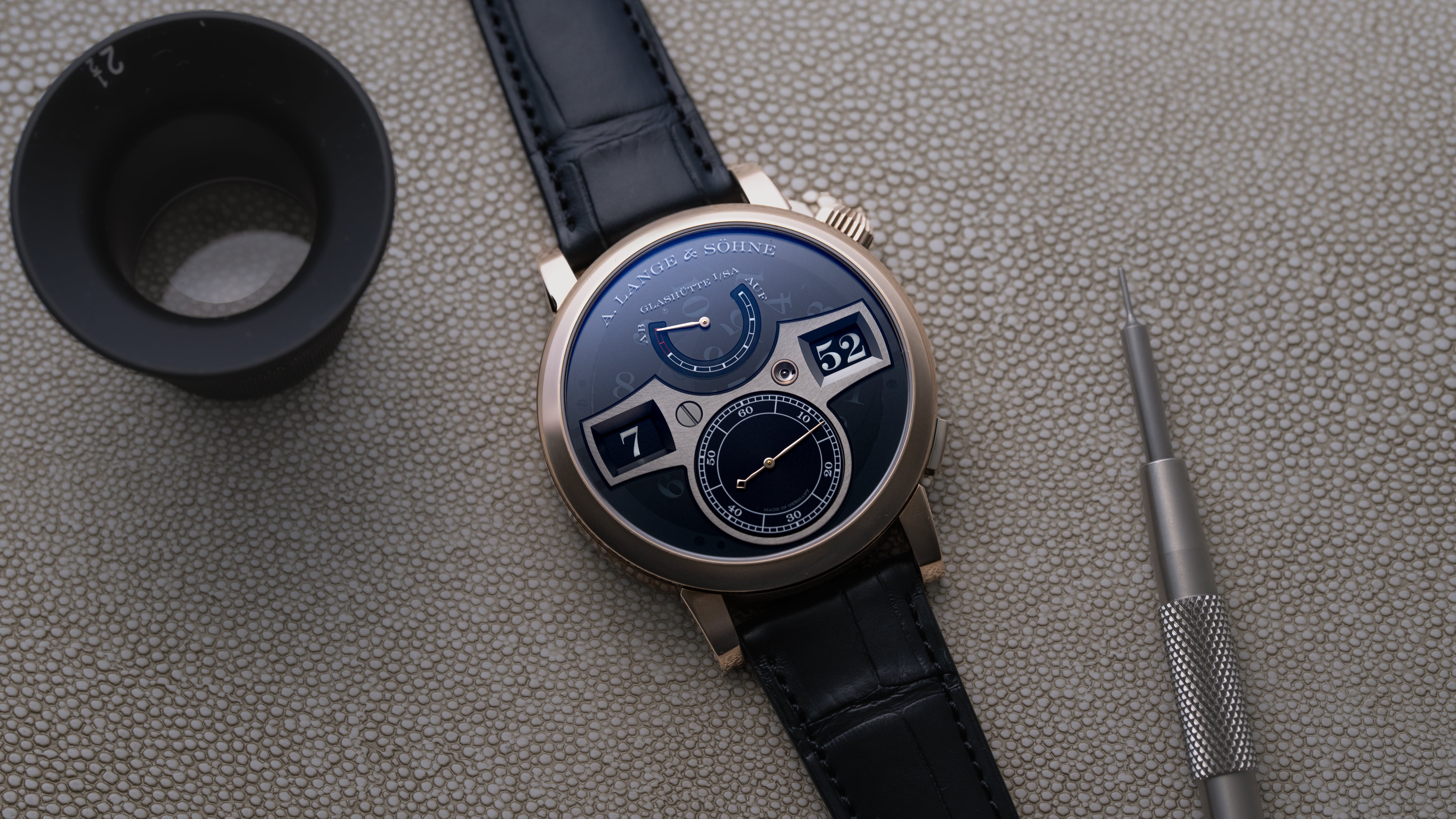 A ref. 140.035 Zeitwerk Honeygold Lumen, the Lumen offering for the technically improved second series of the Zeitwerk made in just 200 examples. The Lumen was created from the experience of Anthony de Haas, Director of Product, after trying and struggling to read the time on his own Zeitwerk at night. This led to an audacious smoked sapphire dial, which allowed the time discs to fully charge under UV. Lumen dials have since expanded to celebrate and highlight the most technically advanced models from the brand, here paired with Lange’s proprietary Honeygold case material that is reserved for the most exclusive offerings.