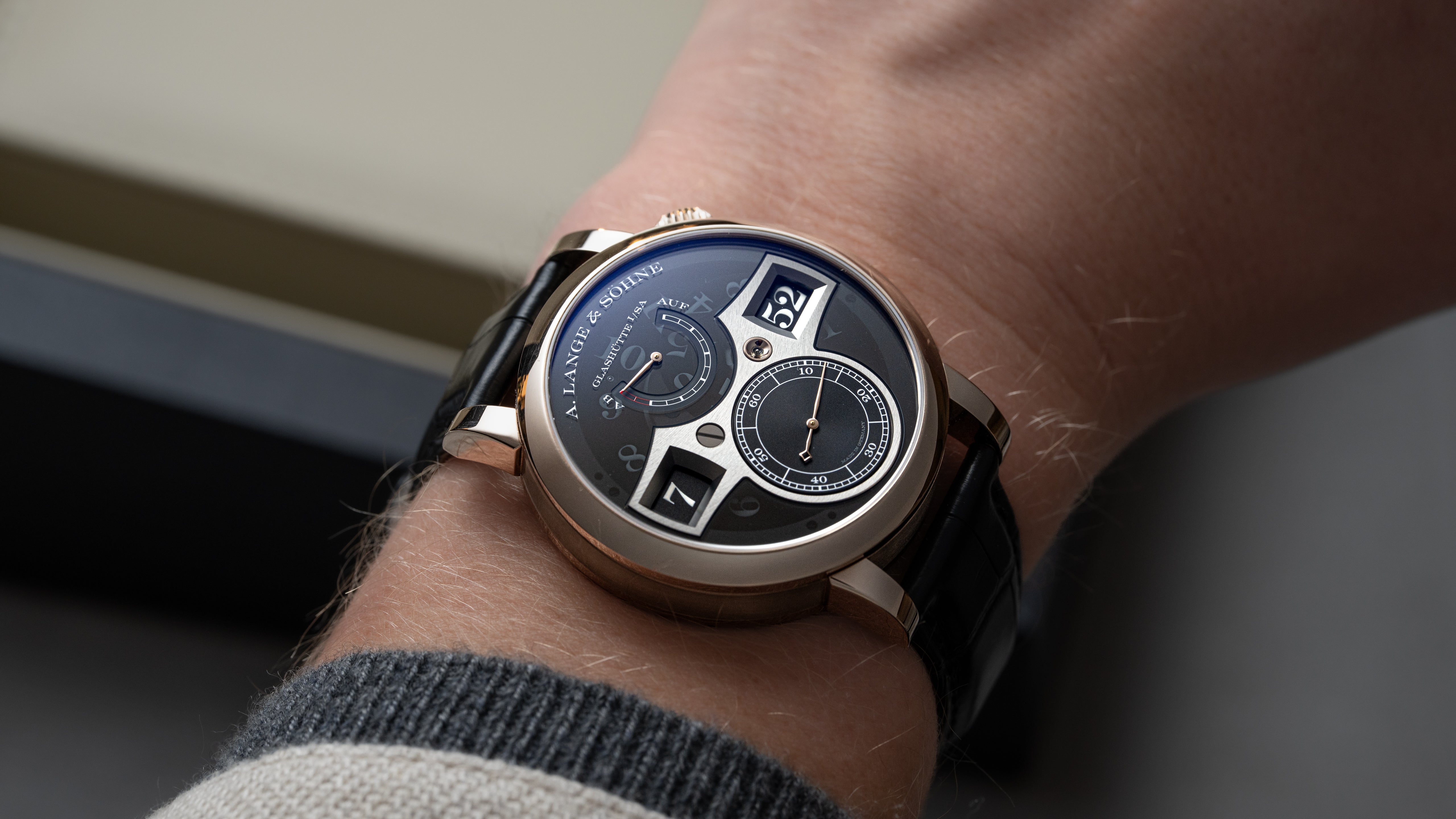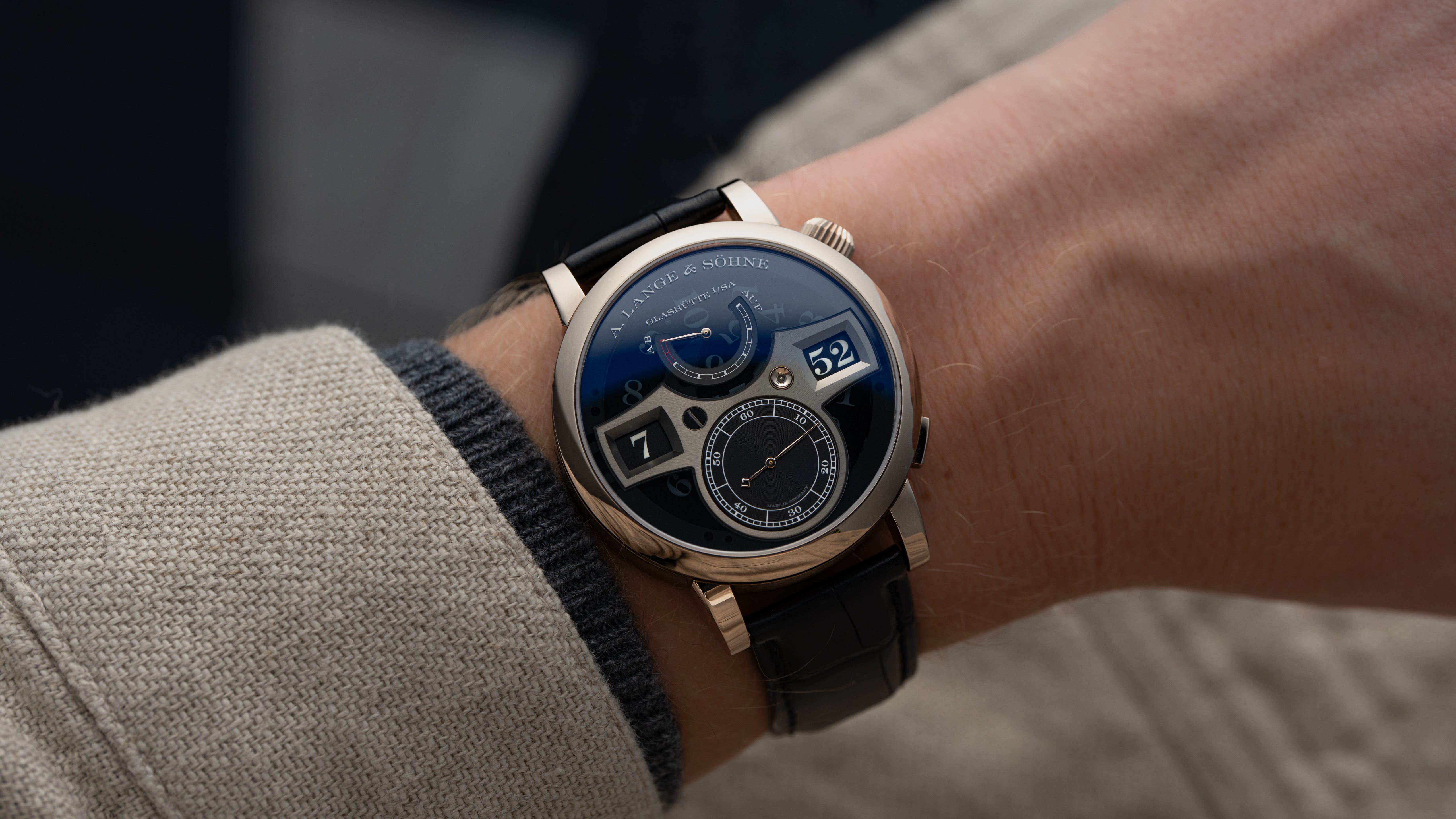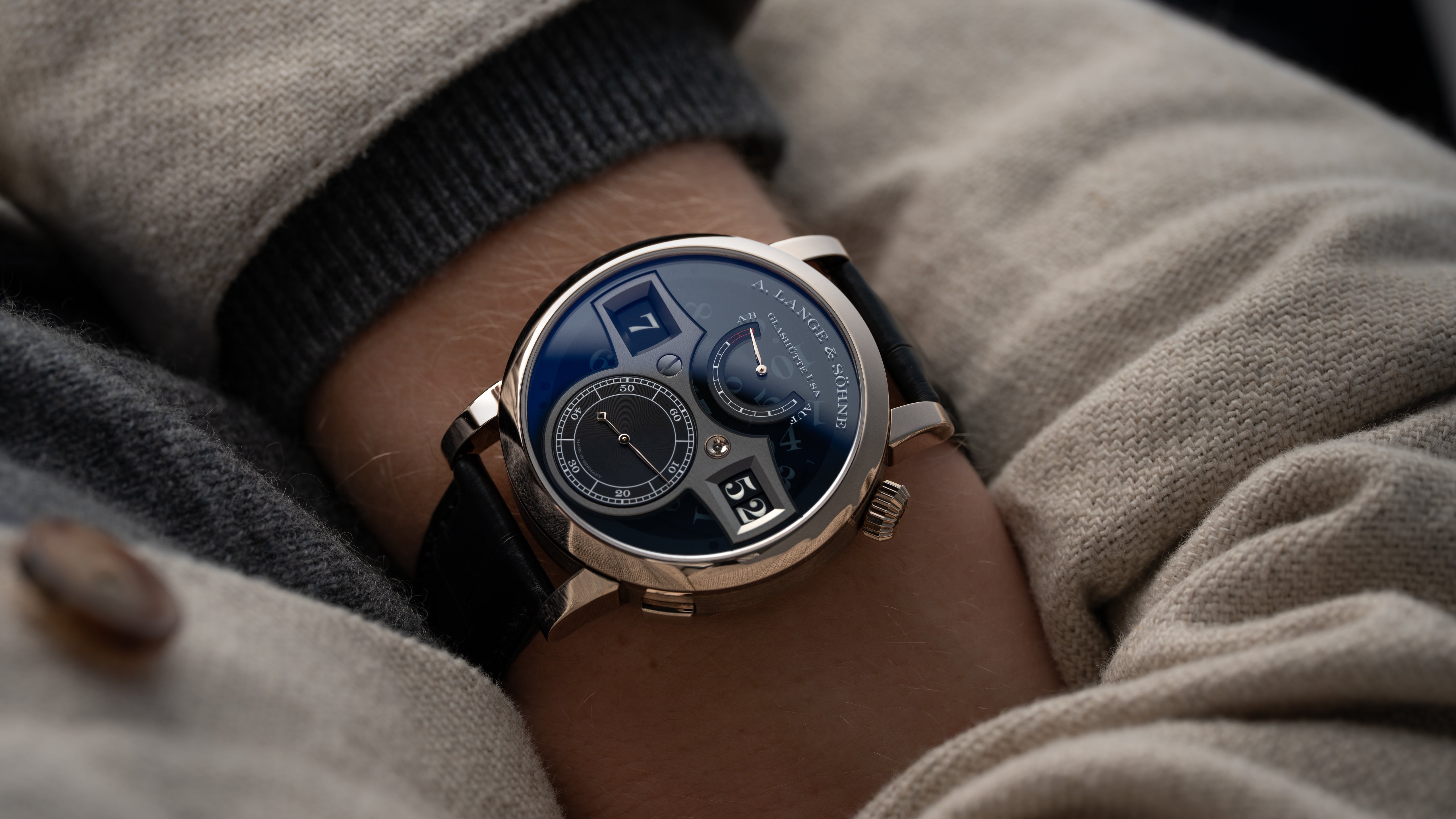 A ref. 140.035 Zeitwerk Honeygold Lumen, the Lumen offering for the technically improved second series of the Zeitwerk made in just 200 examples. The Lumen was created from the experience of Anthony de Haas, Director of Product, after trying and struggling to read the time on his own Zeitwerk at night. This led to an audacious smoked sapphire dial, which allowed the time discs to fully charge under UV. Lumen dials have since expanded to celebrate and highlight the most technically advanced models from the brand, here paired with Lange’s proprietary Honeygold case material that is reserved for the most exclusive offerings.