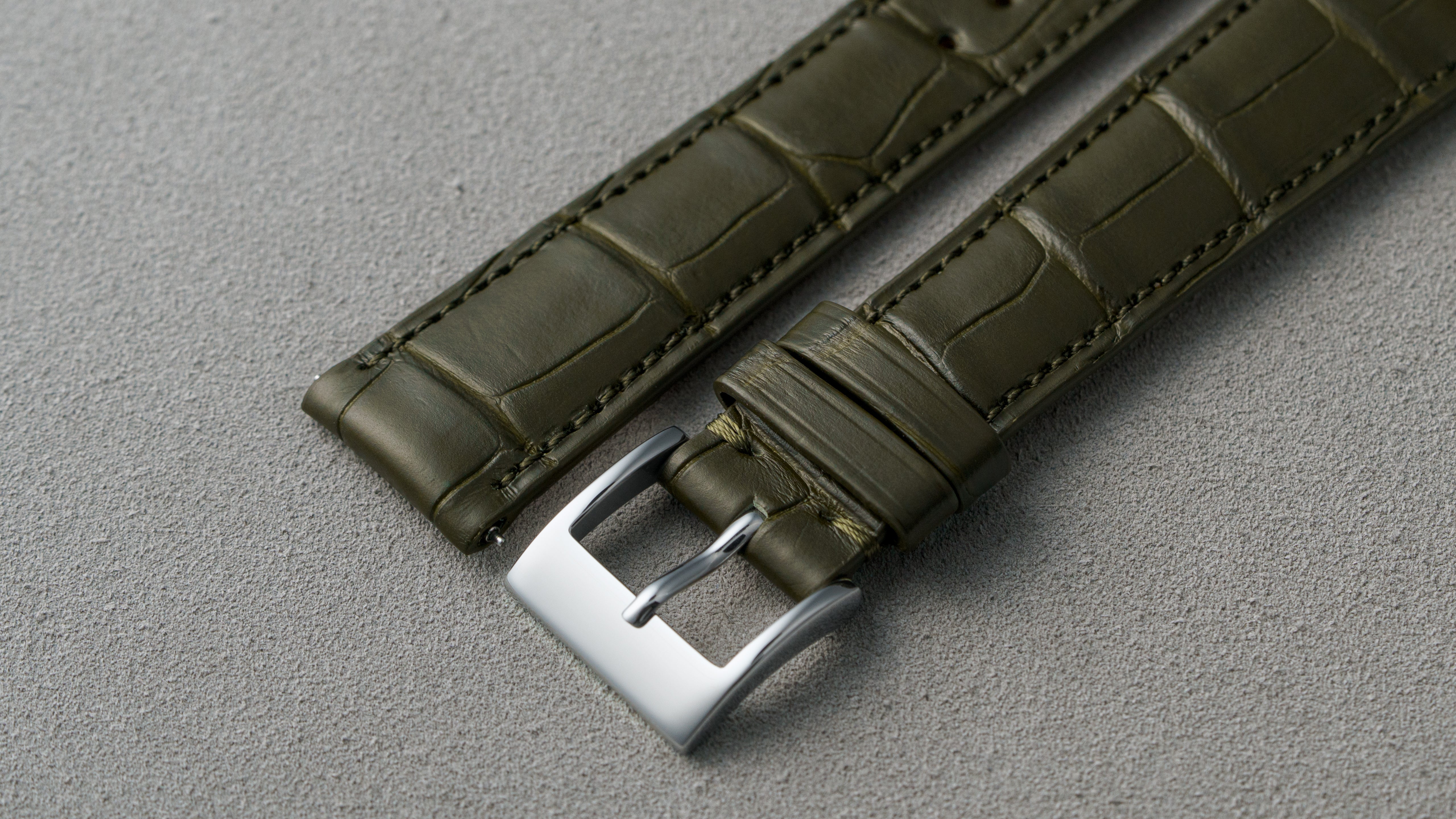 Inspired by one of the rarest Rolexes stone dials of the 1980s, our Jasper Green alligator strap is designed to capture the unique viridescent tone of its Day-Date namesake. While the tone of Jasper dials can vary greatly depending on lighting and the stone itself, the Jasper Green Strap captures the moodier dark veins present near the vein intersections of the material. A neutral but refined green, our Jasper alligator captures the more adventurous side of Rolex, but a more restrained and formal side of green.