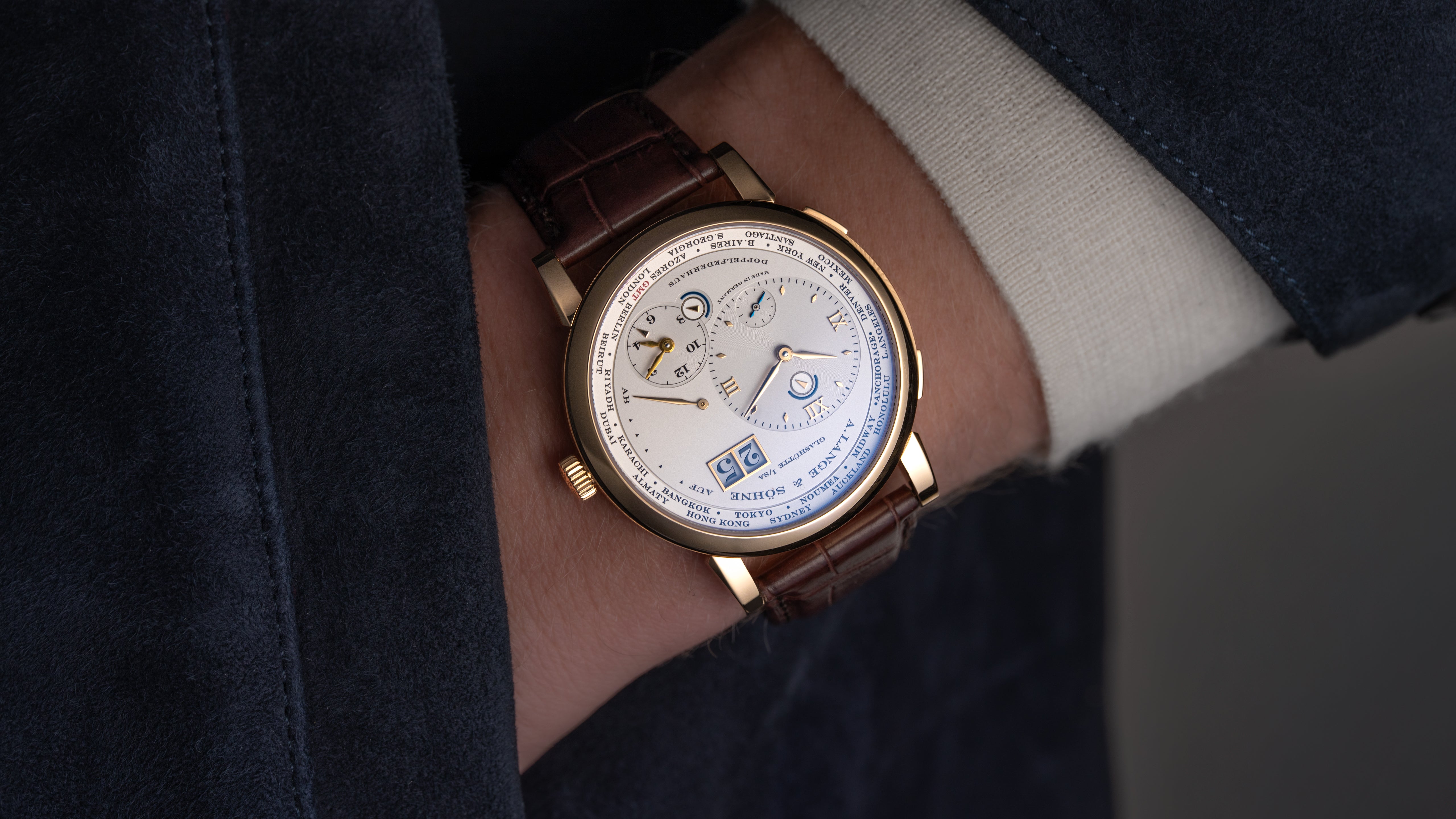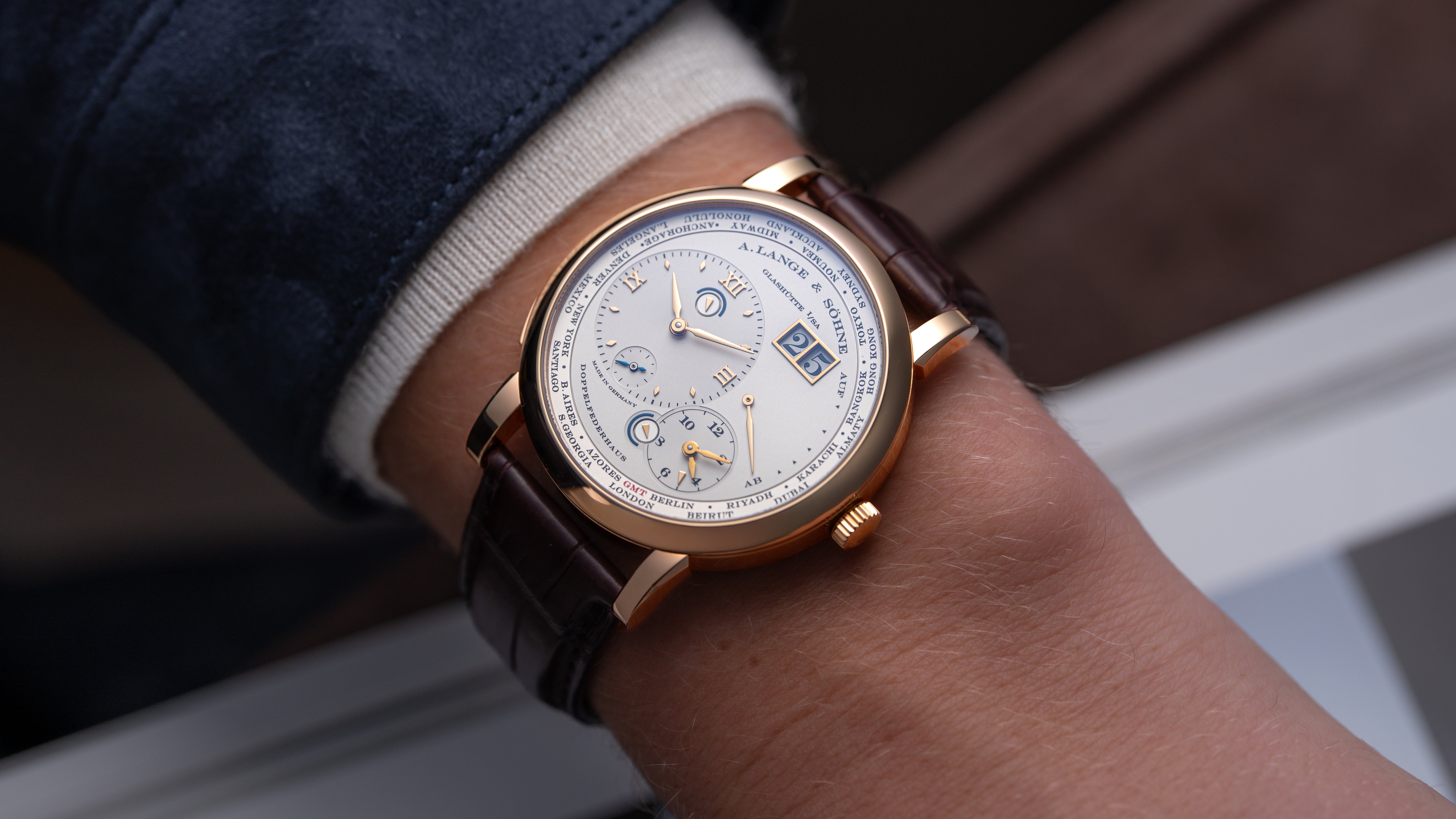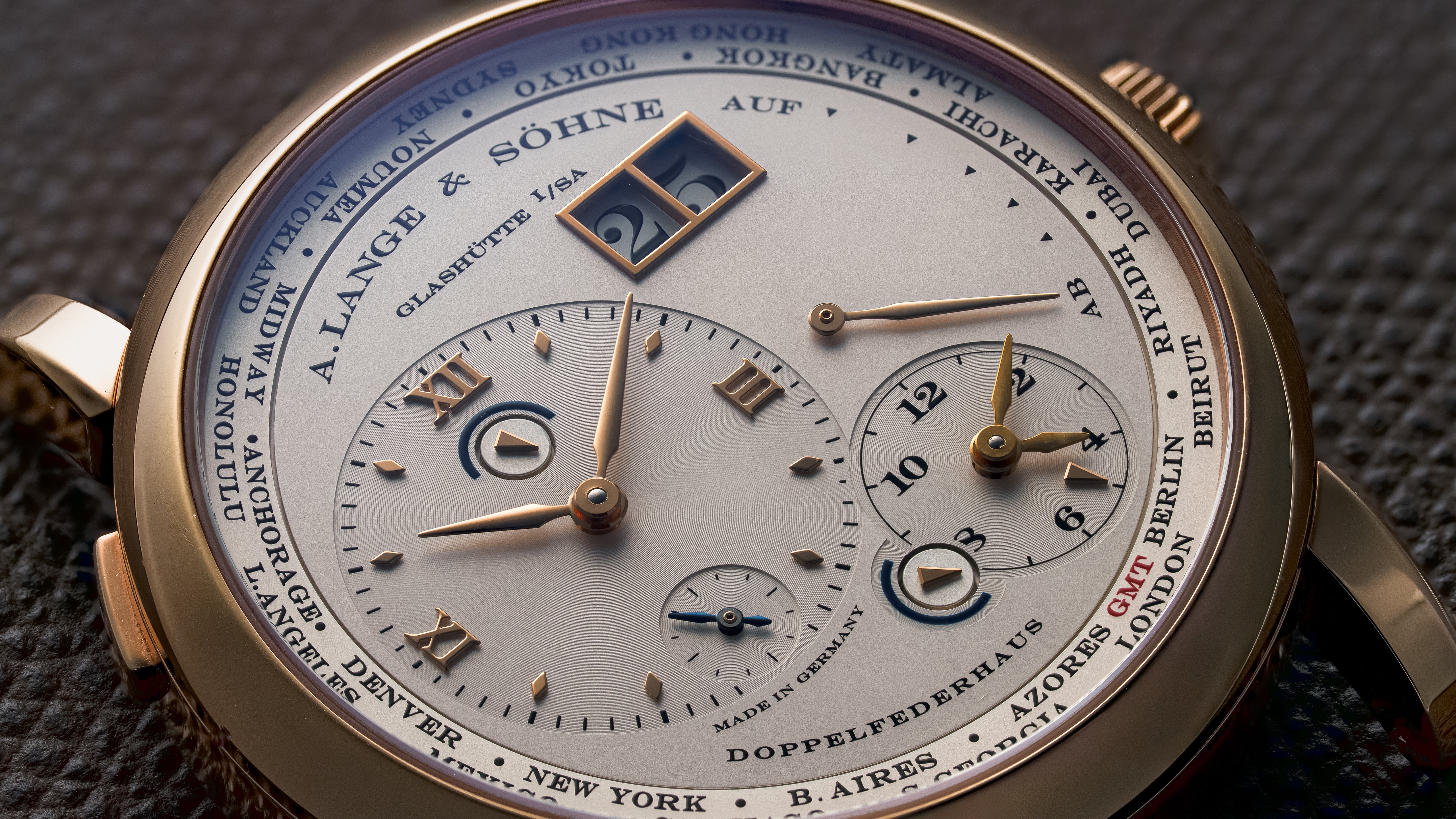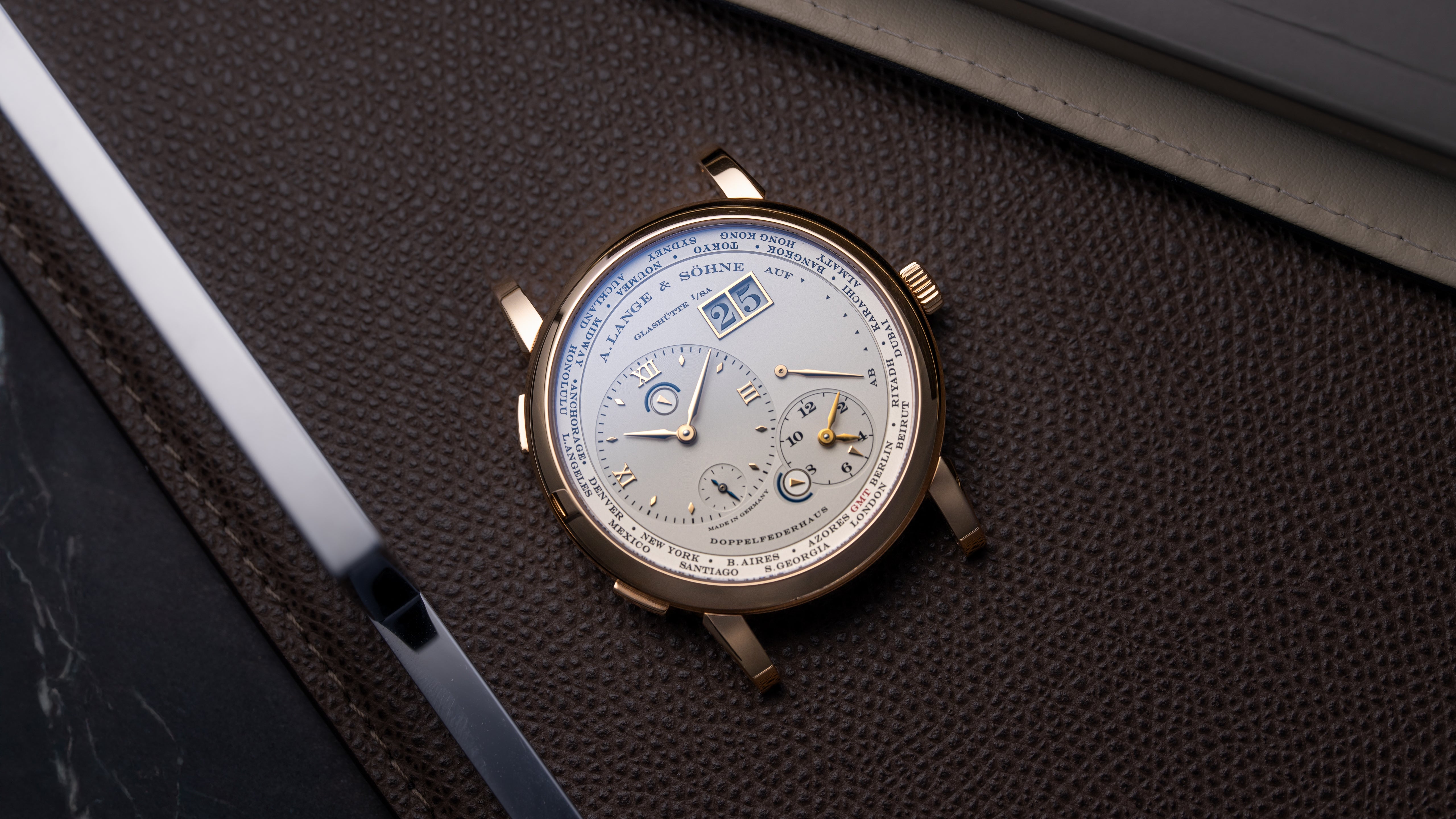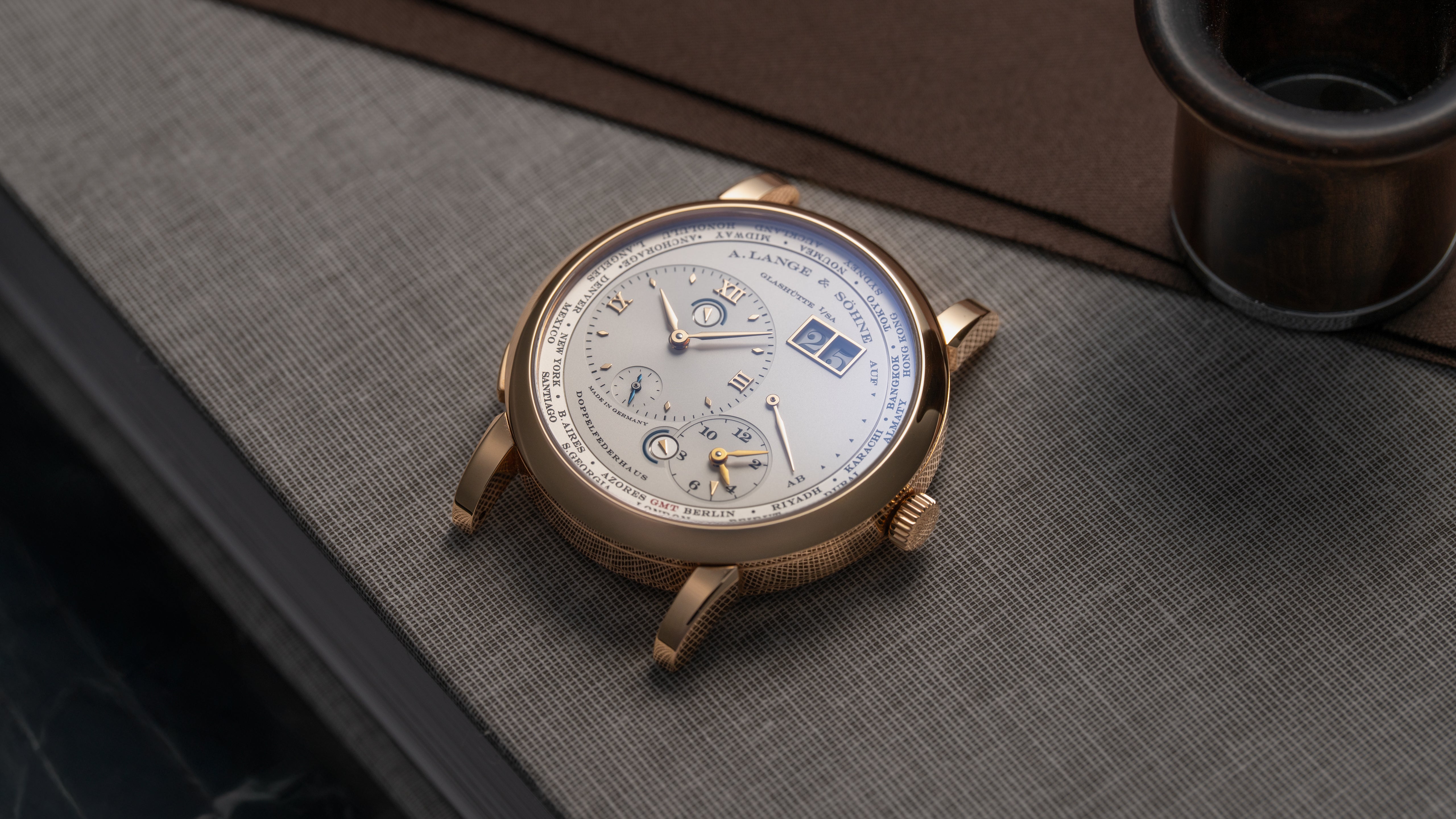 A ref. 116.032 Lange 1 Time Zone in pink gold, the third complication to be offered within the Lange 1 collection. The Lange 1’s asymmetric but geometrically defined dial design is in itself an embodiment of the teutonic principles that have guided the brand since its rebirth in 1994, here augmented to include an button-advancing second time zone display. While on the surface this may appear to be a trivial addition, the complication required development of a 417-component calibre. The Lange 1 Time Zone offers utilitarian and more sporting design without compromising those aspects that make the original Lange 1 beloved.
