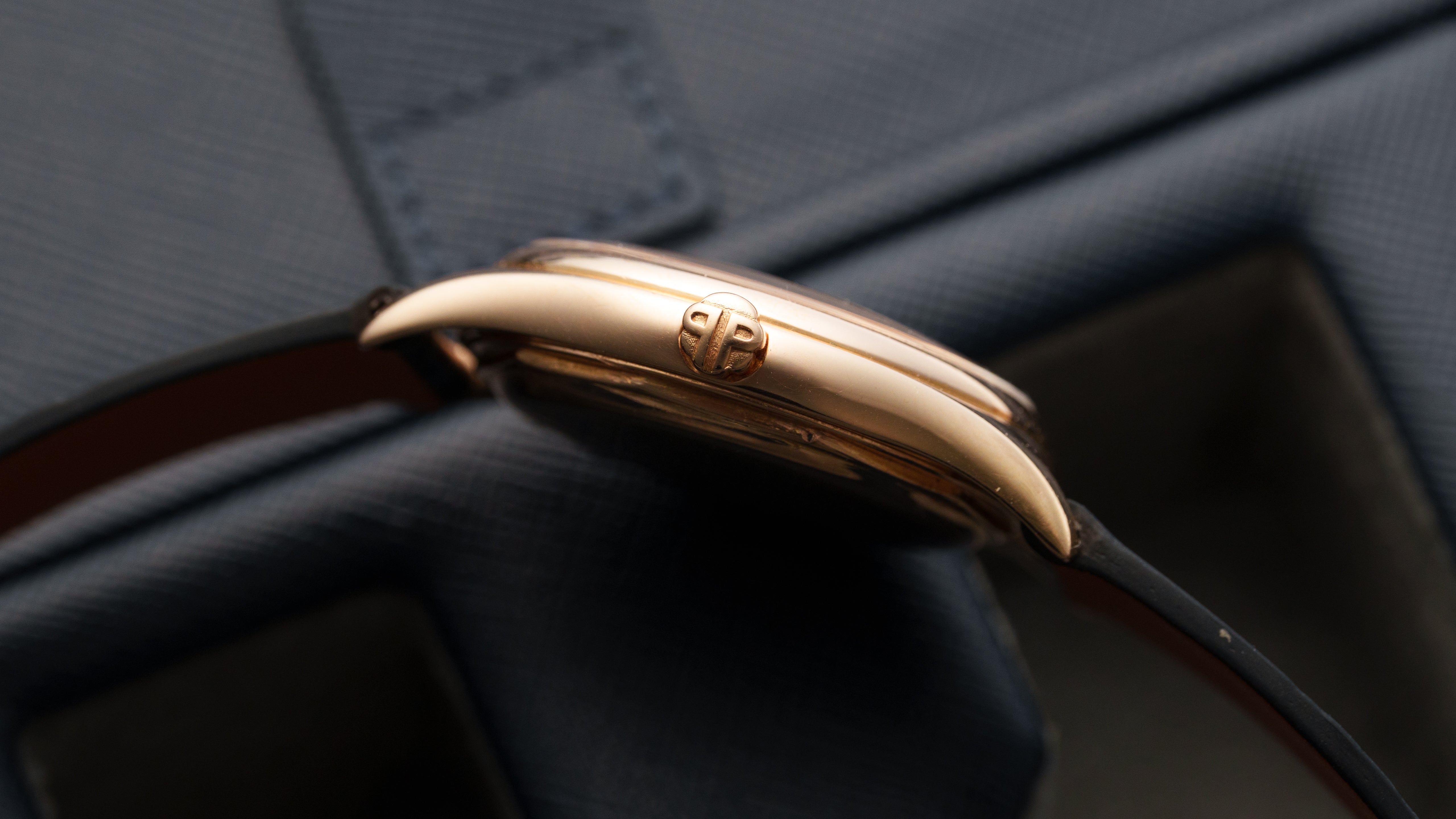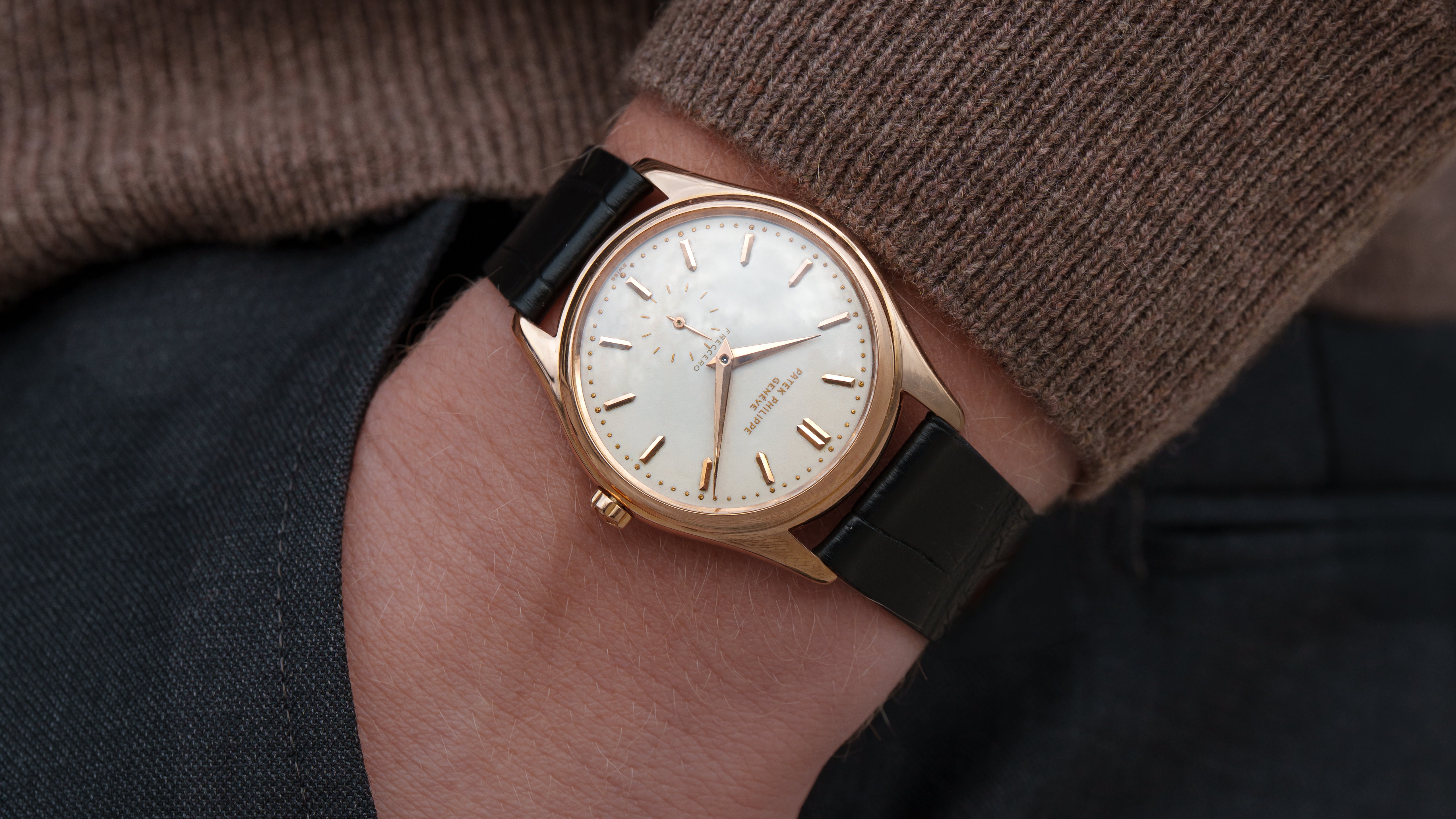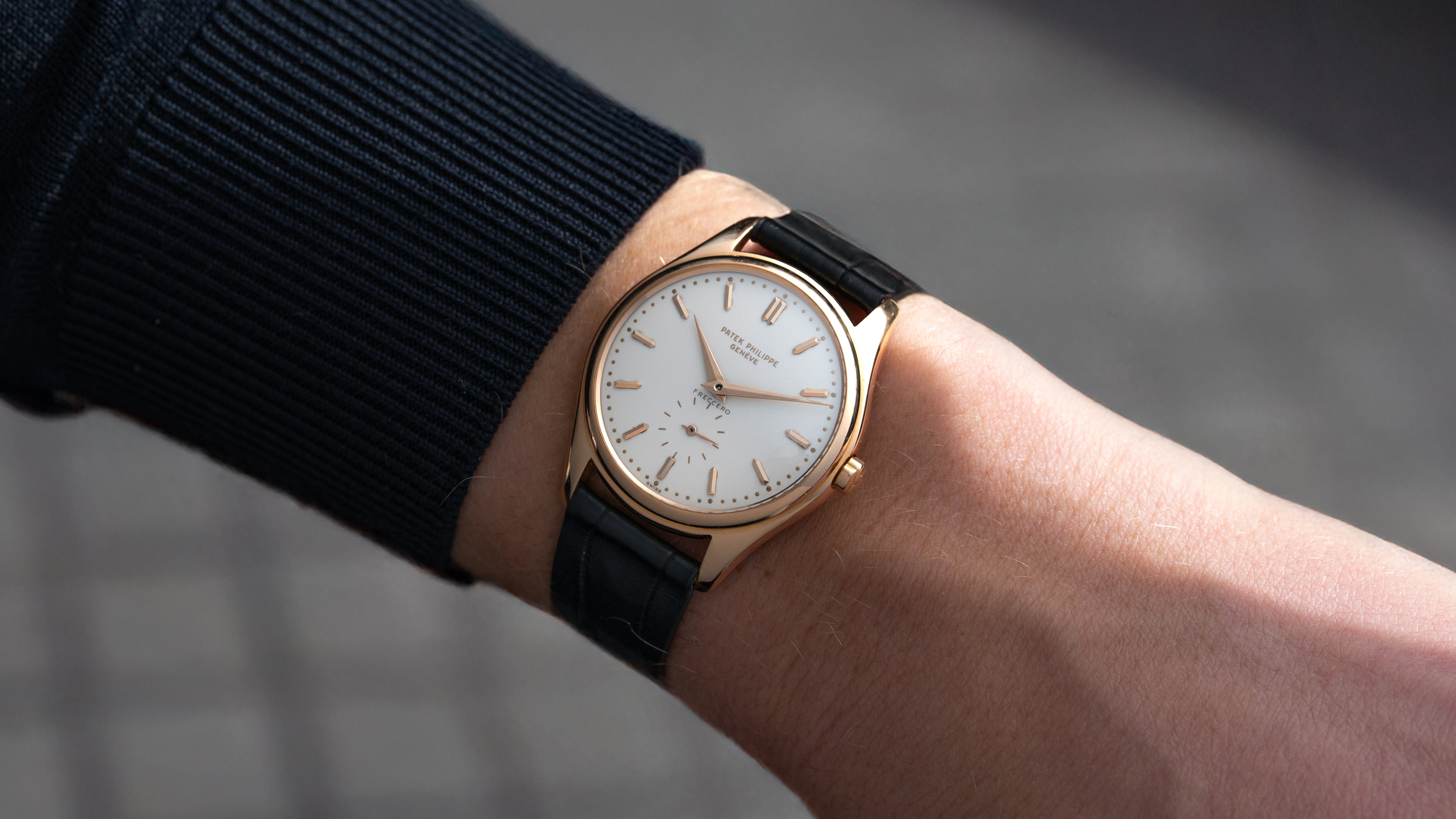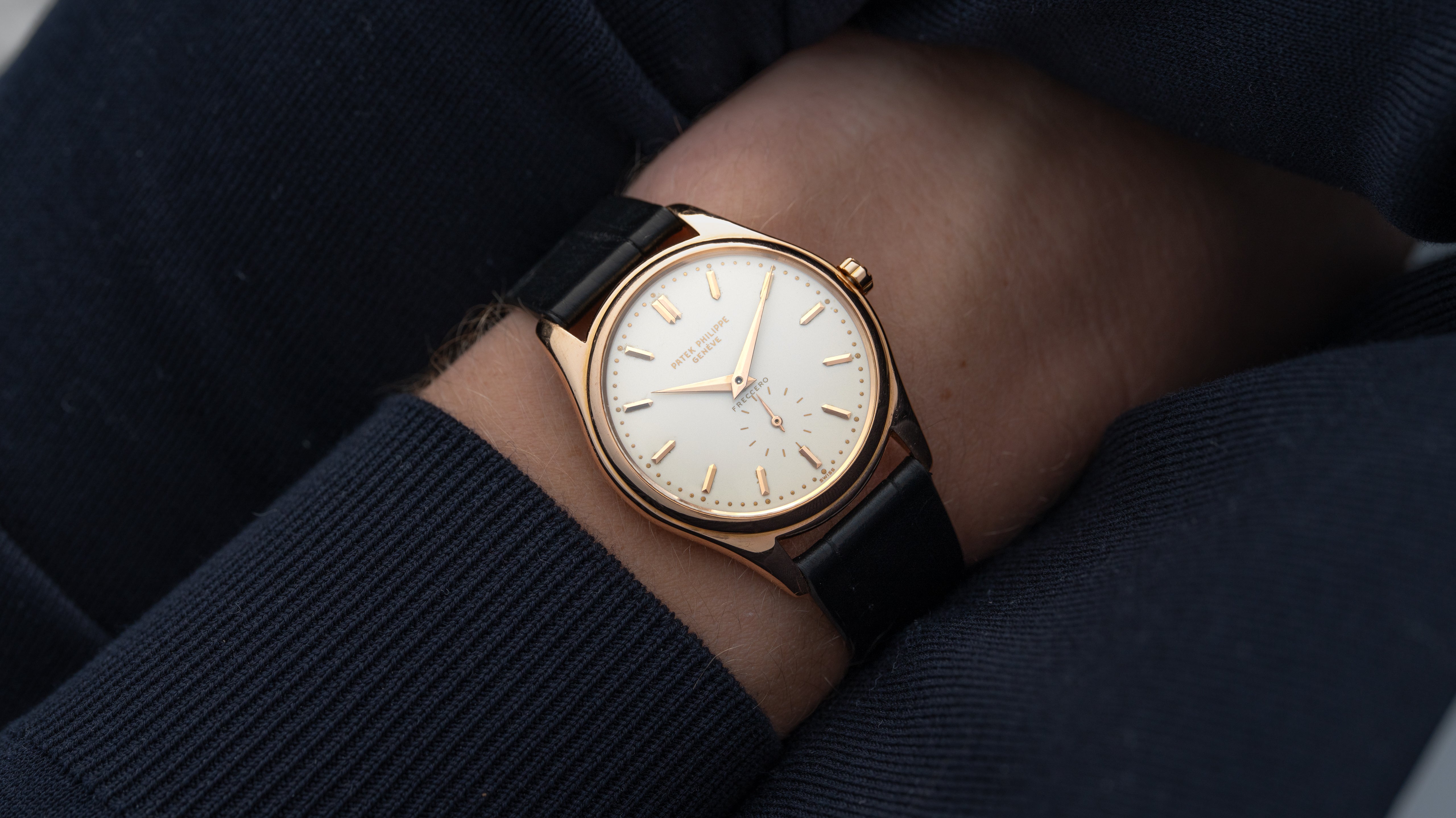 A ref. 2526R Calatrava with double signed Freccero first series enamel dial. During production of the 2526 in the 1950s enamel dials were standard practice but Patek now reserves the process only for special editions. The Freccero signature, a prominent Uruguayan retailer, adds additional context to this example’s personal history. It features Patek’s first ever automatic calibre, 12-600 AT, and potentially the first movement with engraving on its 18k rotor. Its technical significance was so great that at the time of its release, the list price was comparable to that of a 2499. The 2526 is classic Calatrava aesthetics with a movement many still consider to be the greatest ever time-only calibre.