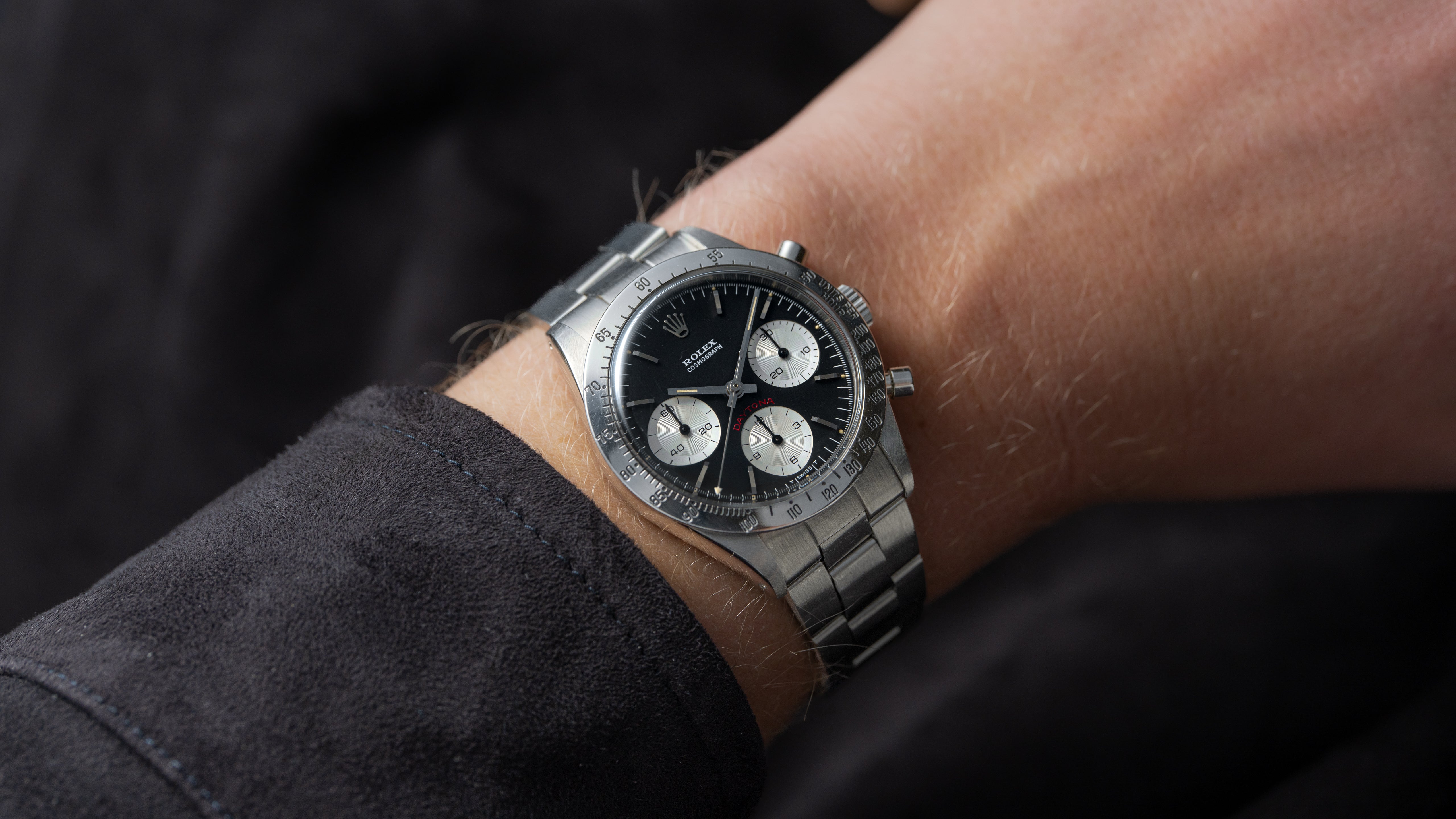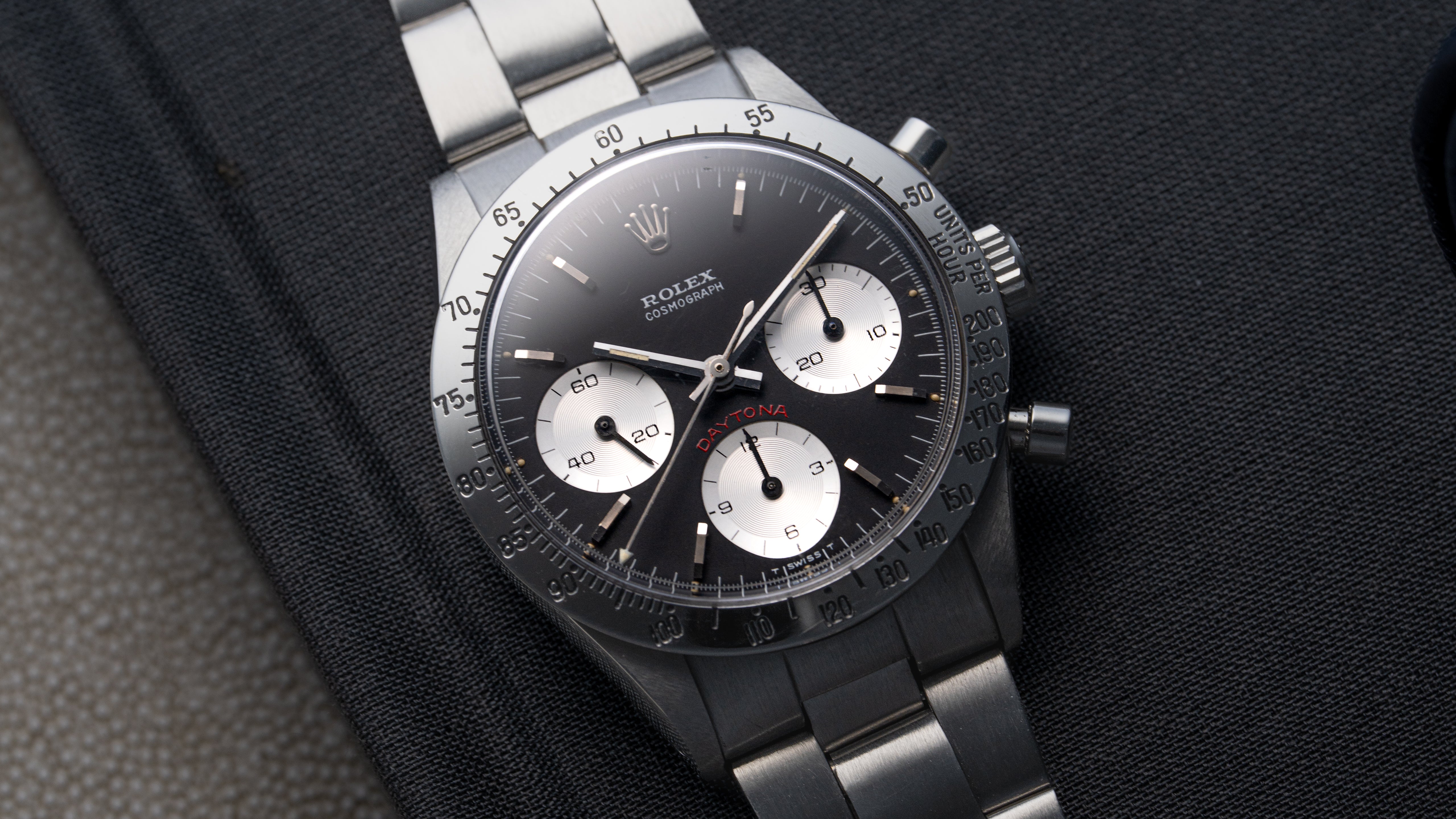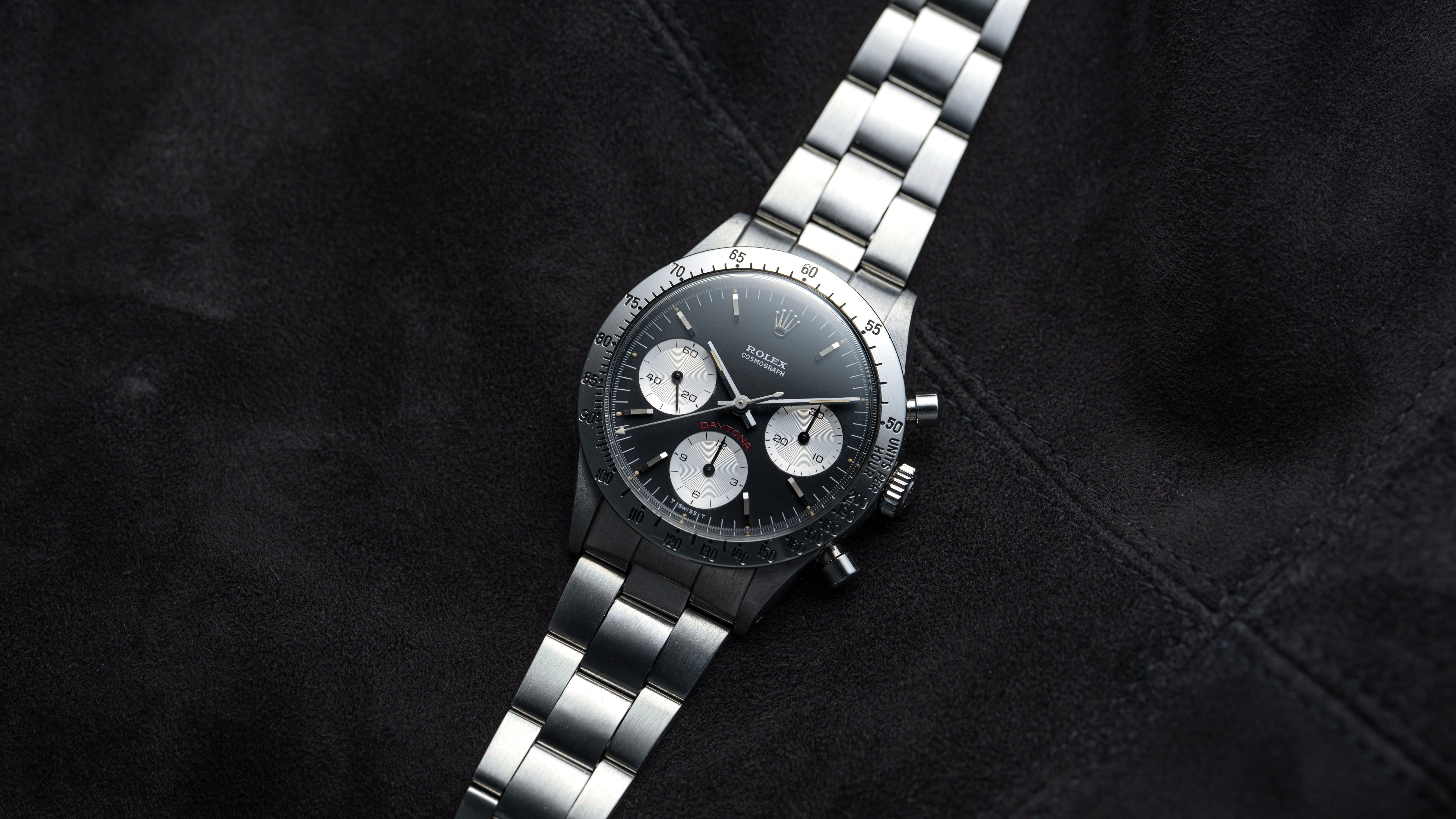A ref. 6239 Daytona with uncommon ‘Cherry’ dial, so named for the tone of the red Daytona text above the 6 o’clock subregister. The 6239 marked the birth of the Daytona in 1963, bringing the tachymeter track outside the dial to its steel bezel. Numerous dial variants were offered within the reference including ‘Cherry’ dials, the first use of red Daytona text. That aesthetic was passed down through the 6263/5 ‘Big Red’ Daytona, ultimately becoming almost archetypal for modern Daytona.