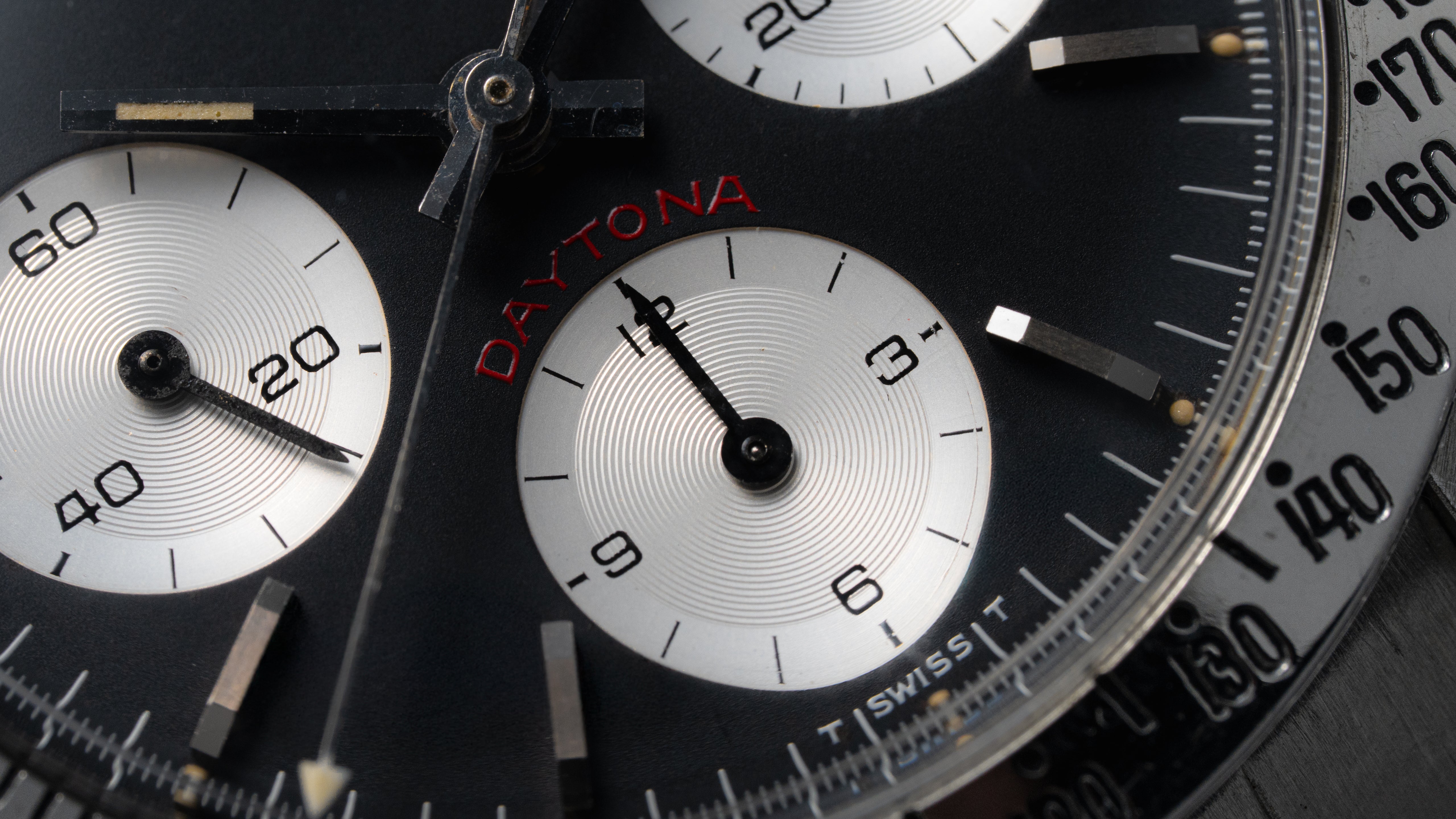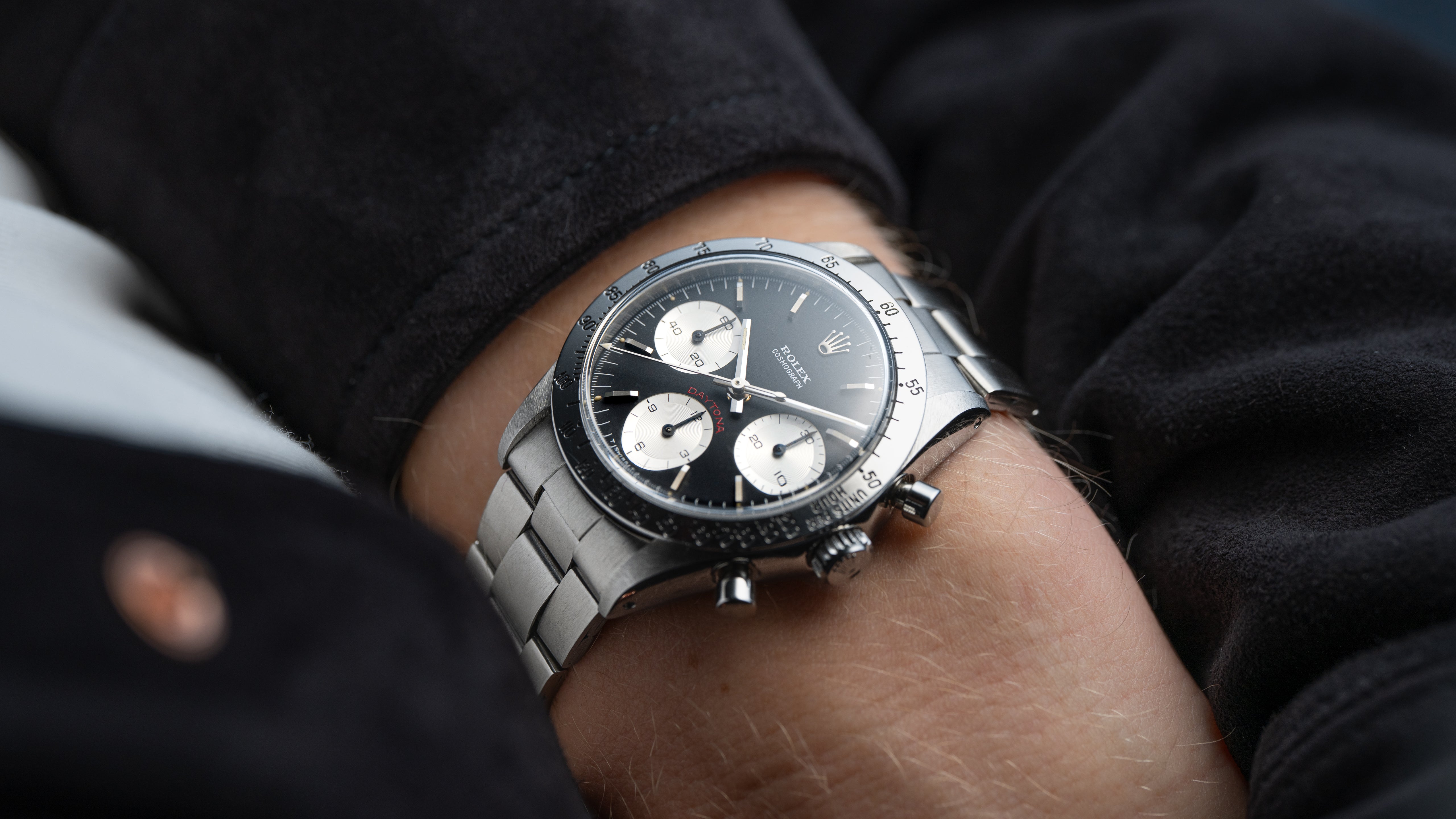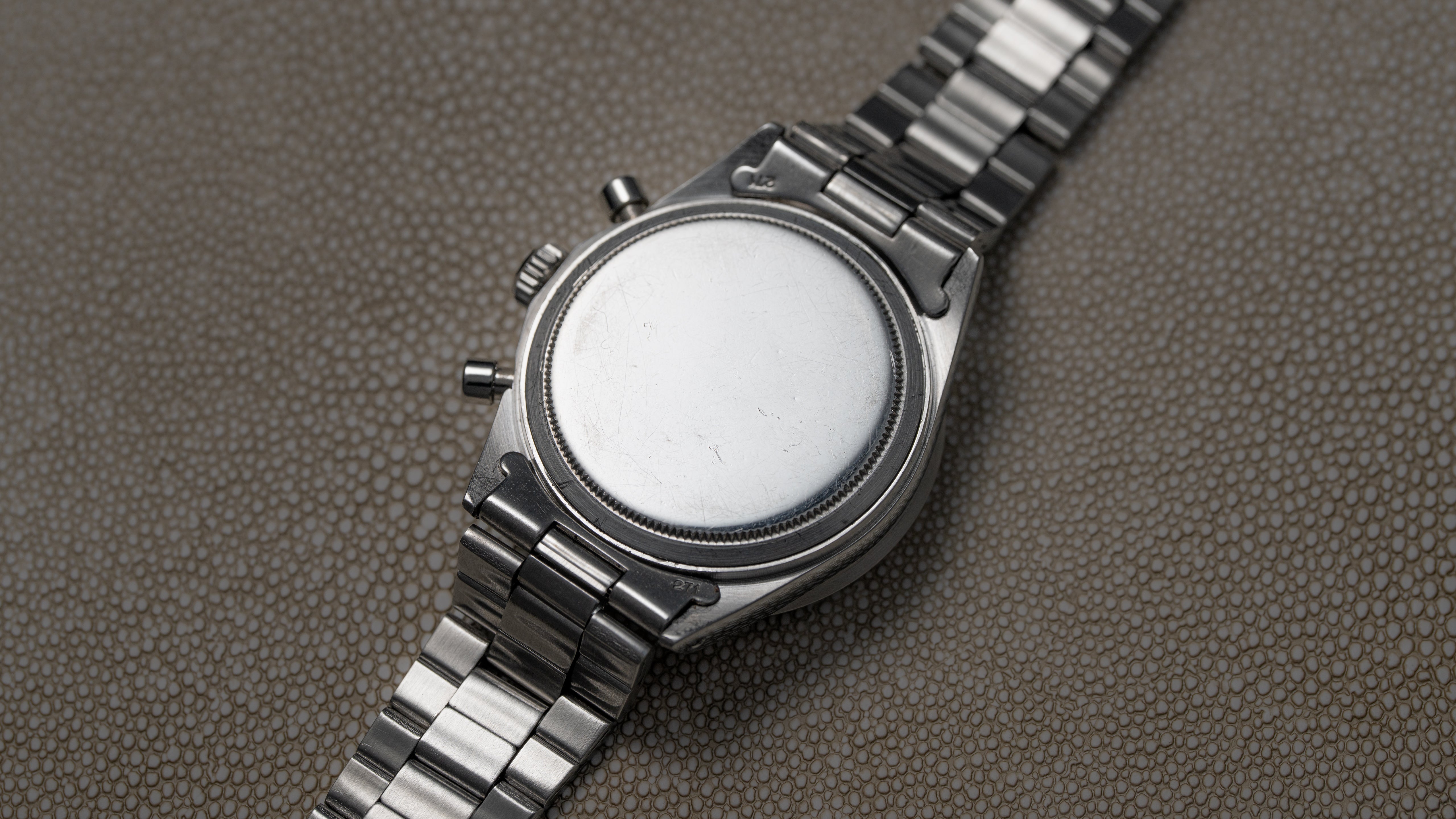 A ref. 6239 Daytona with uncommon ‘Cherry’ dial, so named for the tone of the red Daytona text above the 6 o’clock subregister. The 6239 marked the birth of the Daytona in 1963, bringing the tachymeter track outside the dial to its steel bezel. Numerous dial variants were offered within the reference including ‘Cherry’ dials, the first use of red Daytona text. That aesthetic was passed down through the 6263/5 ‘Big Red’ Daytona, ultimately becoming almost archetypal for modern Daytona.