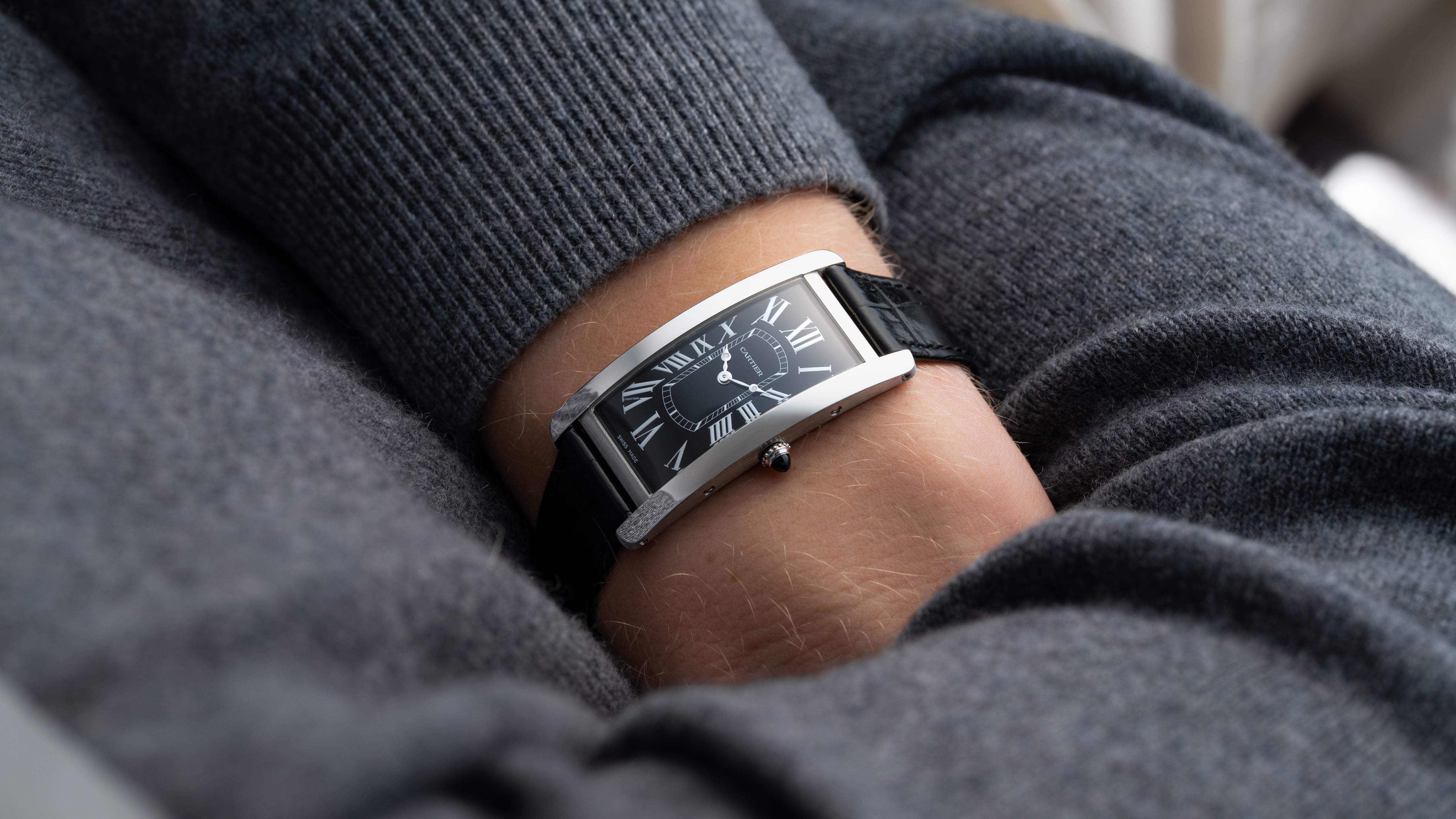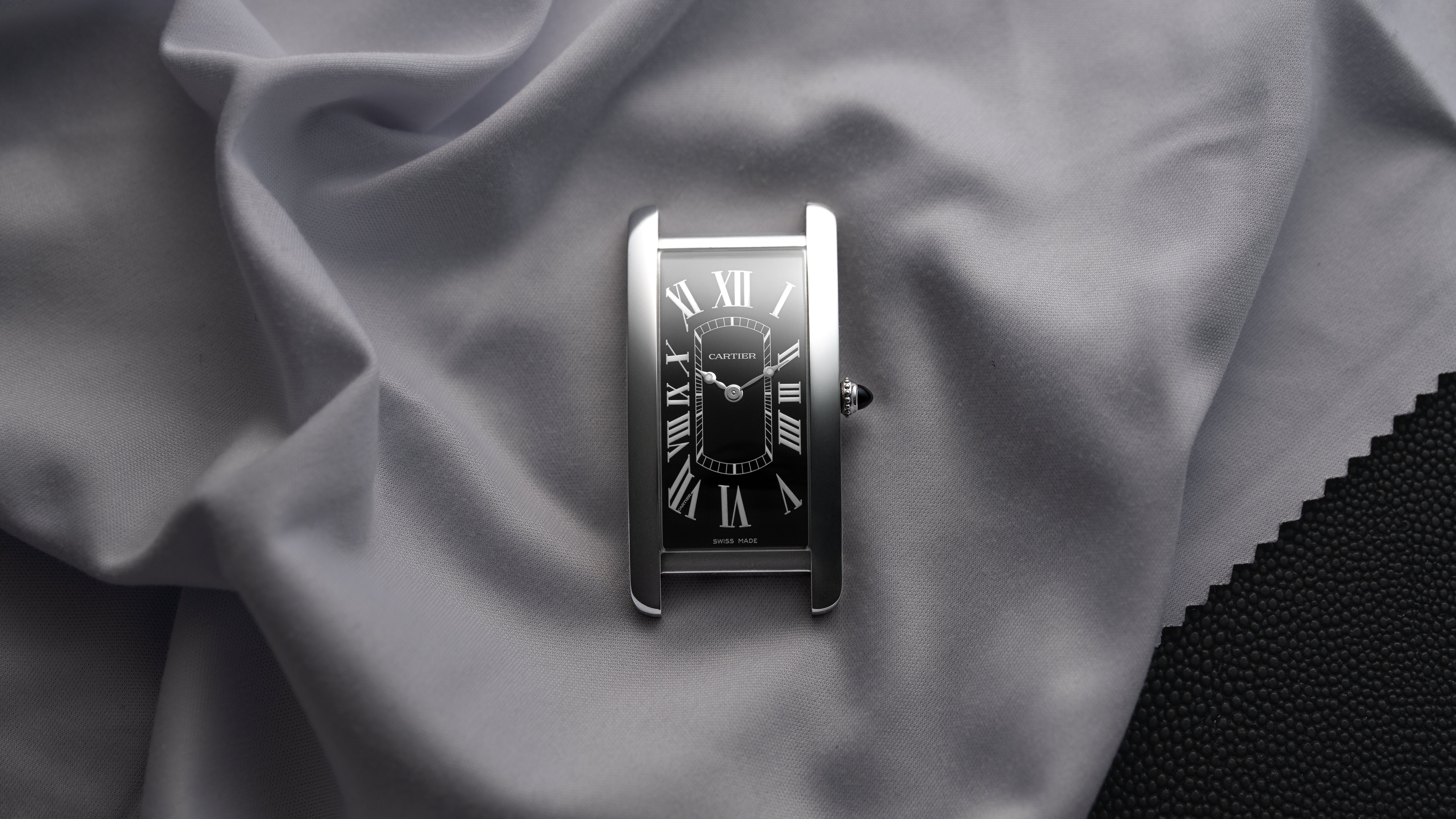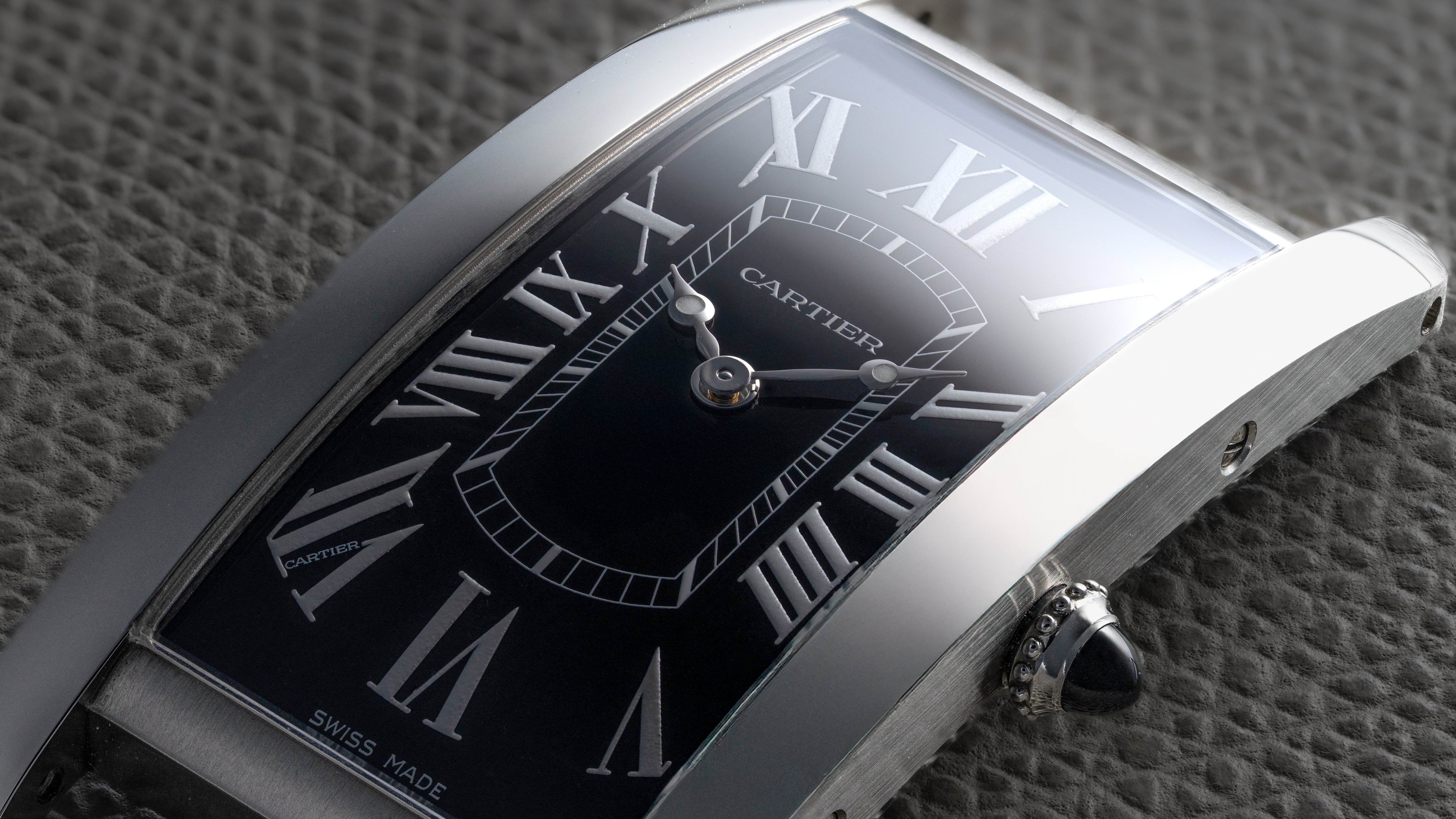 A Tank Cintrée NSO produced through Cartier’s New Special Order program for one of their top clients. The project spanned 3 years resulting in a bespoke configuration; it features a platinum case, luminous Roman numerals, luminous Breguet hands, black gloss dial, and matching bloodstone cabochon. While this particular Cintrée was the product of a custom project, its design is incredibly intentional and cohesive, a perfect balance of respect for the history of the Cintrée with a bold, austere, and potentially singular aesthetic.
