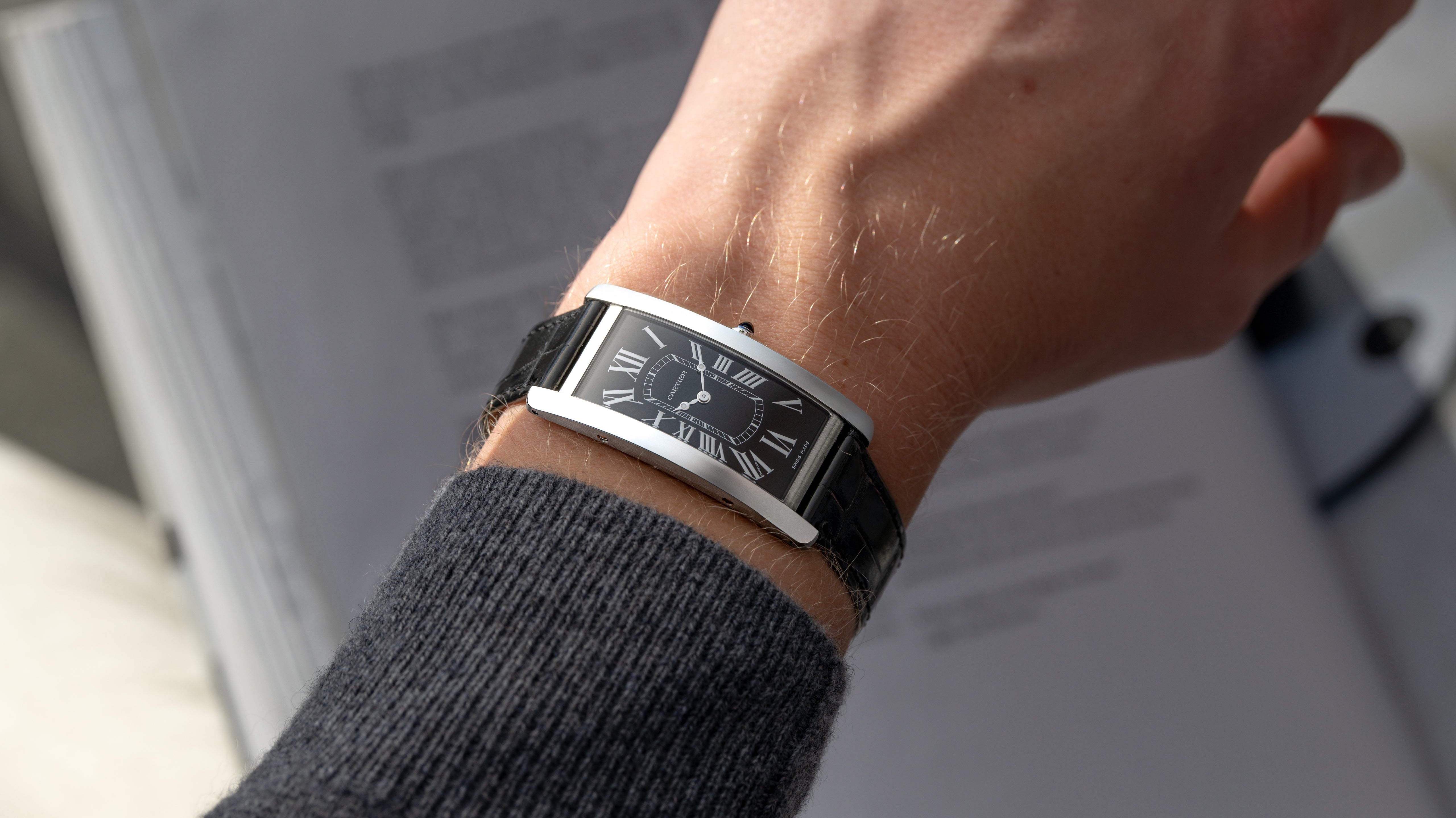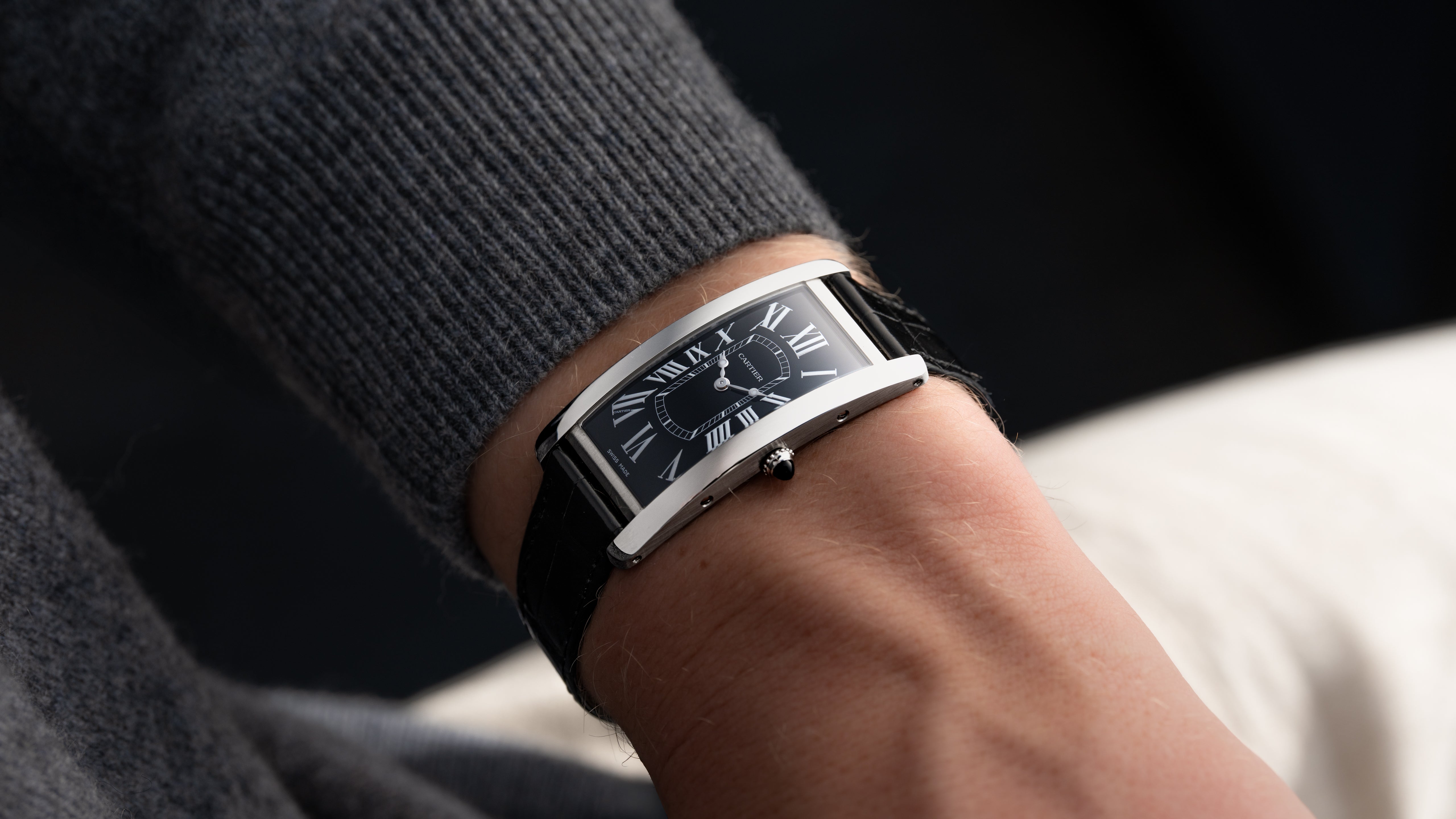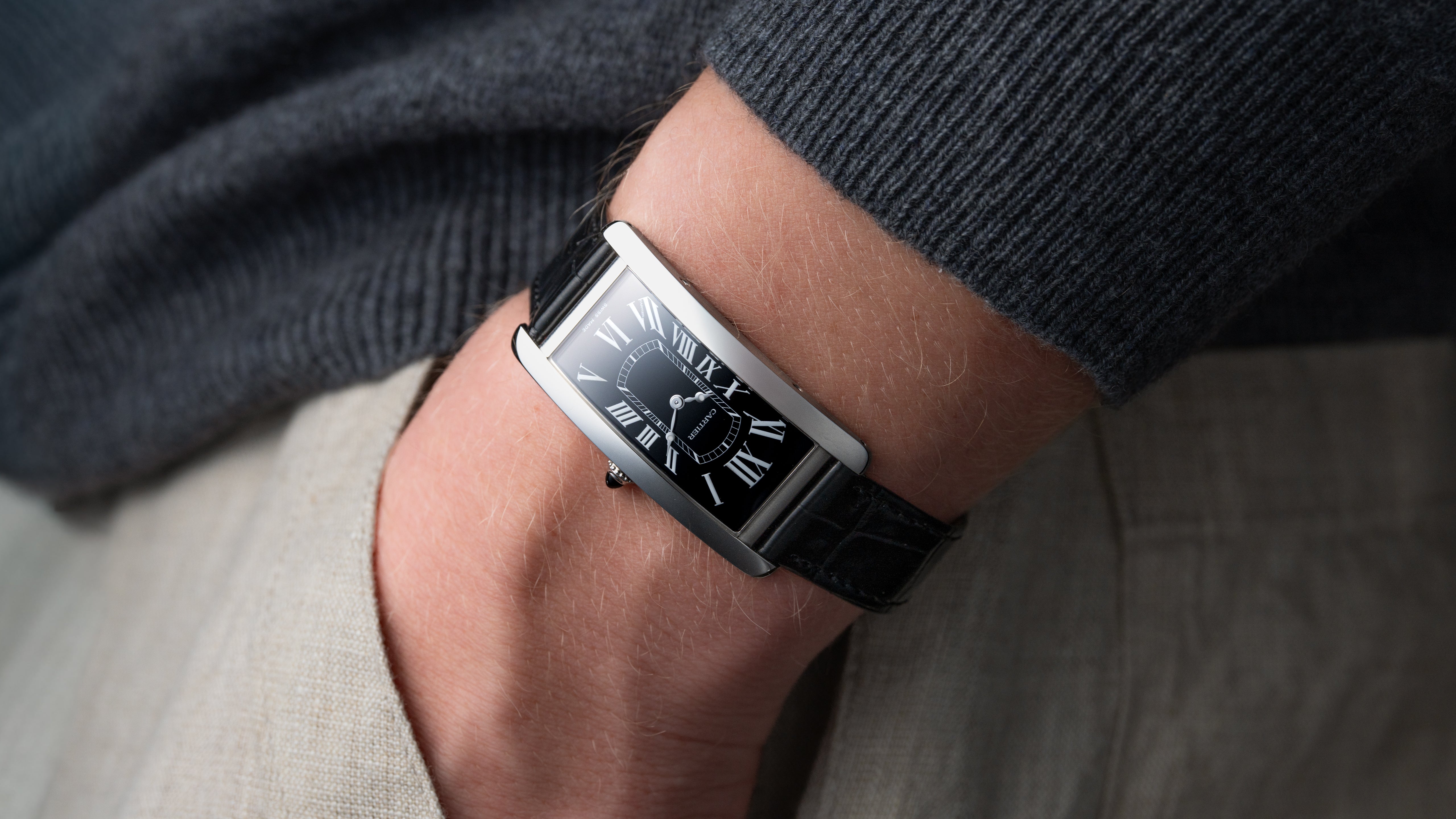 A Tank Cintrée NSO produced through Cartier’s New Special Order program for one of their top clients. The project spanned 3 years resulting in a bespoke configuration; it features a platinum case, luminous Roman numerals, luminous Breguet hands, black gloss dial, and matching bloodstone cabochon. While this particular Cintrée was the product of a custom project, its design is incredibly intentional and cohesive, a perfect balance of respect for the history of the Cintrée with a bold, austere, and potentially singular aesthetic.